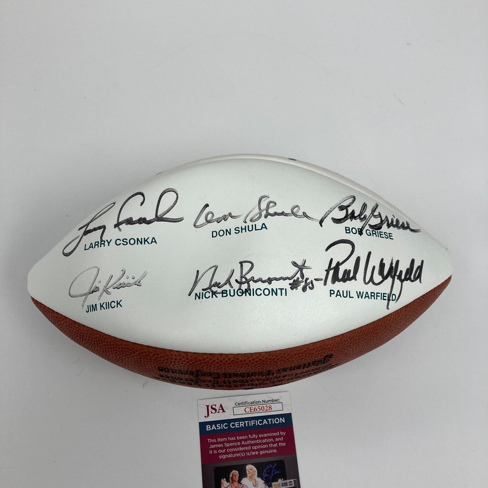 Miami Dolphins Legends multi-signed football. Wilson NFL Dolphins Legends white panel football signed by (6) including Don Shula, Nick Buoniconti, Bob Griese, Larry Csonka, Paul Warfield, and Jim Kiick. Comes with JSA COA.