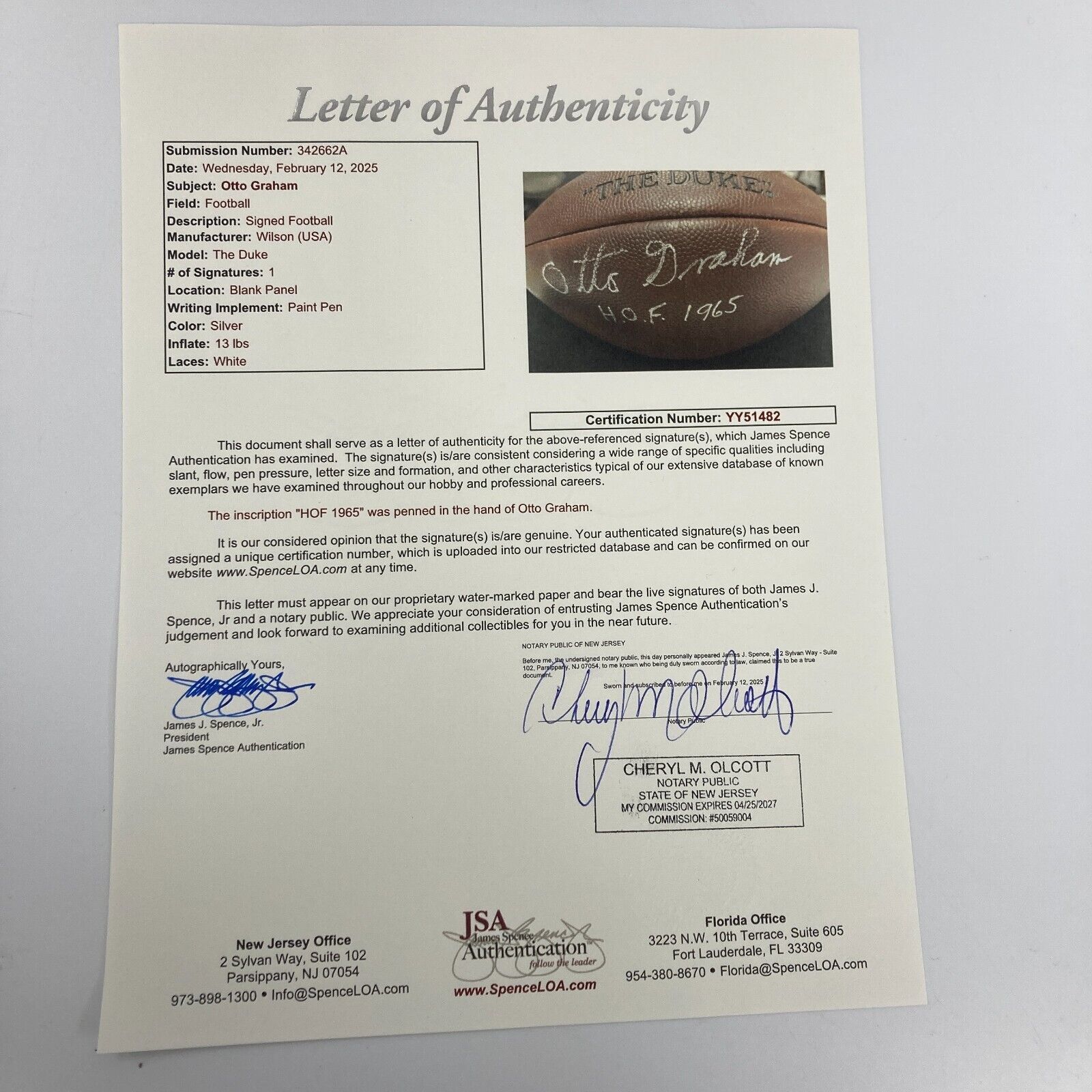 Click or scroll to zoom Tap or pinch to zoom Click or scroll to zoom Tap or pinch to zoom Click or scroll to zoom Tap or pinch to zoom Click or scroll to zoom Tap or pinch to zoom Click or scroll to zoom Tap or pinch to zoom Click or scroll to zoom Tap or pinch to zoom Otto Graham HOF 1965 Signed Wilson NFL Game Football JSA COA $799.00 1 2 3 4 5 6 7 8 9 10+ Quantity Quantity Add to cart This item is a recurring or deferred purchase. By continuing, I agree to the cancellation policy and authorize you to charge my payment method at the prices, frequency and dates listed on this page until my order is fulfilled or I cancel, if permitted. Otto Graham HOF 1965 Signed Wilson NFL Game Football JSA COAComes with full letter JSA COA. Bag #15