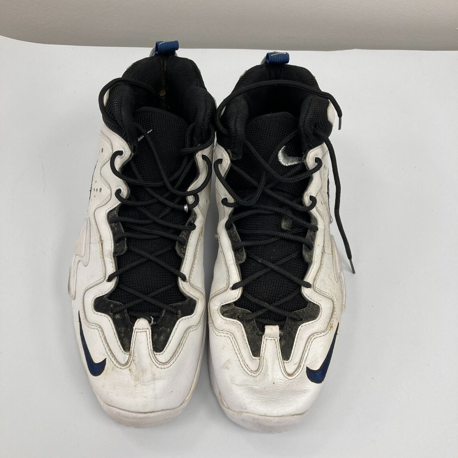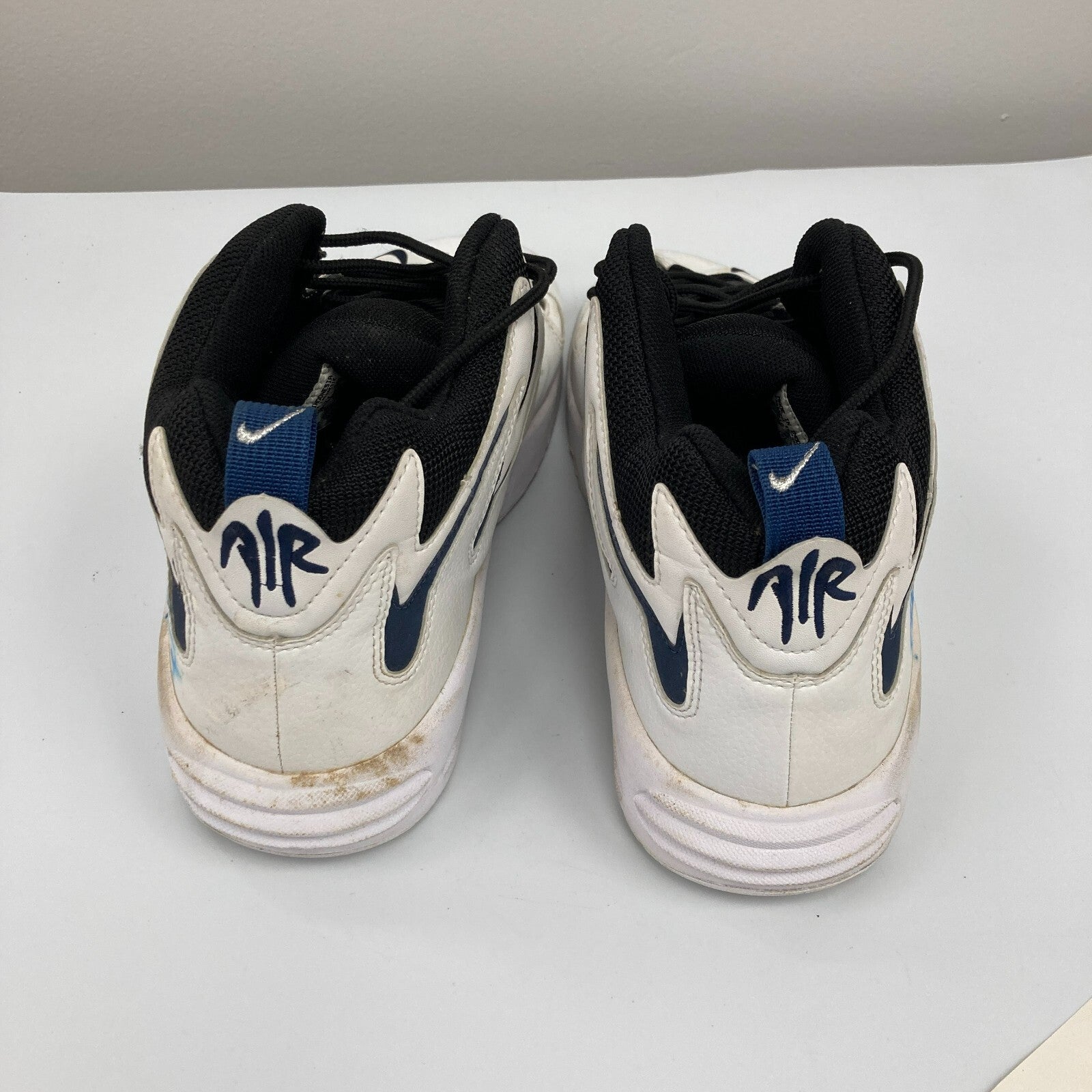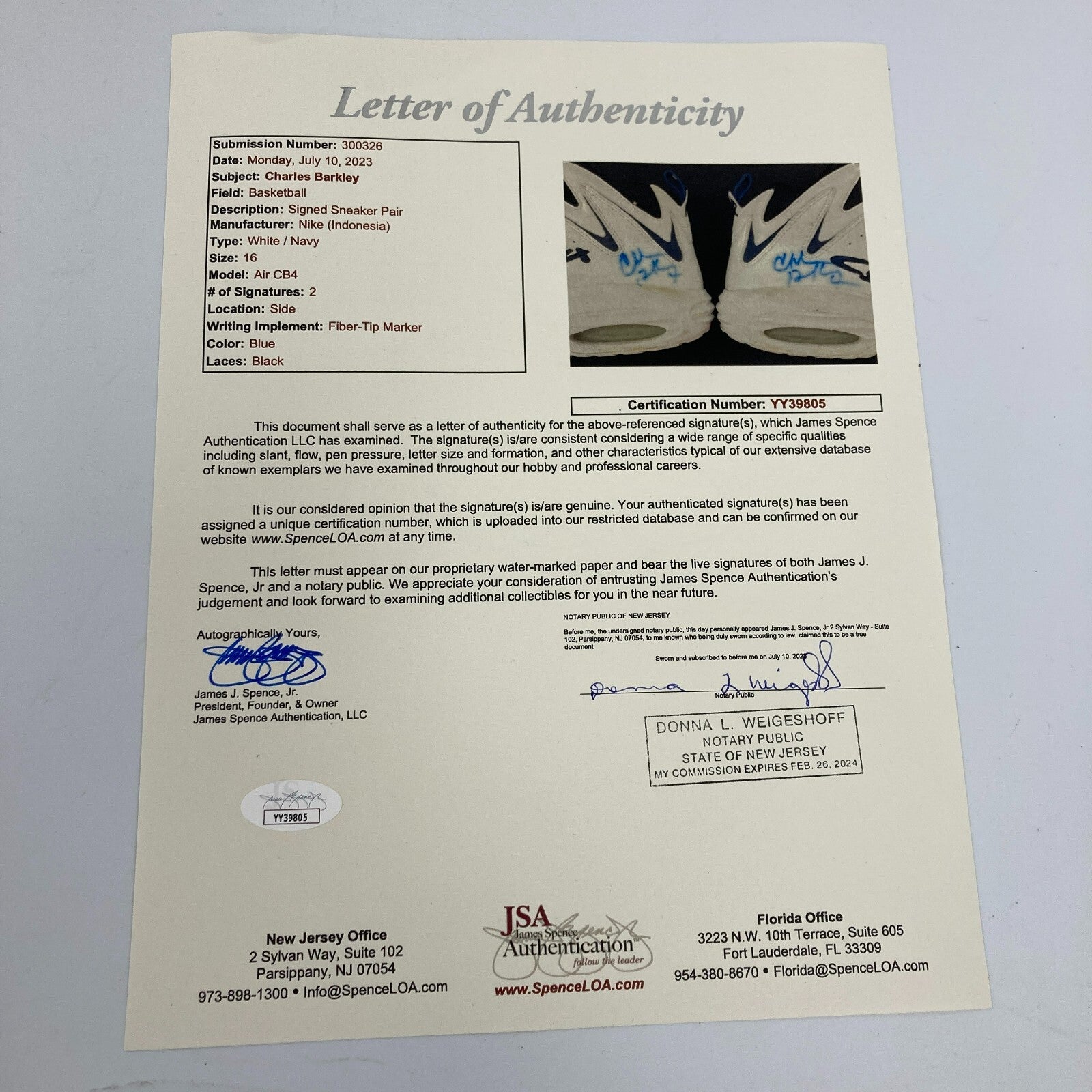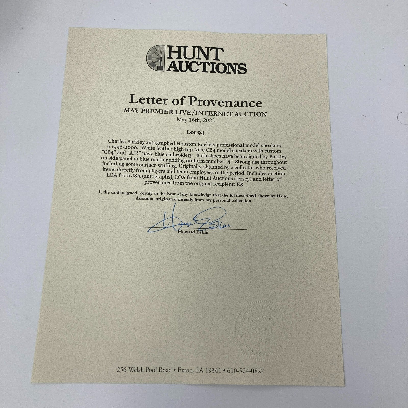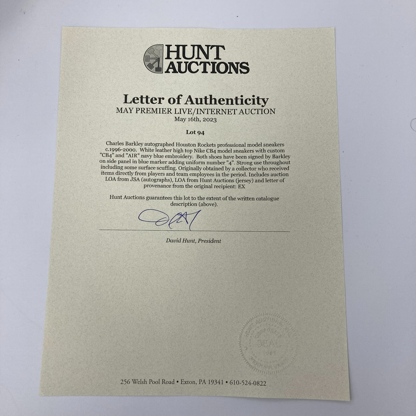 Charles Barkley autographed Houston Rockets professional model game used sneakers c.1996-2000. White leather high top Nike CB4 model sneakers with custom "CB4" and "AIR" navy blue embroidery. Both shoes have been signed by Barkley on side panel in blue marker adding uniform number "4". Strong use throughout including some surface scuffing. Originally obtained by a collector who received items directly from players and team employees in the period. Includes LOA from JSA (autographs), LOA from Hunt Auctions (jersey) and letter of provenance from the original recipient.