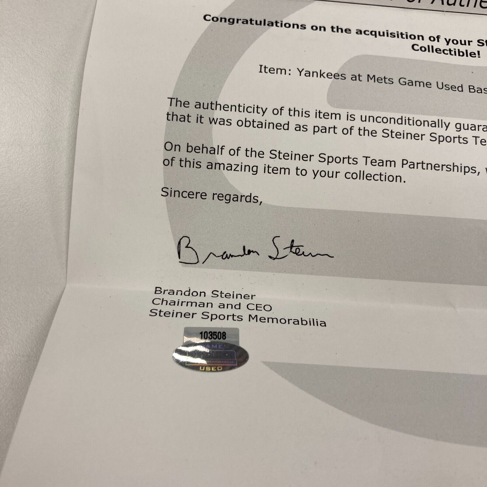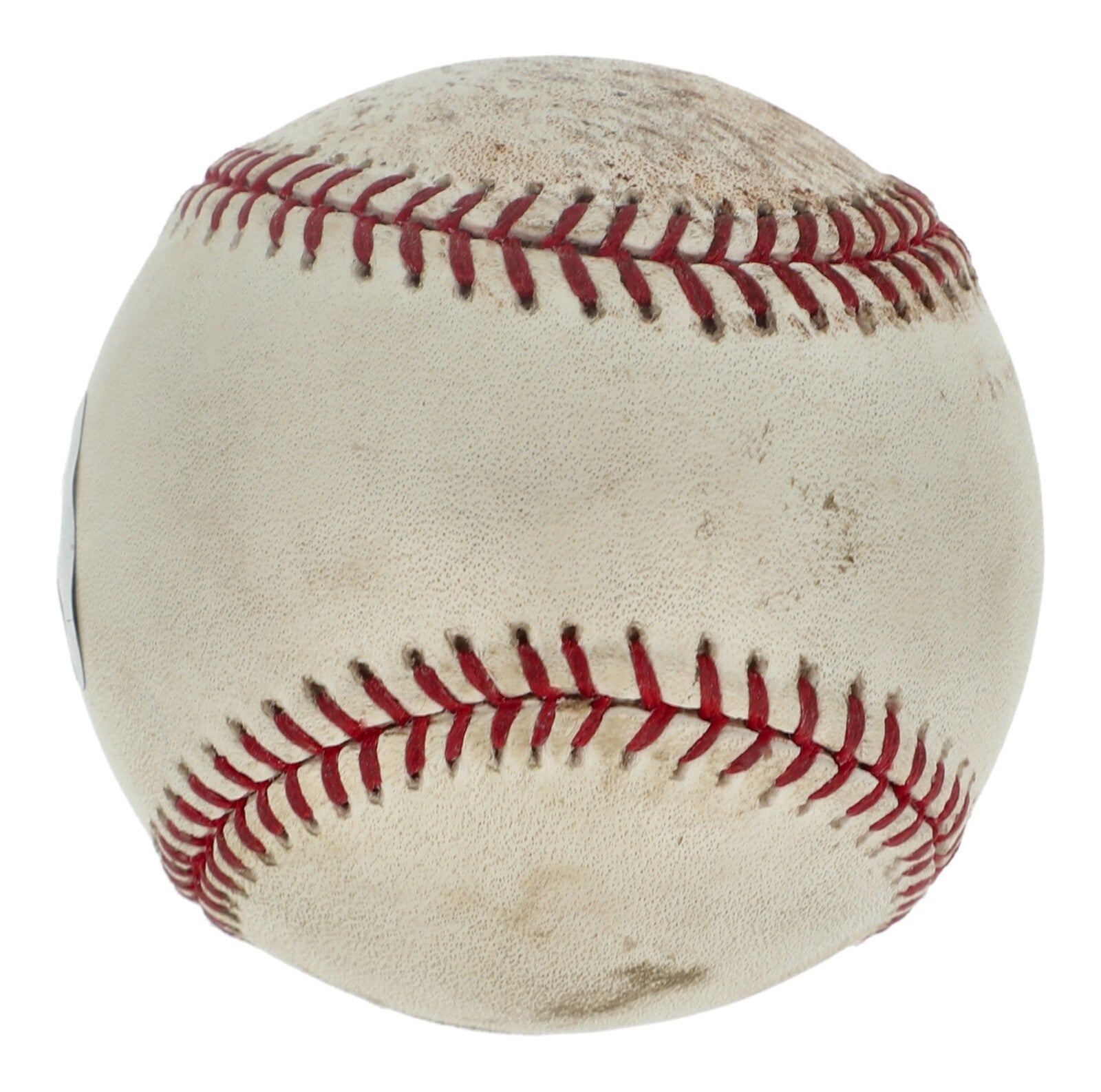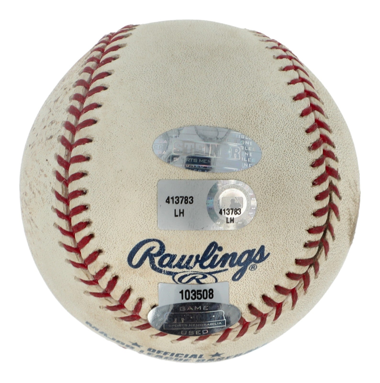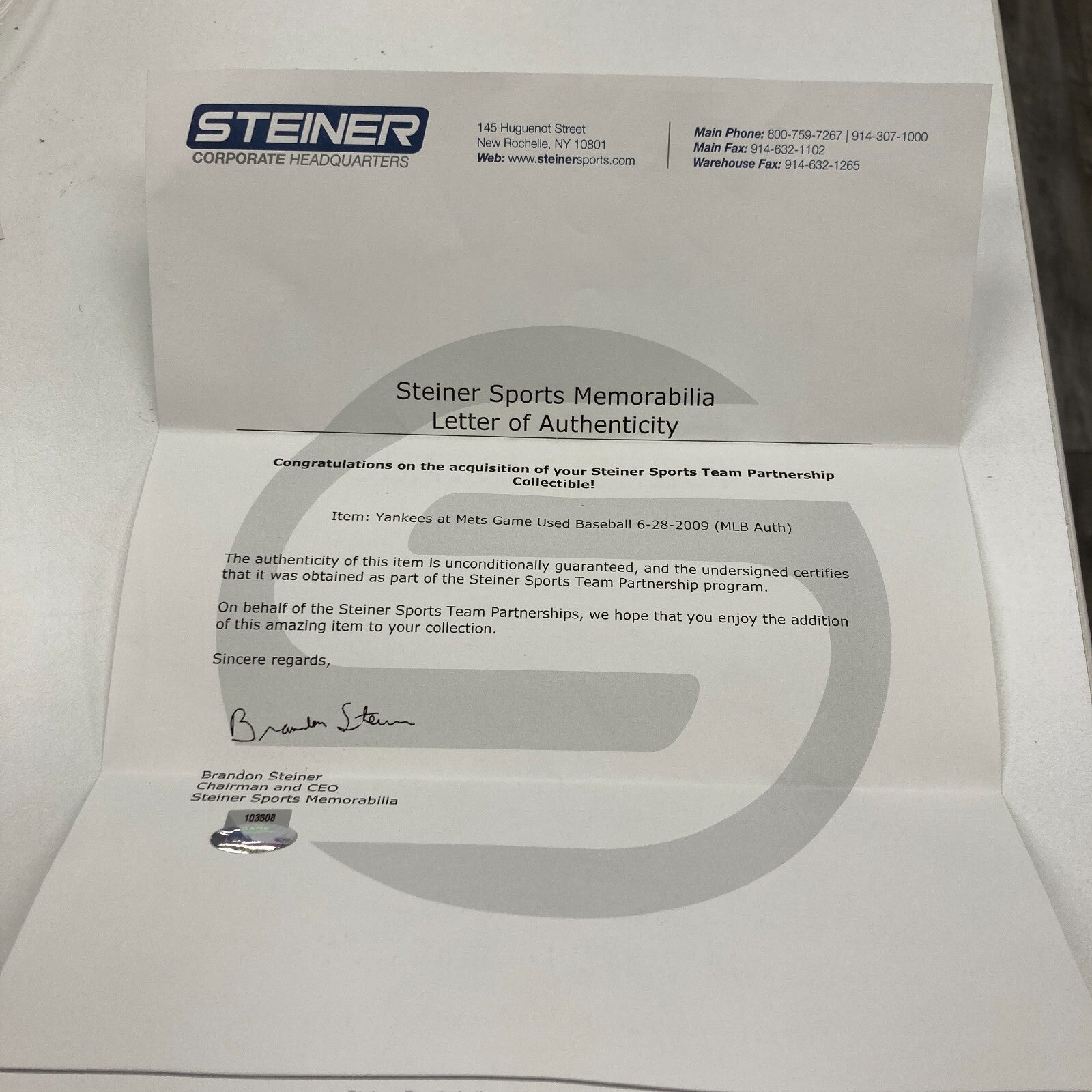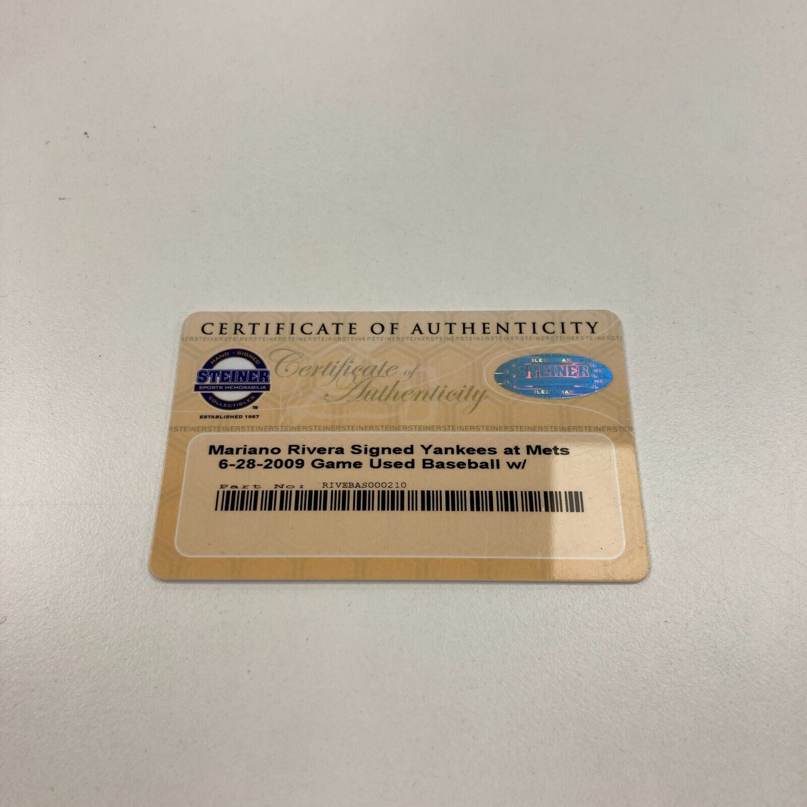 Presented is an Official Major League baseball used between the New York Yankees and New York Mets on June 28, 2009, the game Mariano Rivera recorded his 500th career save. Rivera delivered a scoreless 1.1 innings in the 4-2 victory, striking out two batters and yielding only a single hit in his outing. The offered baseball has been signed by Rivera, who has penned his flowing signature in blue ink across the panel south of the baseball's official commissioner stamp; the panel containing Rivera's signature also includes a "2009 INAUGURAL SEASON" stamp and an inscription from Rivera that reads "500th Save 6/28/09." The baseball displays several instances of staining, including dirt staining, throughout. Affixed to the item is an MLB Authenticated Hologram (LH413783) for game use, plus a pair of COAs from Steiner (103508) for game use and for signature.
