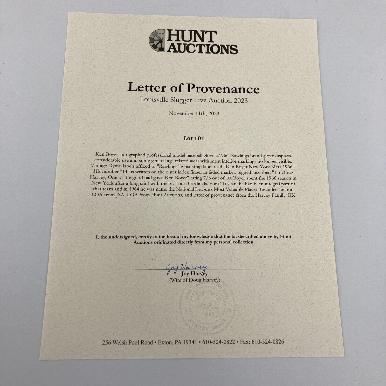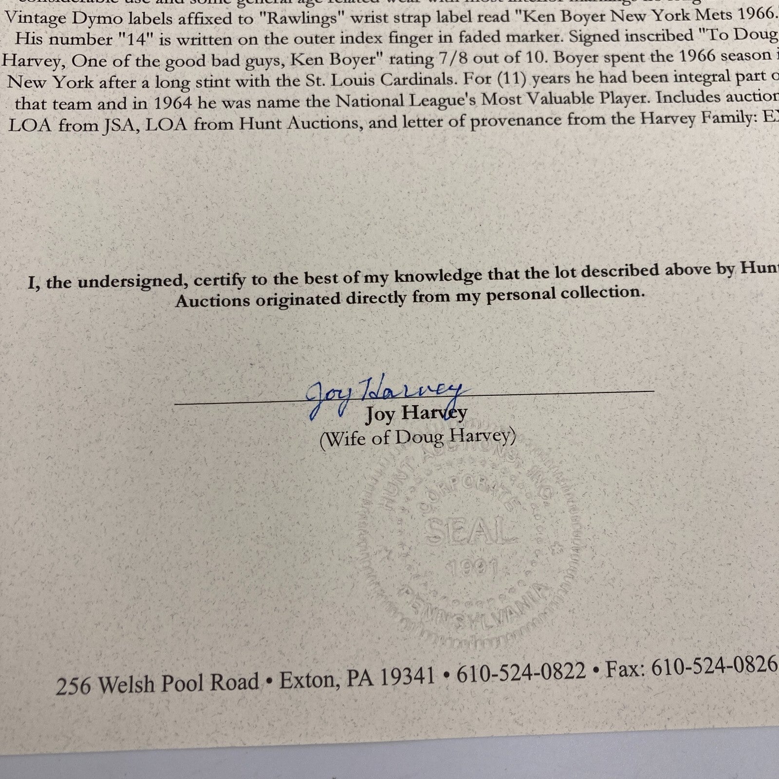 Rawlings brand glove displays outstanding game use His number "14" is written on the outer index finger in faded marker. Signed inscribed "To Doug Harvey, One of the good bad guys, Ken Boyer". For (11) years he had been integral part of the Cardinals and in 1964 he was name the National League's Most Valuable Player. Includes Full letter PSA DNA COA and letter of provenance from the Wife Of Hall Of Fame Umpire Doug Harvey.