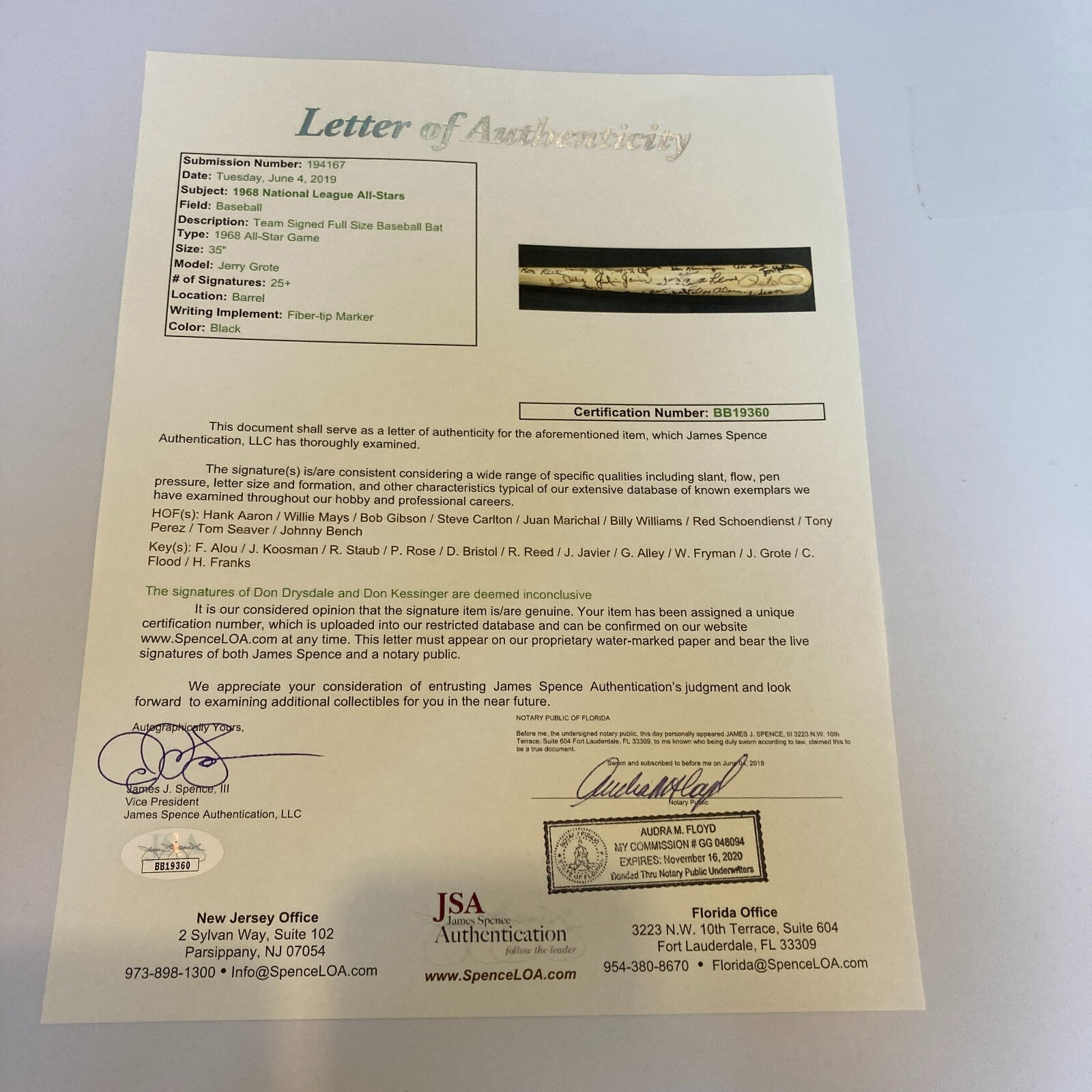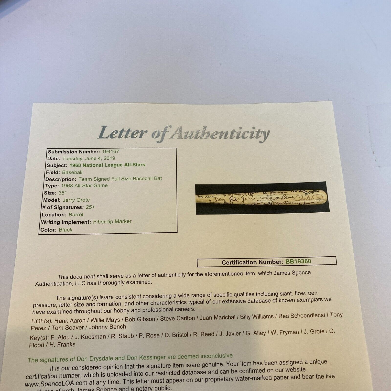 Very rare Jerry Grote 1968 All Star Game National League Team Signed Game Issued Baseball Bat. 25+ signatures with Hank Aaron, Willie Mays, Bob Gibson, Steve Carlton, Juan Marichal, Billy Williams, Tony Perez, Tom Seaver, Johnny Bench and many others.