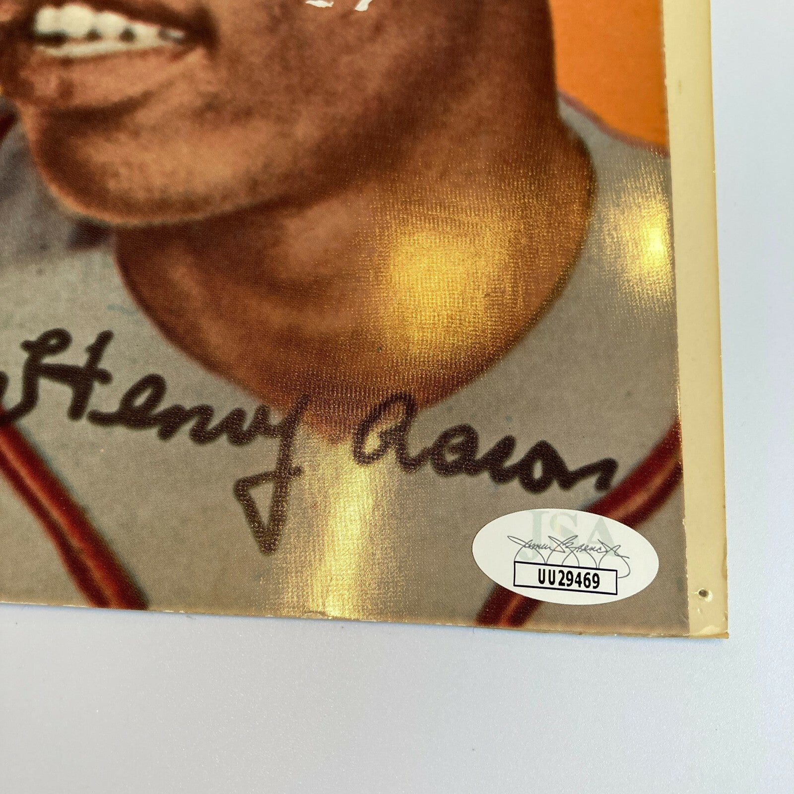 Original Topps production artwork of Hank Aaron's 1954 Topps rookie card, signed by Hank Aaron in blue Sharpie across his cap. This artwork (approximately 7 x 10 inches each) was never used for a specific completed project, and it is unknown what Topps had planned for their use. We checked with an advanced Topps collector, as well as an ex-employee, and the speculation is that these two artworks could have been the final proofs for a poster or puzzle-back design to commemorate Hank Aaron's record-breaking home run in 1974. CMYK “progressive proof” with layers of mylar overlay. This is a fascinating original Topps artwork, featuring the signature of this popular Hall of Famer. Comes with JSA COA.
