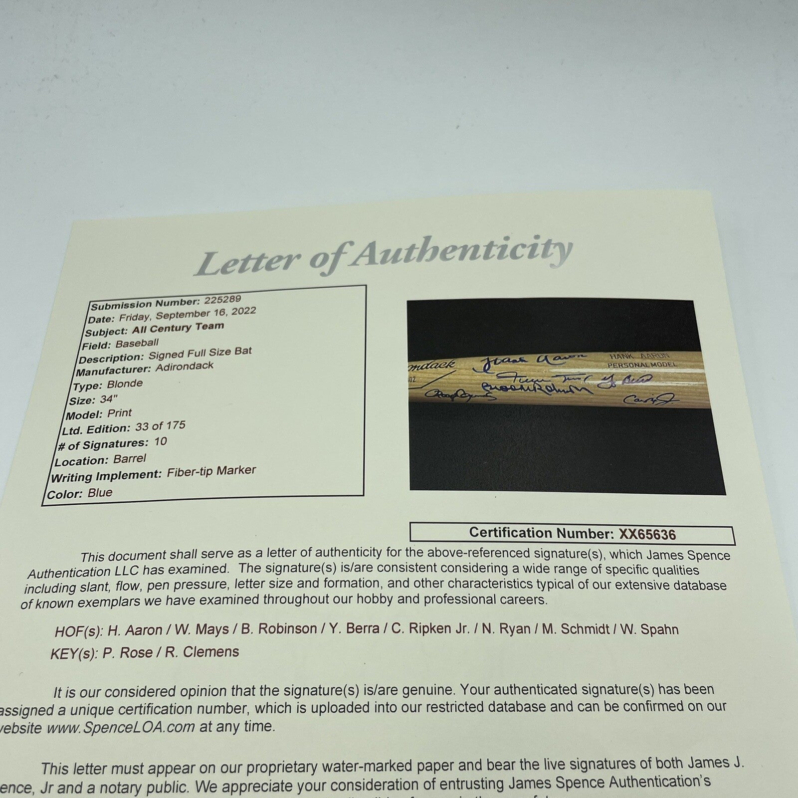 Presented here is a Hank Aaron Adirondack model bat that has been signed by 10 members of the All Century Team. All of the signatures have been signed in bold blue marker and includes Hall of Famers Hank Aaron, Willie Mays, Yogi Berra, Warren Spahn, Brooks Robinson, Cal Ripken, Jr., Mike Schmidt and Nolan Ryan, along with Pete Rose and Roger Clemens. This bat is a limited-edition 33 of 175 and comes with a LOA from JSA.