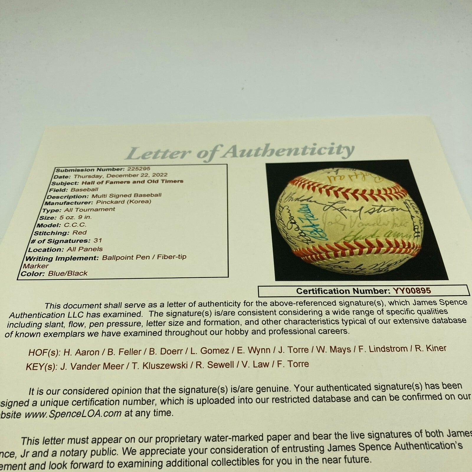 1970's Hall Of Fame Multi Signed Baseball 31 Sigs with Willie Mays, Hank Aaron, Bob Feller, Bobby Doerr, Lefty Gomez, Early Wynn, Joe Torre, Freddie Lindstrom, Ralph Kiner and many others.