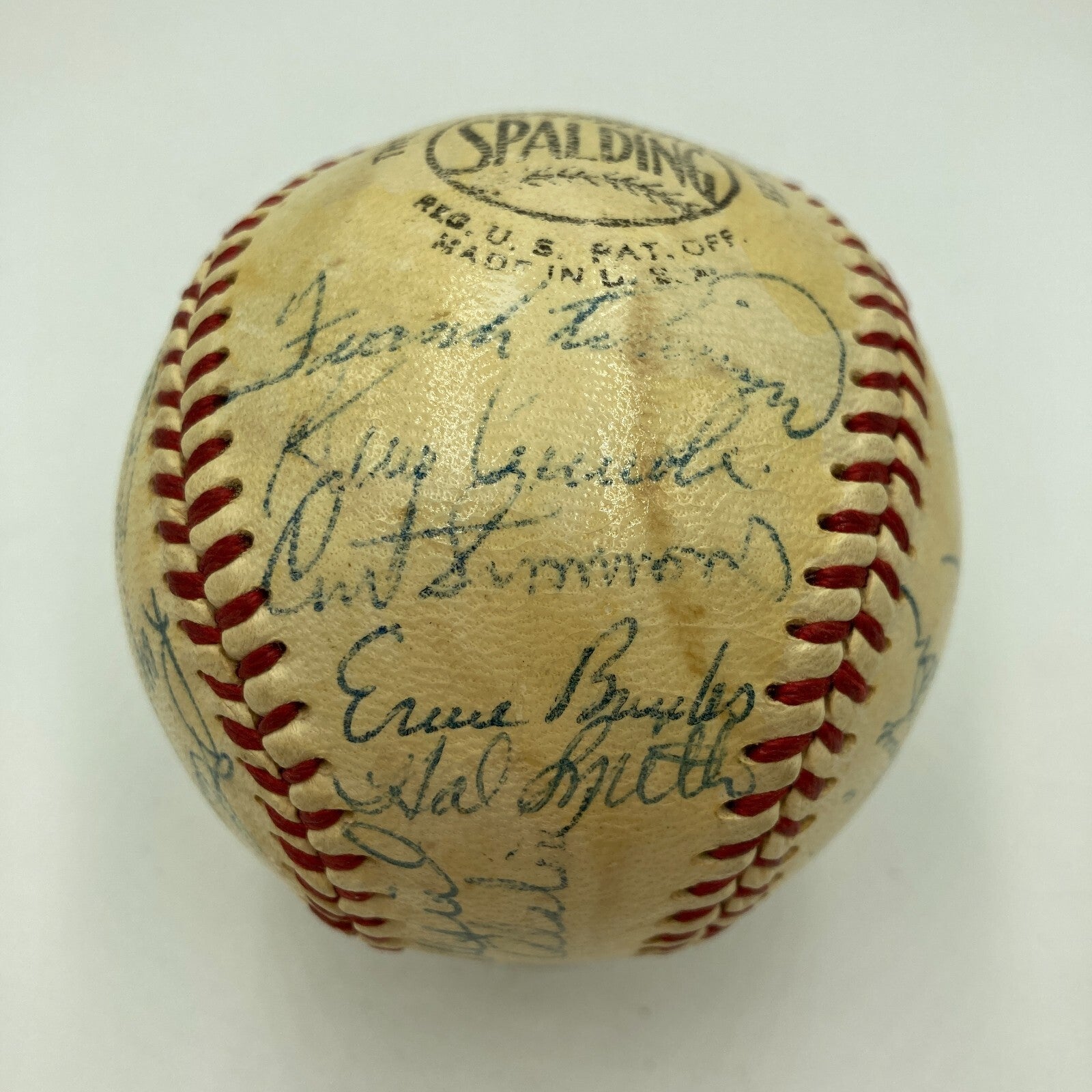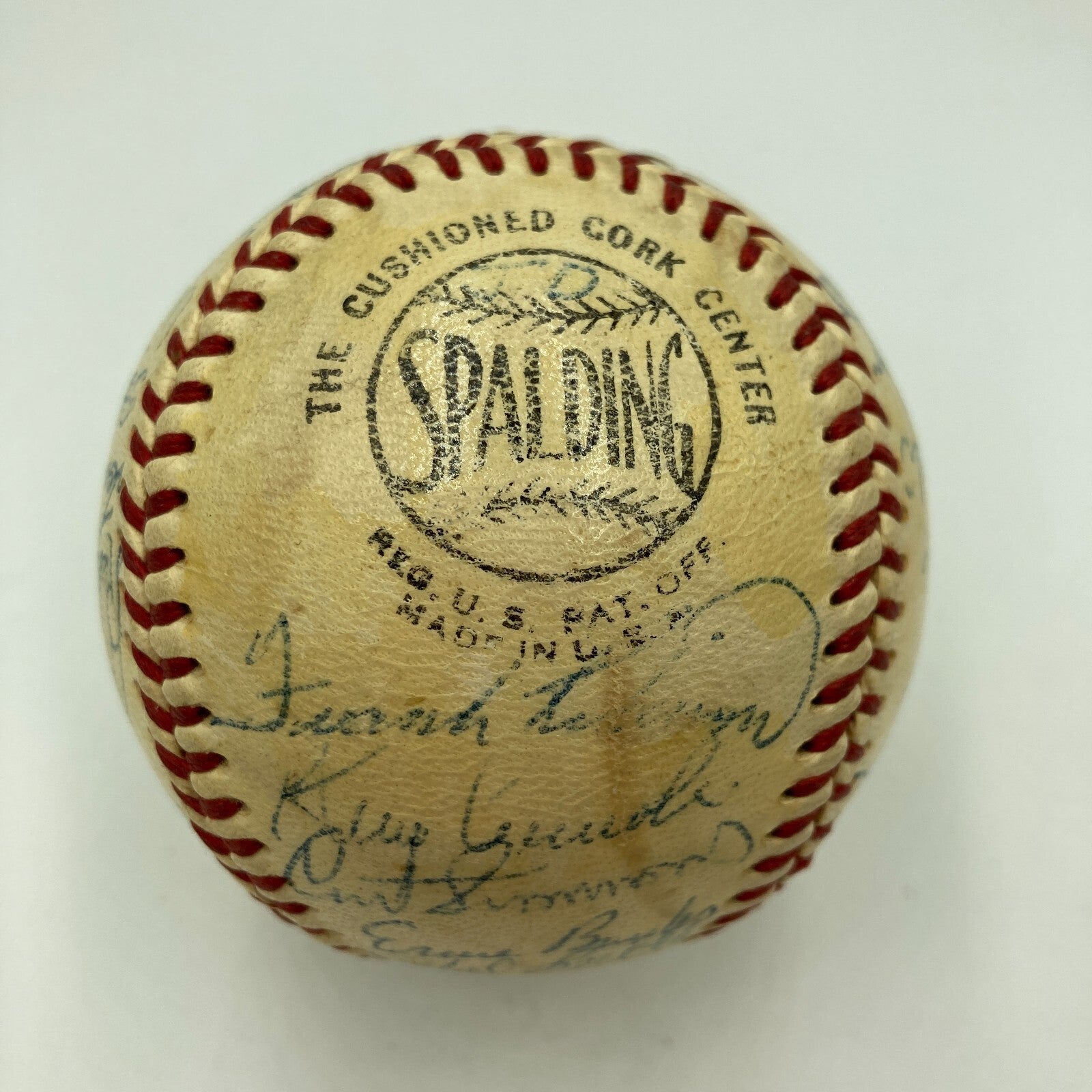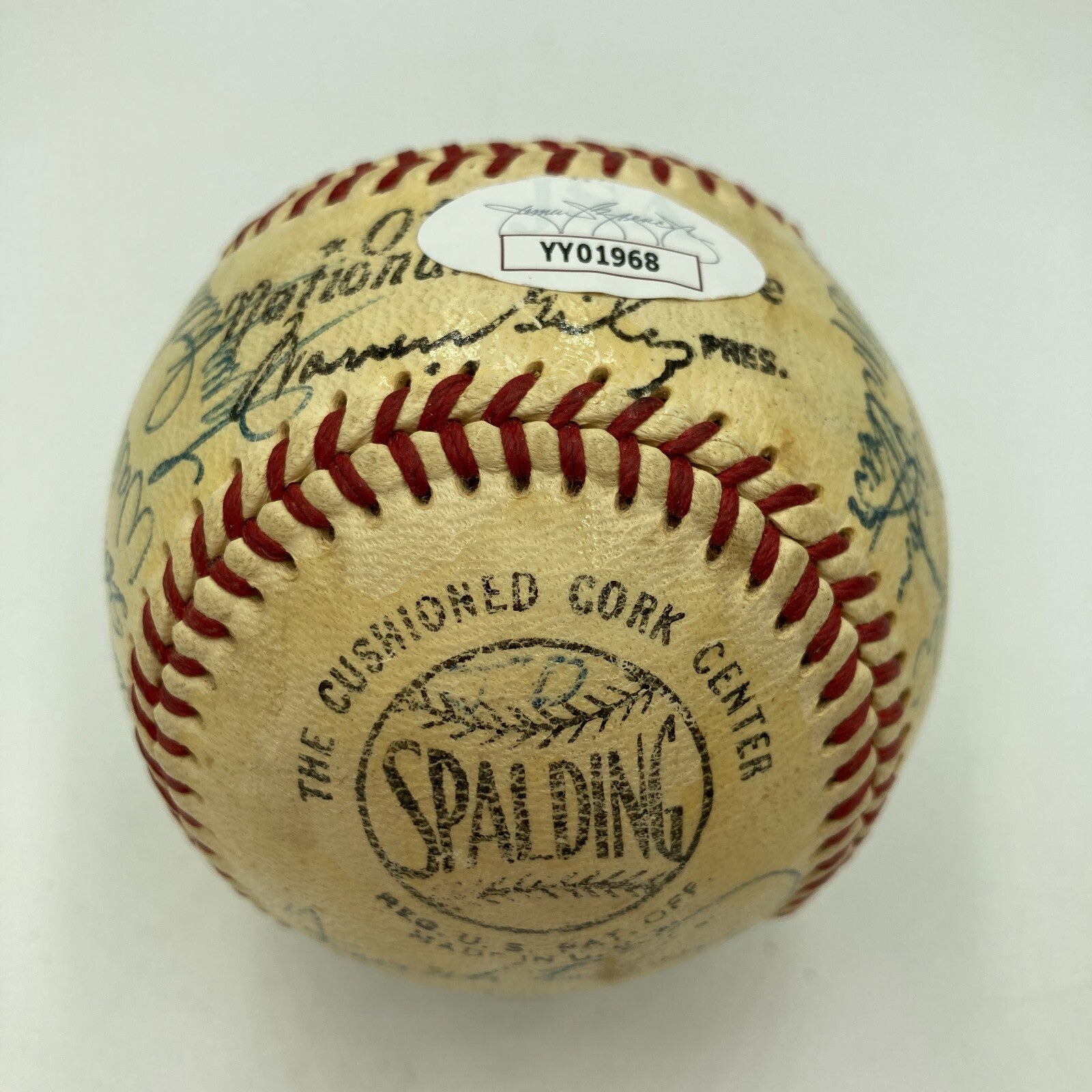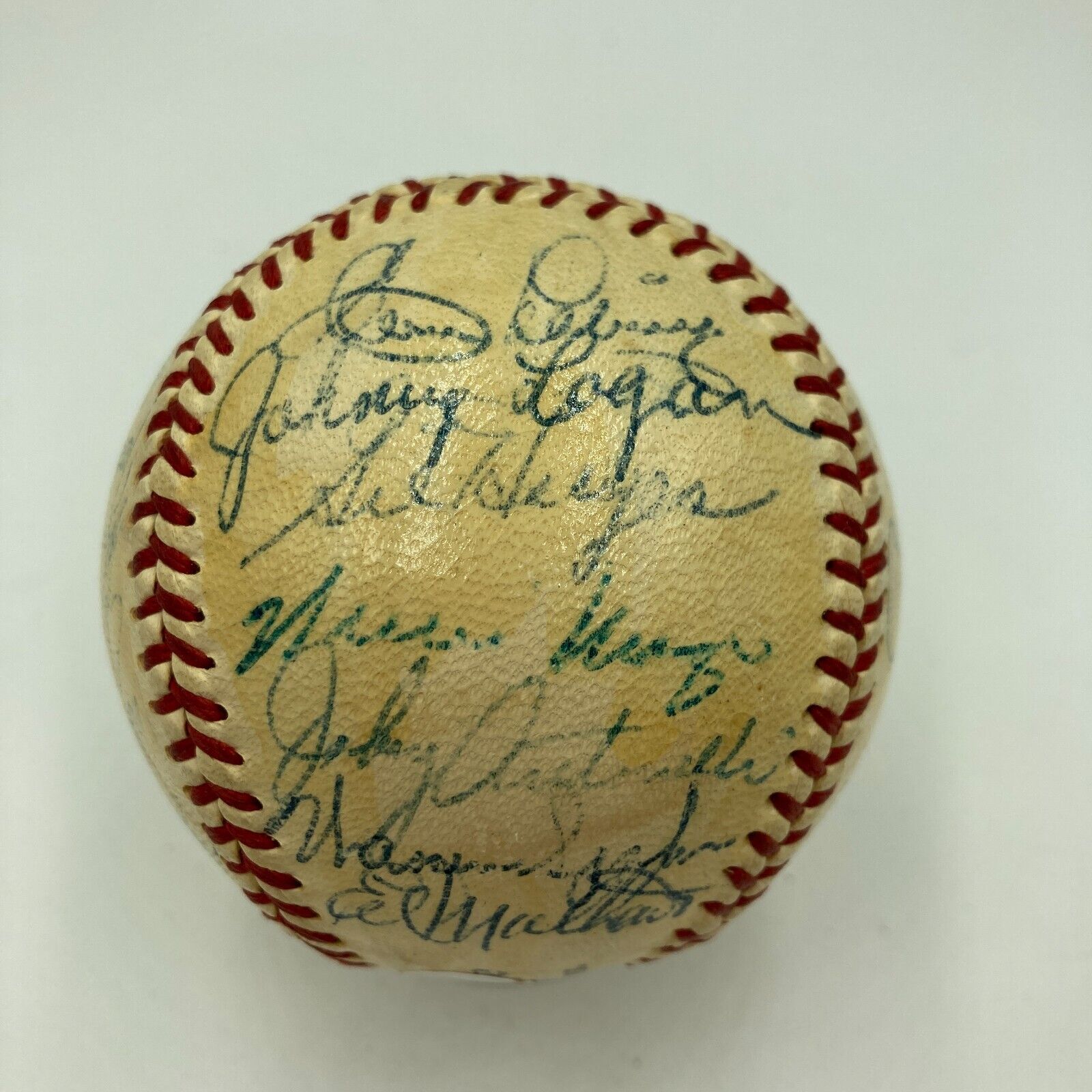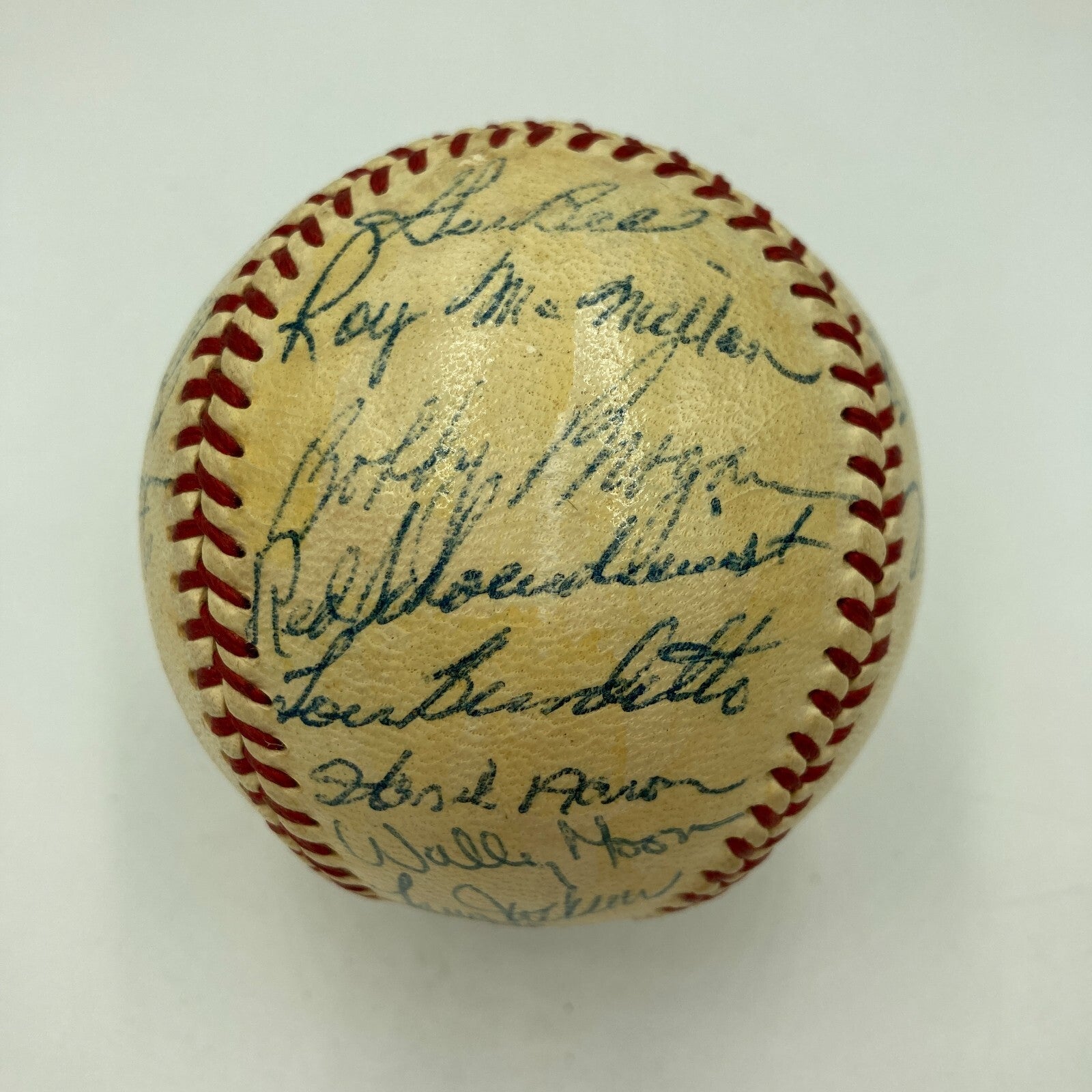 Hank Aaron, Stan Musial, Ernie Banks, Walt Alston,Gil Hodges, Warren Spahn, Eddie Mathews, Frank Robinson, Willie Mays 1950's Hall Of Fame Multi Signed Baseball. 29 Signatures.