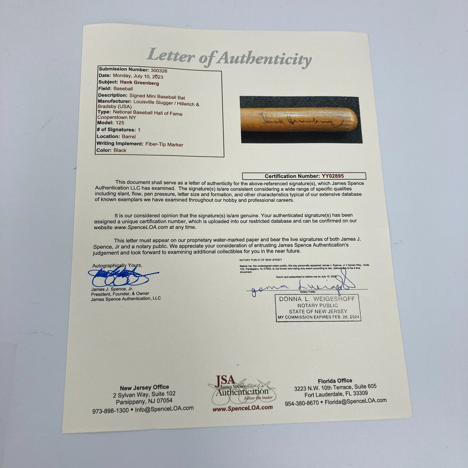 Hank Greenberg Signed 1950's Hall Of Fame Mini Baseball Bat JSA COA