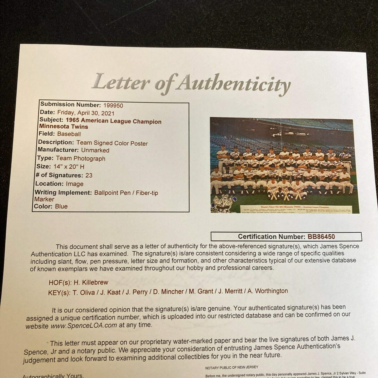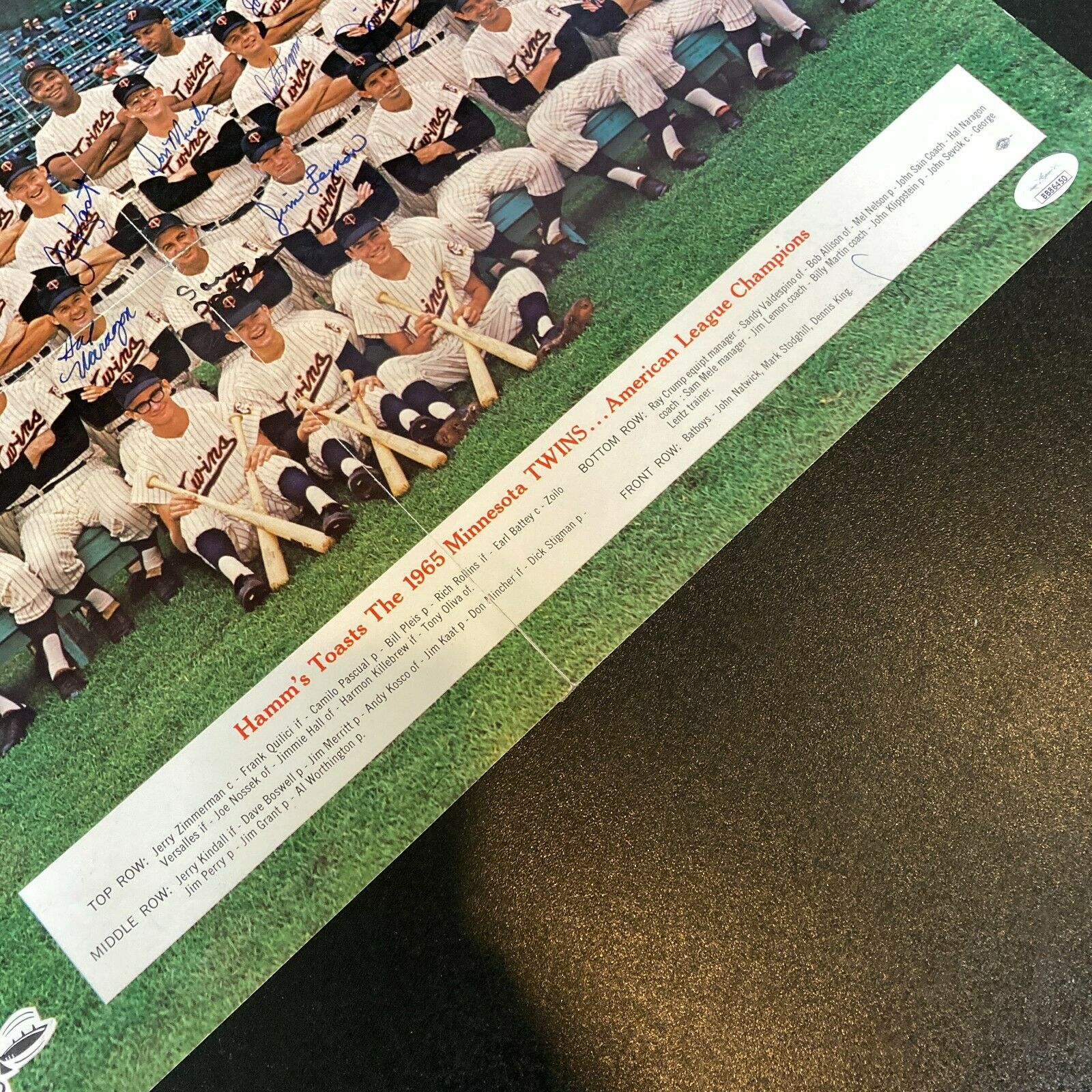 Minnesota Twins 1965 Team signed 16x20 photo with 24 signatures including: Harmon Killebrew, Tony Oliva, Frank Quilici, Camilo Pascual, Bill Pleis, Rich Rollins, Joe Nossek, Al Worthington, Mudcat Grant, Jim Perry, Dick Stigman, Don Mincher, Jim Kaat, Jim Merritt, Dave Boswell, Jerry Kindall, Andy Kosco, Ray Crump, Sandy Valdespino, Mel Nelson, Hal Naragon, Sam Mele, Jim Lemon and John Sevcik.