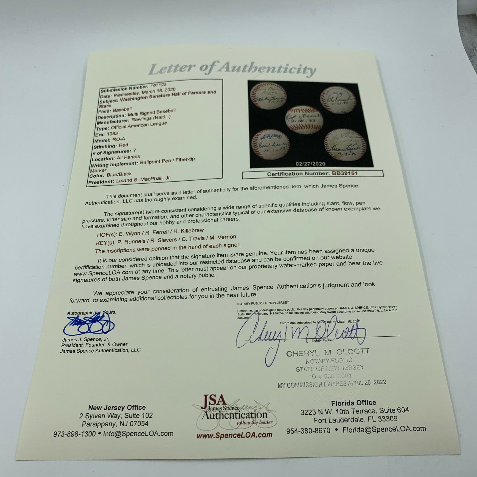 Washington Senators HOF Legends Signed Inscribed Baseball. Signatures include Harmon Killebrew, Roy Sievers, Mickey Vernon, Early Wynn, Cecil Travis, Pete Reynolds.