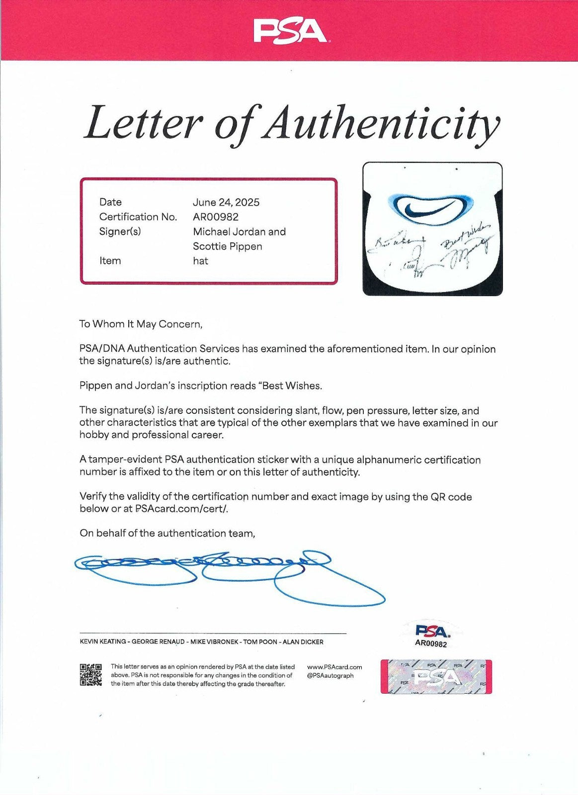 Michael Jordan and Scottie Pippen were the two pillars of the Chicago Bulls throughout the six-championship dynasty in the 1990s. Both have signed the offered white Nike cap on the brim in bold black permanent marker and inscribed "Best Wishes." The cap features a black Nike swoosh with a black and blue oval surrounding it. Nike tag is still intact. Accompanied by a full LOA from PSA/DNA for the two signatures.