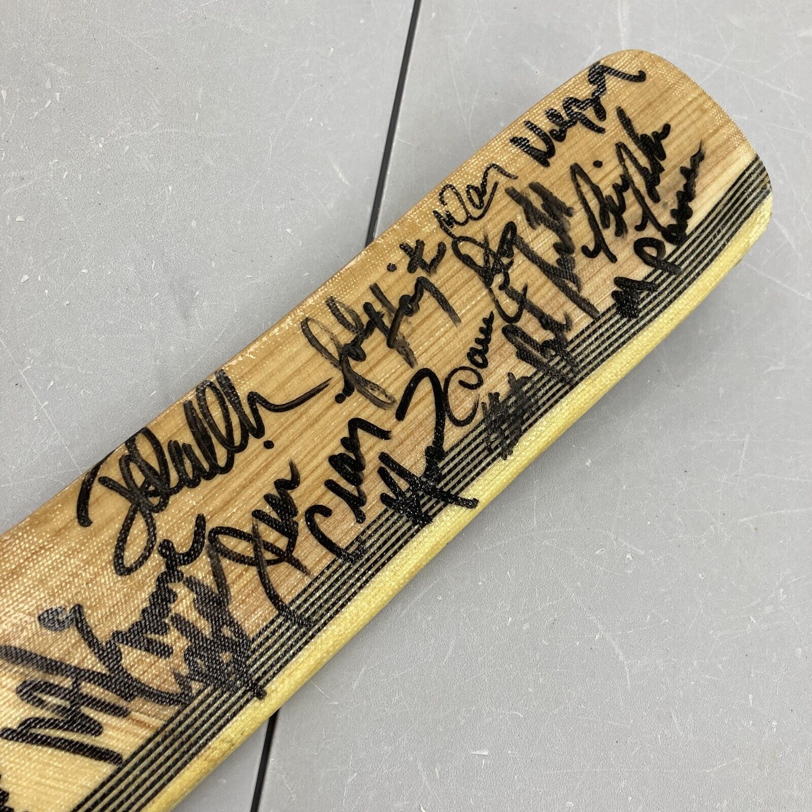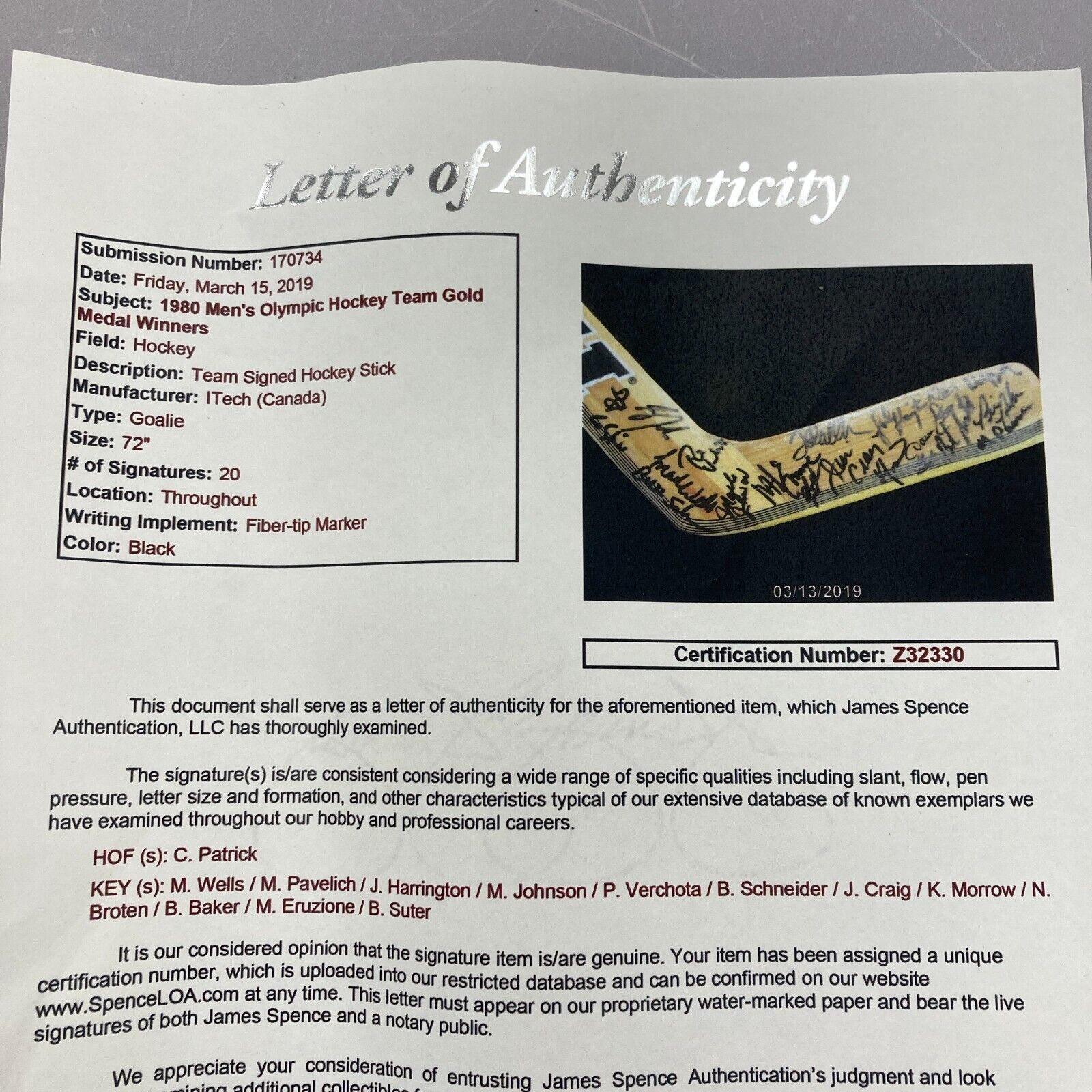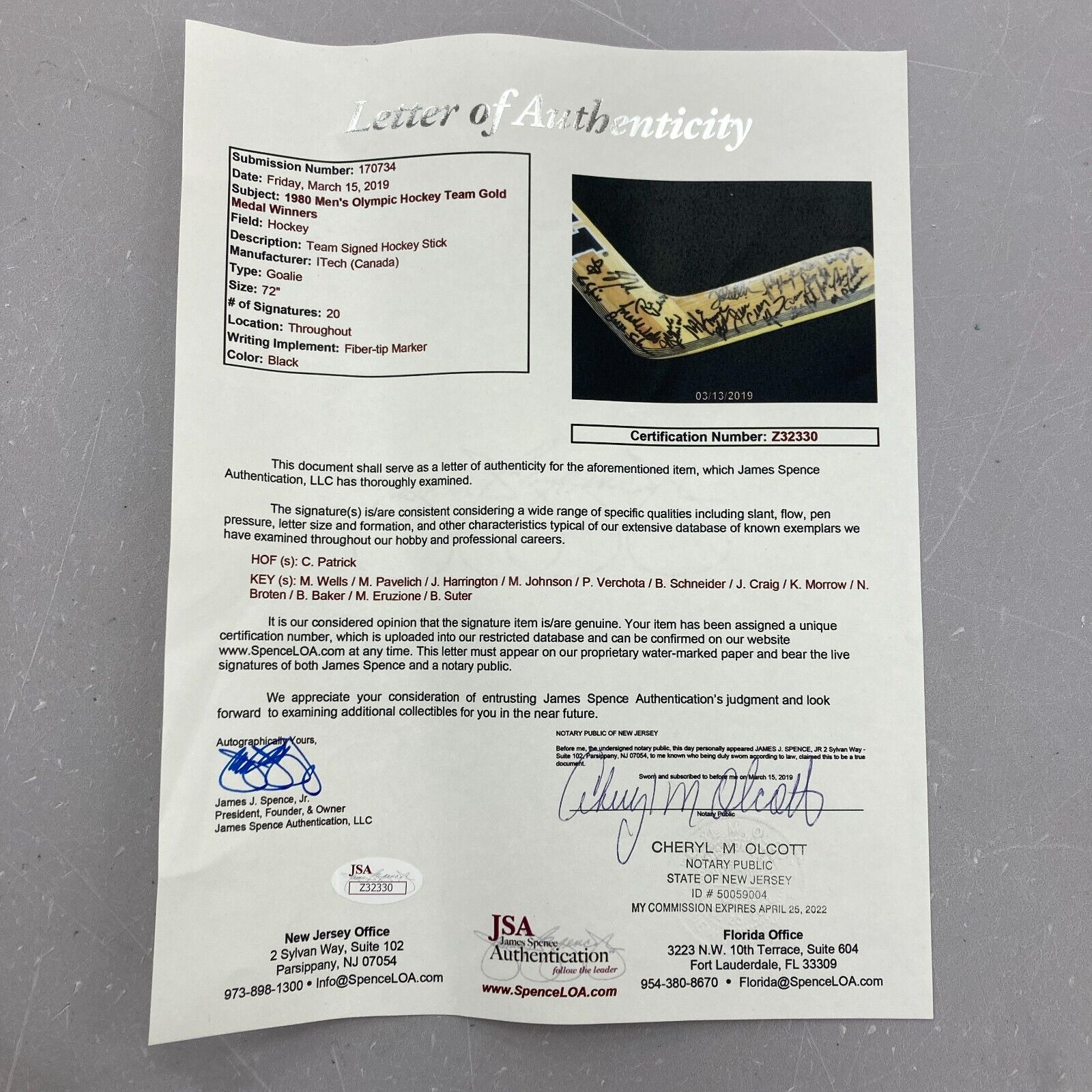 It's regarded as one of the greatest underdog stories in the history of sports: the United States Men's National Hockey Team entering the 1980 Winter Olympics in Lake Placid, NY, comprised of amateur players from across the country. What would happen in the tournament was nothing short of miraculous, as the underdogs defeated the heavily favored Soviet Union in the medal round to send the United States to the gold medal game against Finland, who they would defeat to win the gold medal. Presented is an ITech goalie hockey stick signed by 20 members of the 1980 "Miracle on Ice" United States Olympic Hockey team. Signatures include: Craig Patrick, Mark Wells, Mark Pavelich, John Harrington, Mark Johnson, Phil Verchota, Buzz Schneider, Jim Craig, Ken Morrow, Neal Broten, Bill Baker, Mike Eruzione, and Bob Suter. The stick comes with an LOA from JSA (Z32330) for signatures.