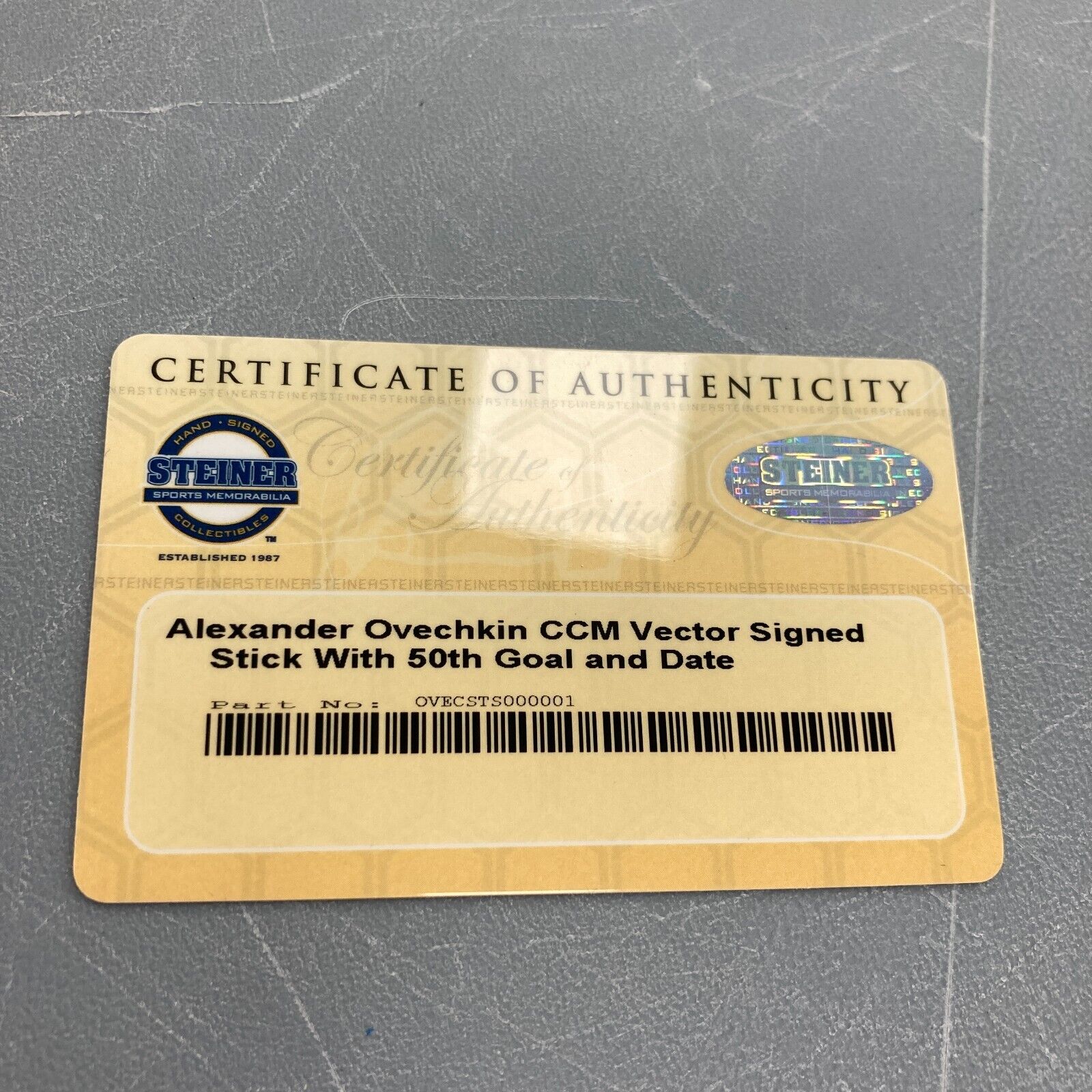 Presented is a CCM Vector hockey stick signed by one of the greatest goalscorers in NHL history, Alexander Ovechkin. Ovechkin has penned his flowing signature in black marker along the stick's blade, adding the inscription "#50 4/13/06," commemorating the first time in his career when he reached the 50-goal mark on Apr. 13 during the 2005-06 NHL season, his first season since arriving from Russia. The stick comes with a COA from Steiner for signature.