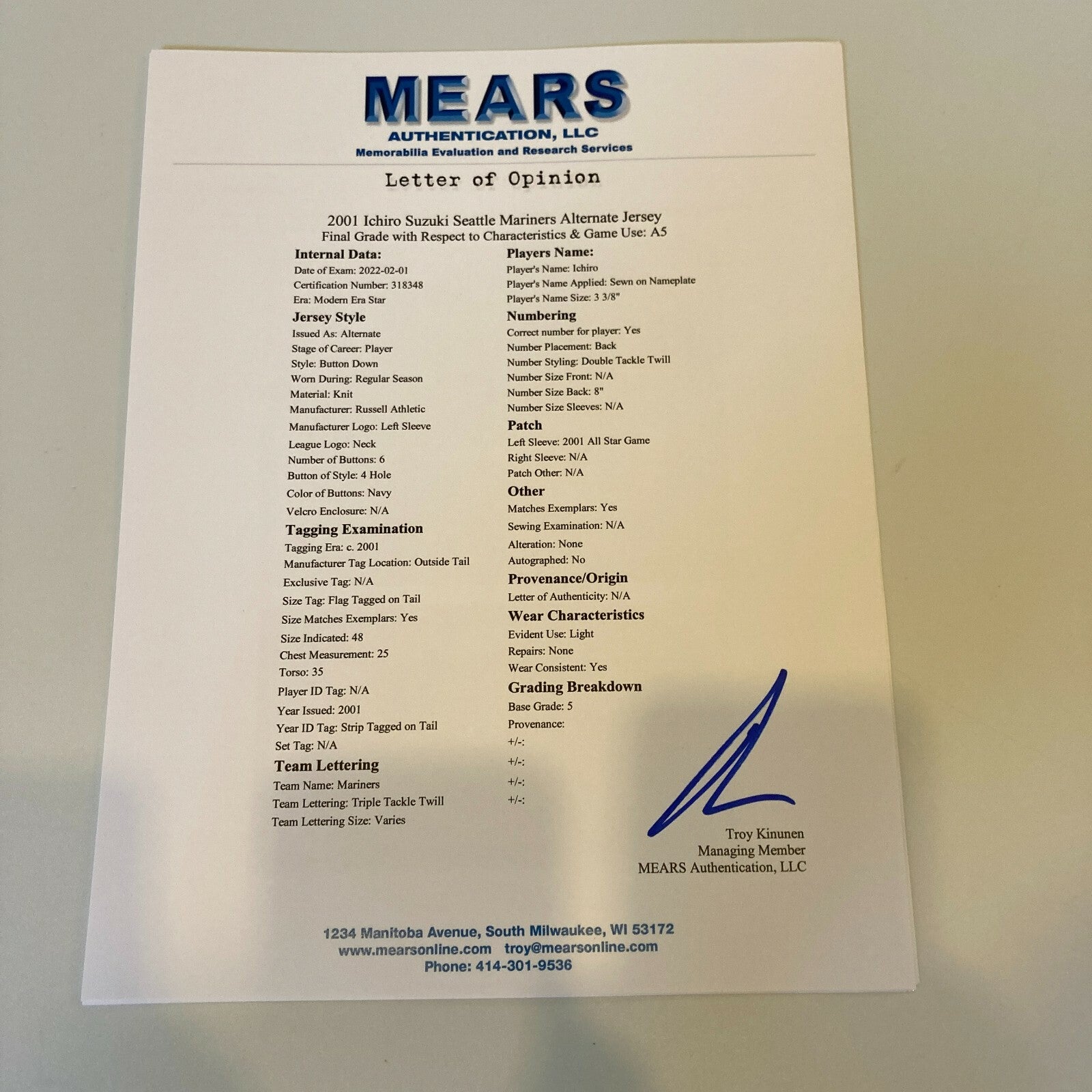 Click or scroll to zoom Tap or pinch to zoom Click or scroll to zoom Tap or pinch to zoom Click or scroll to zoom Tap or pinch to zoom Click or scroll to zoom Tap or pinch to zoom Click or scroll to zoom Tap or pinch to zoom Click or scroll to zoom Tap or pinch to zoom Click or scroll to zoom Tap or pinch to zoom Click or scroll to zoom Tap or pinch to zoom Click or scroll to zoom Tap or pinch to zoom Click or scroll to zoom Tap or pinch to zoom Click or scroll to zoom Tap or pinch to zoom Click or scroll to zoom Tap or pinch to zoom Ichiro Suzuki Rookie Season Game Used 2001 Seattle Mariners Jersey MEARS COA $11,995.00 1 2 3 4 5 6 7 8 9 10+ Quantity Quantity Add to cart This item is a recurring or deferred purchase. By continuing, I agree to the cancellation policy and authorize you to charge my payment method at the prices, frequency and dates listed on this page until my order is fulfilled or I cancel, if permitted. Rare Ichiro Suzuki Rookie Season Game Used 2001 Seattle Mariners Jersey with the All Star Game patch. Also comes with the game used undershirt. Comes with full letter COA from MEARS and a Mill Creek Sports COA for the undershirt.D#A19