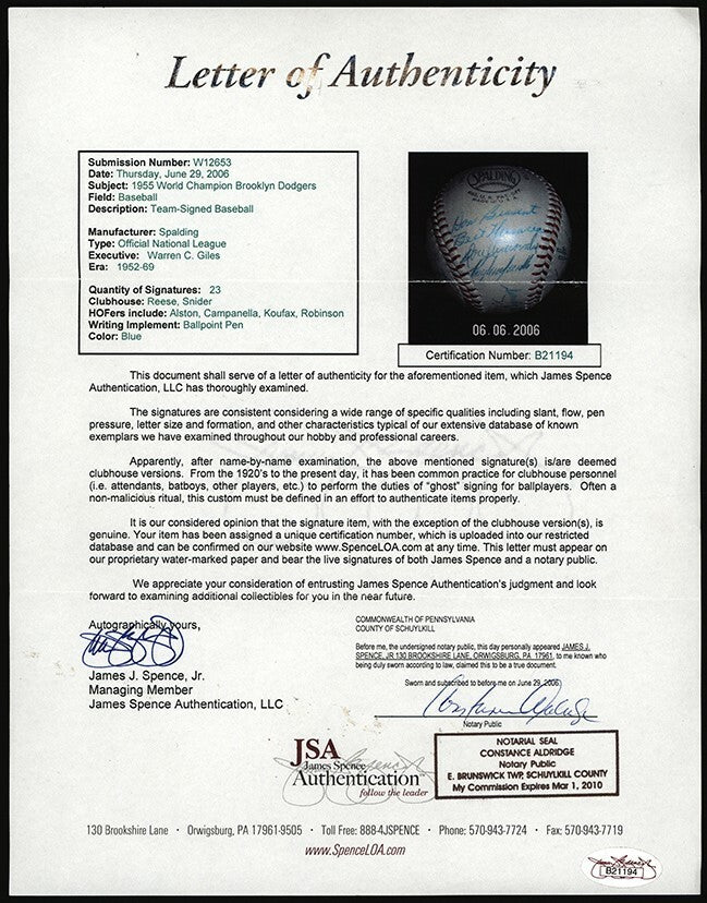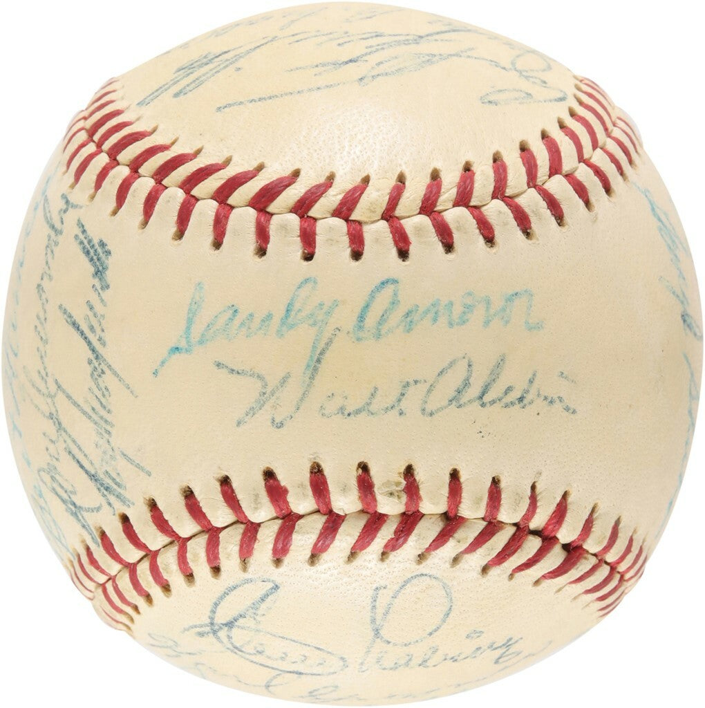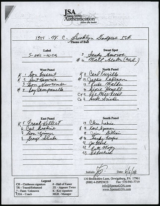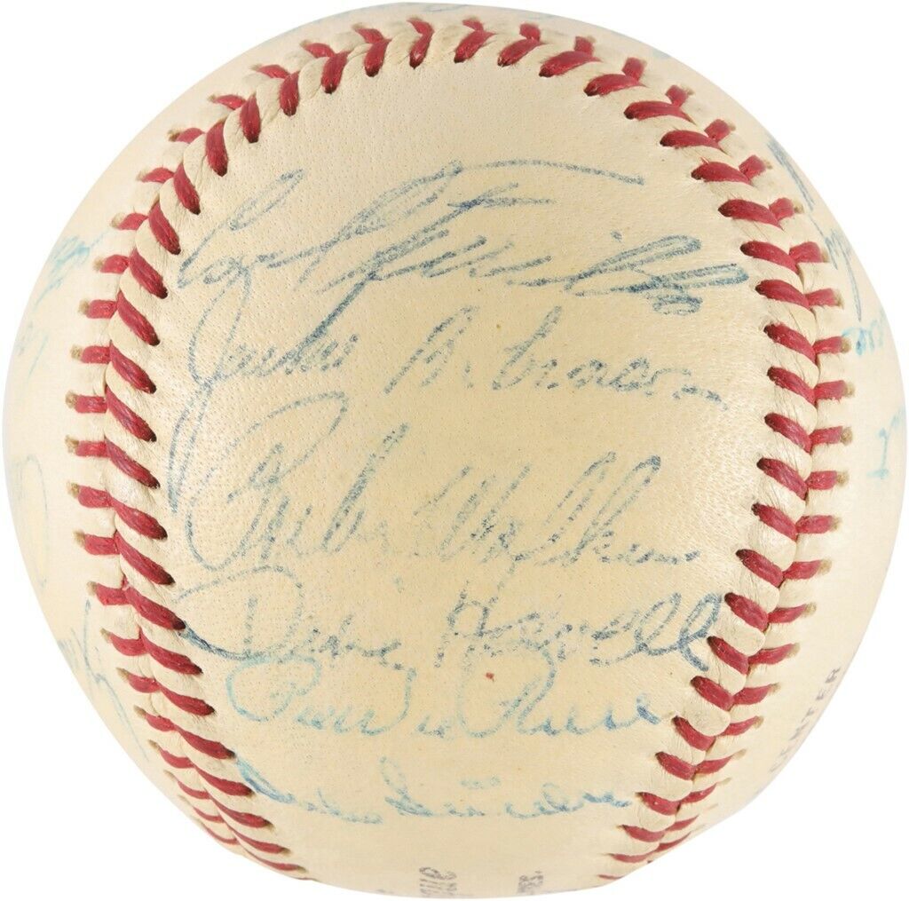 Outstanding Brooklyn Dodgers team-signed baseball from the club's memorable 1955 World Championship season. The official National League (Giles) ball is signed in blue ink by the following 23 team members: Jackie Robinson, Sandy Koufax, Roy Campanella, Walt Alston (Mgr., ss), Sandy Amoros (ss), Carl Furillo, Rube Walker, Howell, Reese and Snider (clubhouse signature), Labine, Spooner, Gilliam, Black, Wojey, Roebuck, Kellert, Erskine, Zimmer, Shuba, Newcombe, Hamric, and Bessent. Excellent to Mint condition overall. 1955 marked the Dodgers' only World Championship season while in Brooklyn, making this one of the most significant keepsakes from that memorable season. Full LOA from JSA.