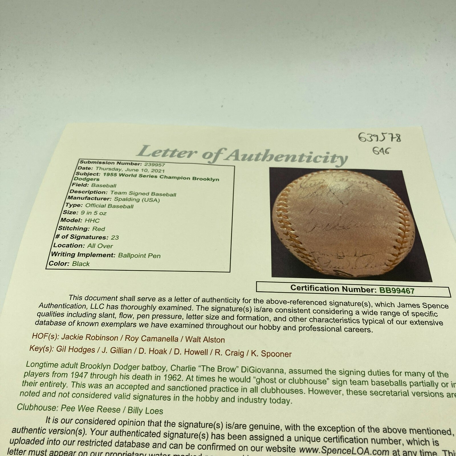 One of the ultimate team signed baseballs, the 1955 Brooklyn Dodgers were a truly historic World Championship team! High grade balls can run a small fortunate, offered is a nice mid-grade specimen. Signed on a clean Spalding Official Baseball, OCT. 4, 1955 World Champions is written on the ball in period blue ballpoint. There are 23 total signatures. The key autographs include Jackie Robinson, Roy Campanella, Walt Alston, Gil Hodges, Don Hoak and Karl Spooner. Amazingly for a Dodger ball from this era, there are just two clubhouse signatures (Reese, Loes).