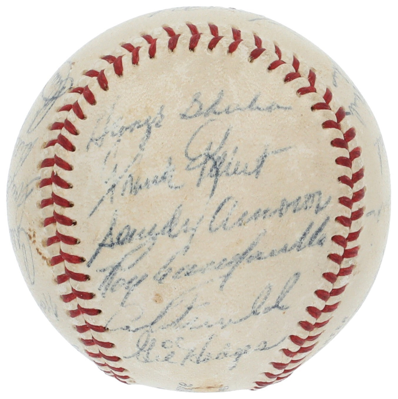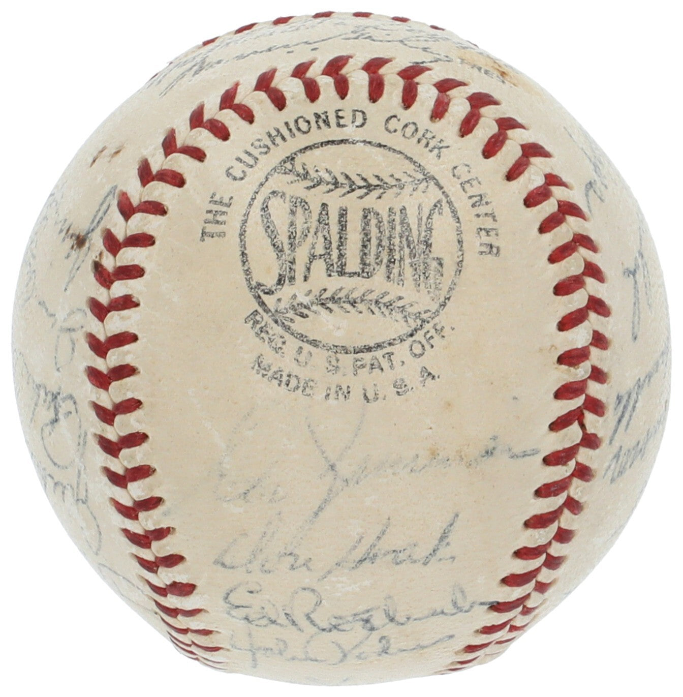 Offered is an Official National League Warren Giles baseball signed by 22 members of the 1955 World Series Champion Brooklyn Dodgers. The Spalding baseball features key signatures in faded blue ink by Hall of Famers Jackie Robinson, Walt Alston, Gil Hodges, Sandy Koufax, and Roy Campanella. Additional notable signatures include Jim Gilliam, Carl Furillo, George Shuba, Sandy Amoros, Karl Spooner, Carl Erskine, Clem Labine, Johnny Podres, Don Zimmer, and Don Newcombe. The item comes with an LOA from JSA (XX58053) for the signatures.