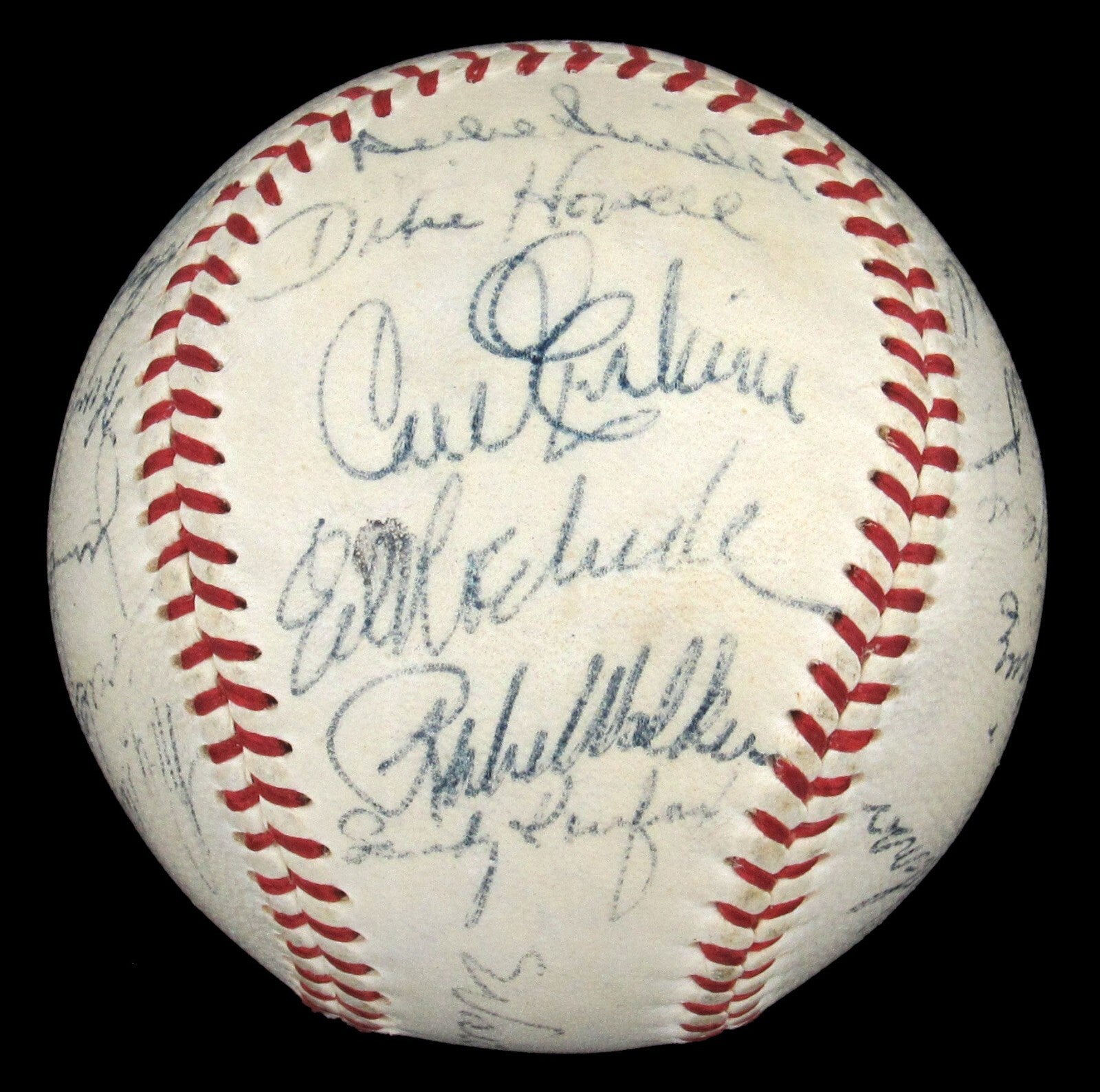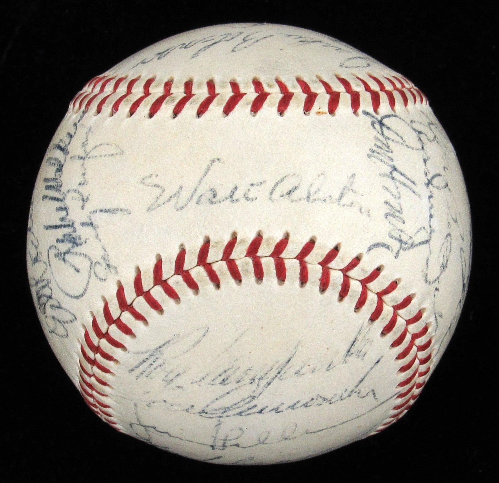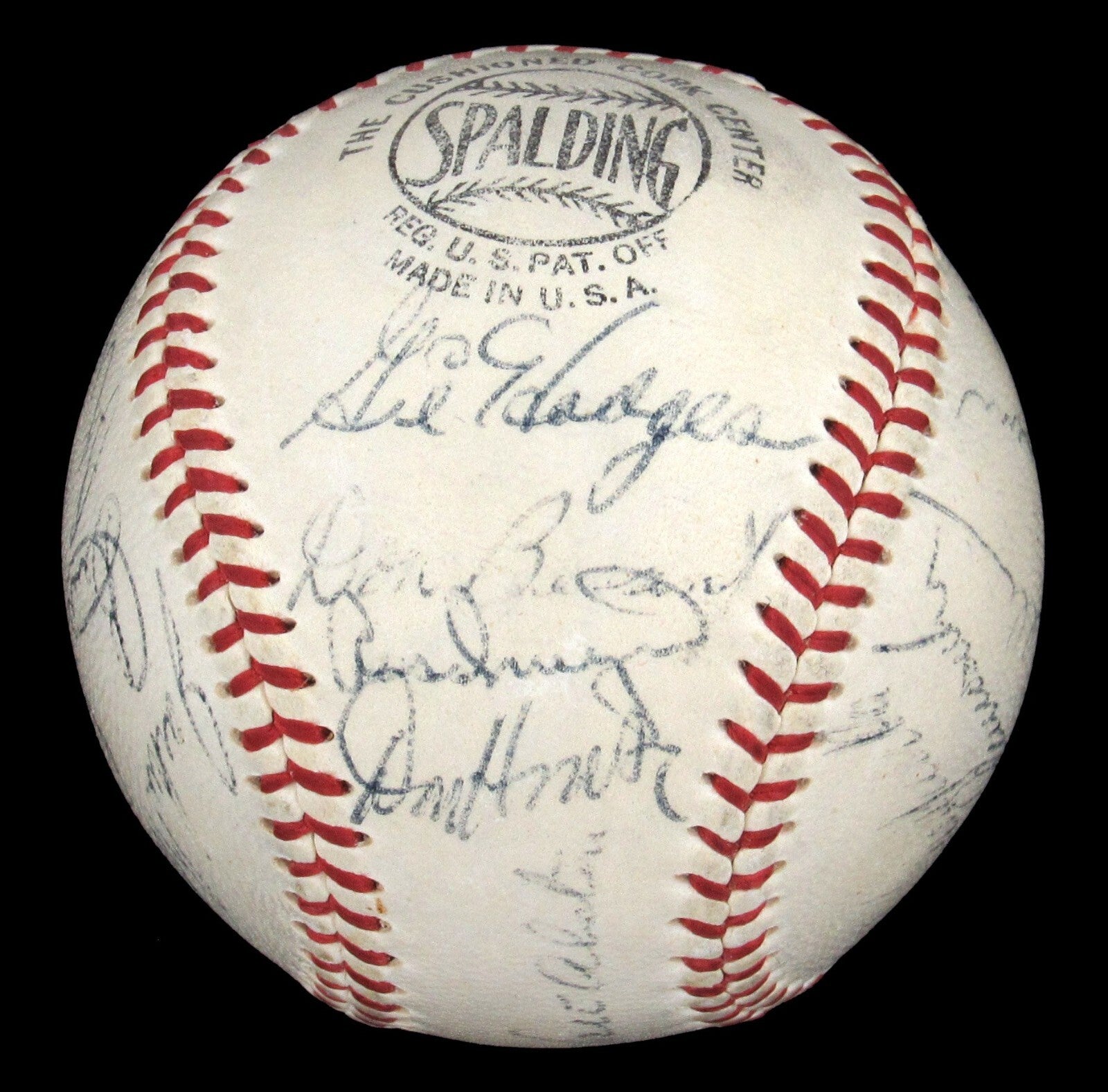 In one of baseball great rivalries, the Brooklyn Dodgers faced the New York Yankees in the World Series seven times during the period 1941-1956. While the Yankees came out on top in six of these match-ups, "The Boys of Summer" got their taste of glory in 1955. The Dodgers seven-game victory in the 1955 Fall Classic, was the only World Series win of their long Brooklyn tenure. Commemorate this long ago triumph, with this 1955 Brooklyn Dodgers team-signed baseball. This nicely preserved Official National League Giles ball (EX-MT) is decorated with (23) autographs, however (5) of them are noted as clubhouse examples. There's still plenty to cheer about here, as the autographs of legends Jackie Robinson, Roy Campanella, Gil Hodges, Walt Alston, Sandy Koufax, and Carl Furillo have all passed the certification process with flying colors.