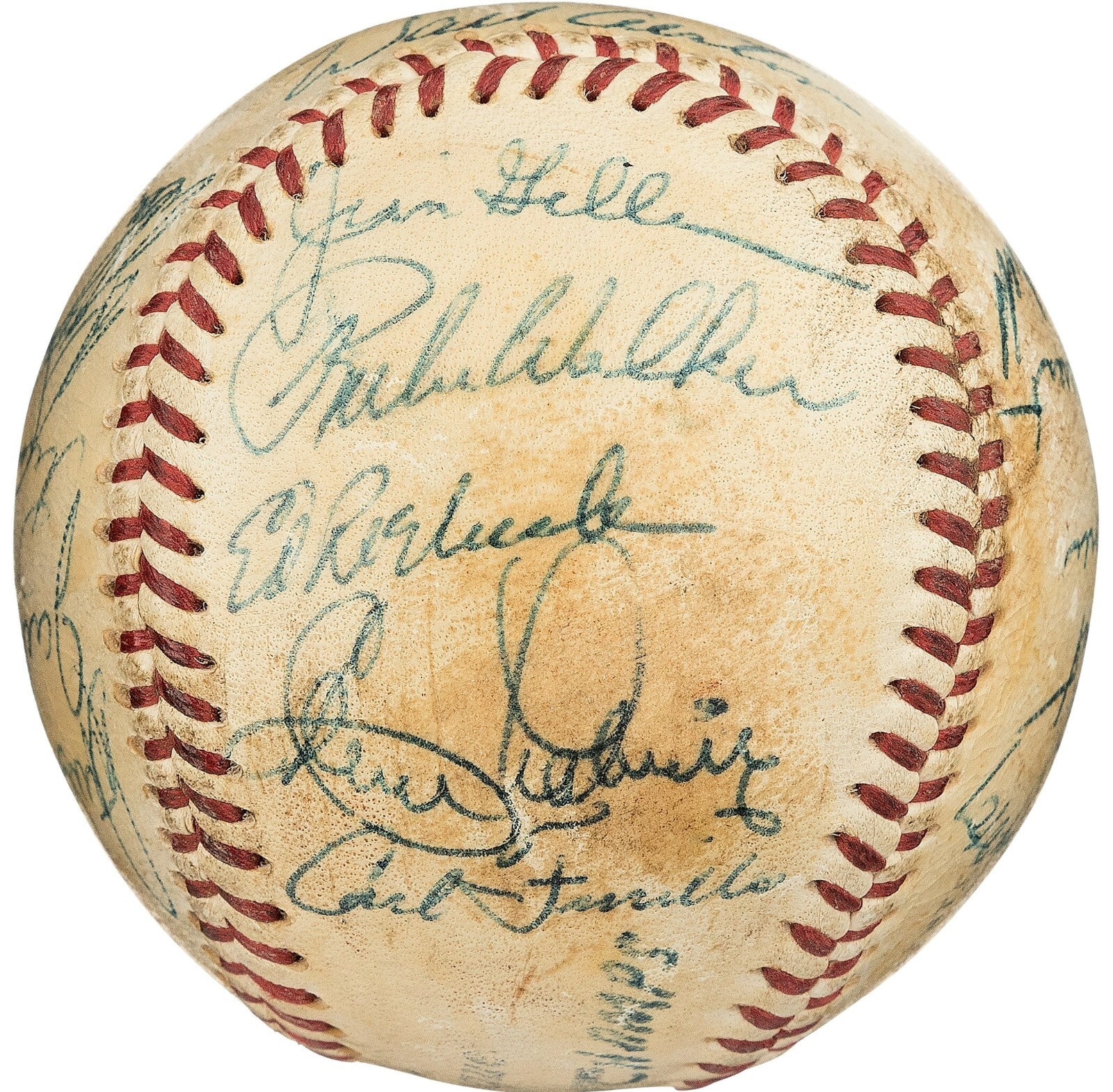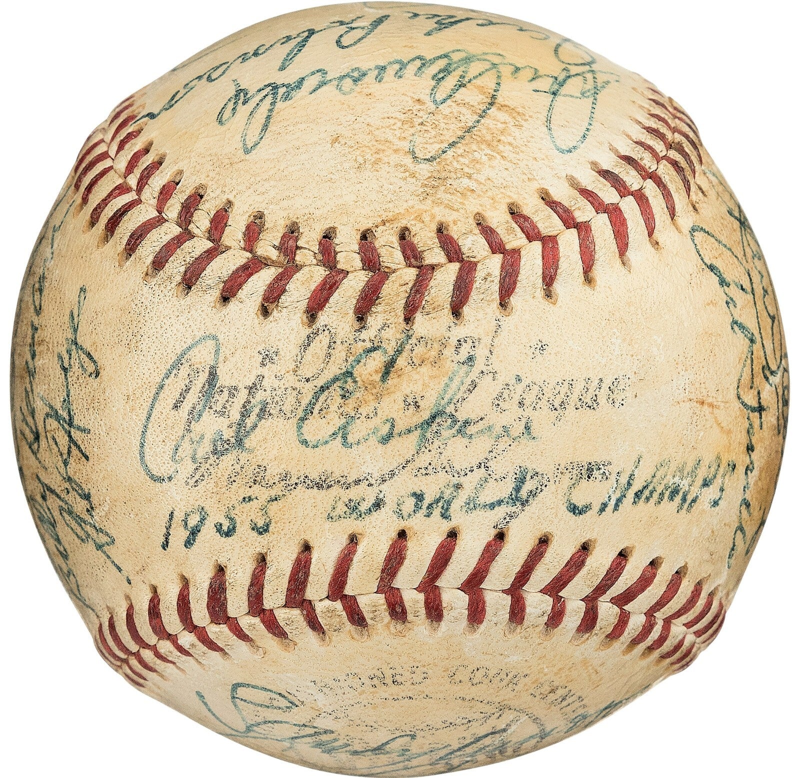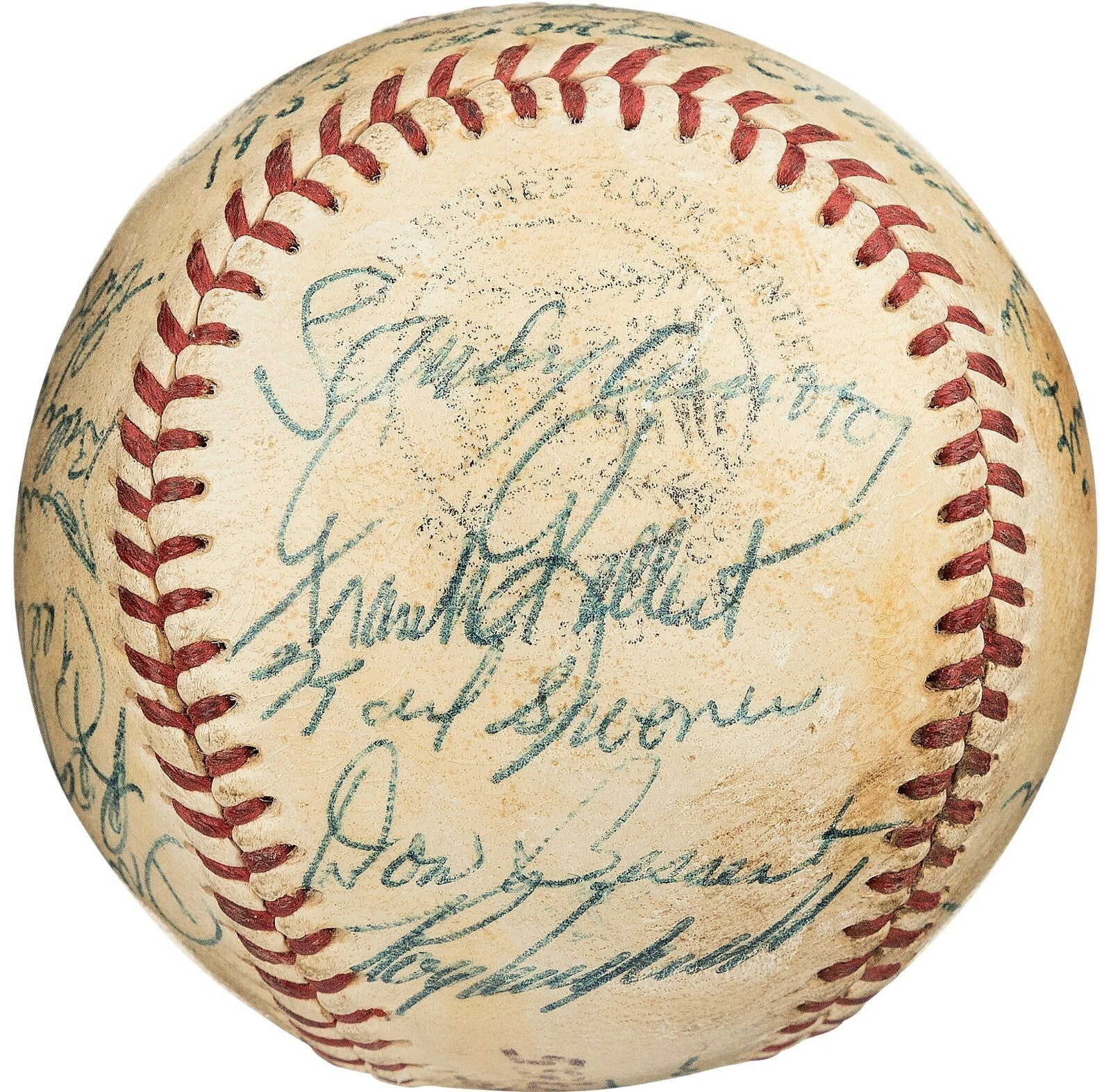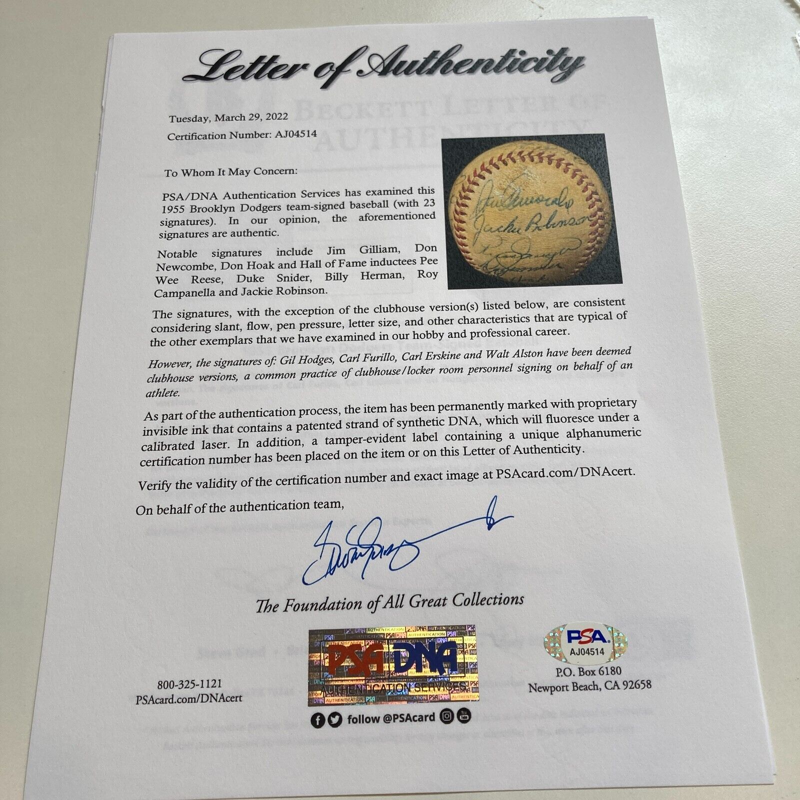 1955 Brooklyn Dodgers Team Signed Baseball. Arguably the most important post-war team ball of them all, this Official National League (Giles) sphere is signed by twenty-three mythical members of the 1955 World Series champion Brooklyn Dodgers, including Hall of Famers Jackie Robinson, Roy Campanella, Duke Snider, Pee Wee Reese and Billy Herman. Also featured are Labine, Craig, Gilliam, Walker, Roebuck, Amoros, Bessent, Hoak, Kellert, and others. Deemed clubhouse: Hodges, Erskine, Furillo and Hodges. An exceptional specimen from an iconic season in American sports. Full LOA from Beckett Authentication Services. Full LOA from PSA/DNA.
