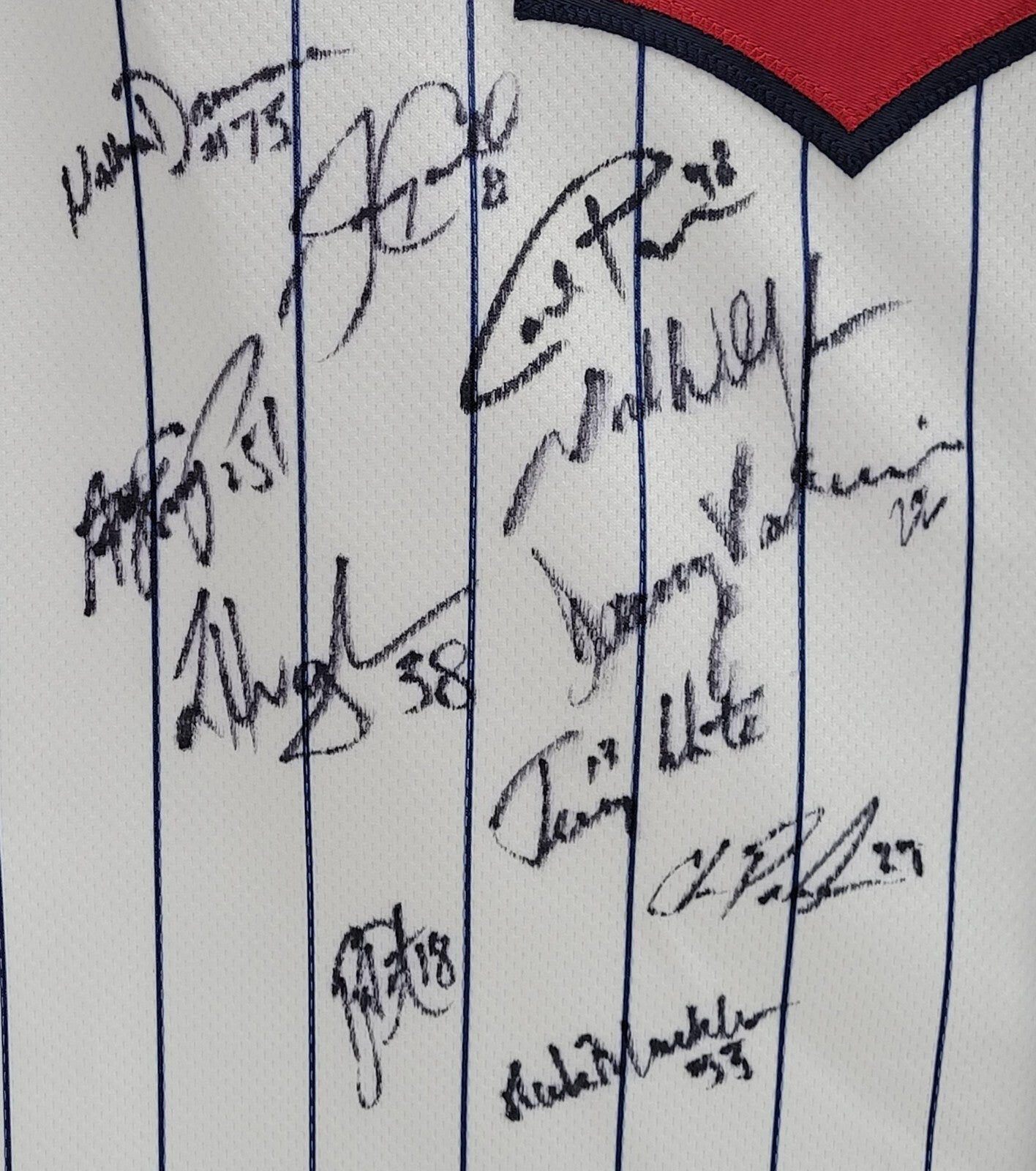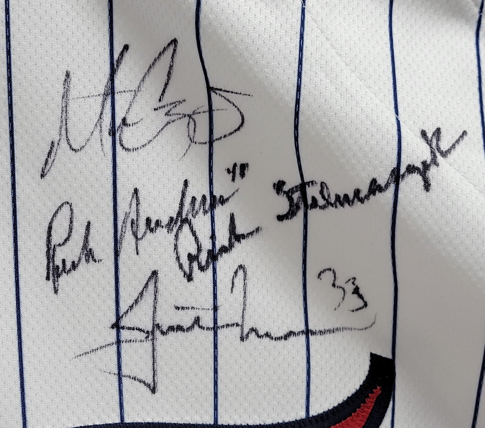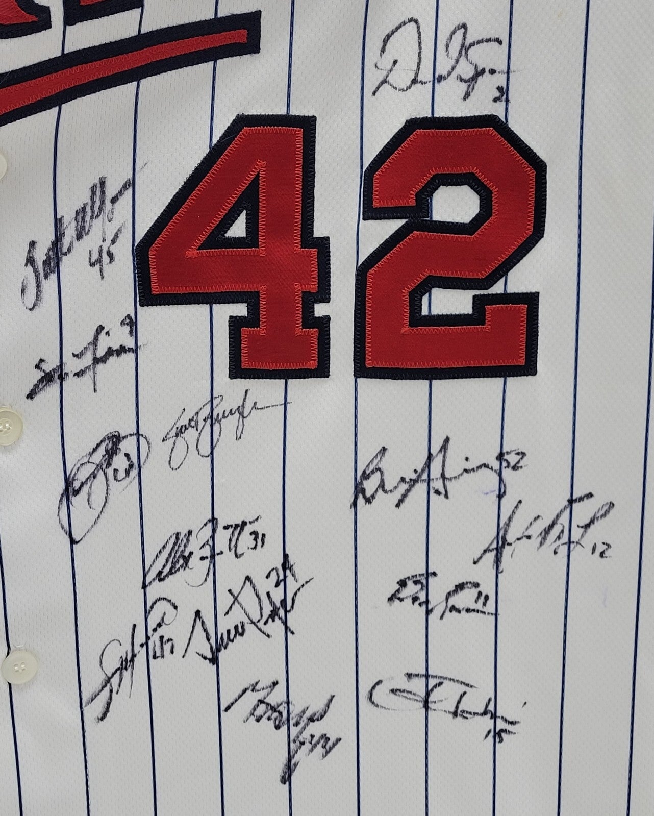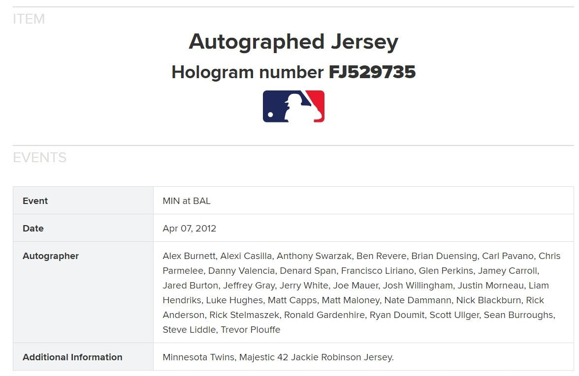 2012 Minnesota Twins team signed Jackie Robinson Day jersey. Signatures include: Joe Mauer, Justin Morneau, Alex Burnett, Alexi Casilla, Anthony Swarzak, Ben Revere, Brian Duensing, Carl Pavano, Chris Parmelee, Danny Valencia, Denard Span, Francisco Liriano, Glen Perkins, Jamey Carroll, Jared Burton, Jeffrey Gray, Jerry White, Josh Willingham, Liam Hendriks, Luke Hughes, Matt Capps, Matt Maloney, Nate Dammann, Nick Blackburn, Rick Anderson, Rick Stelmaszek, Ron Gardenhire, Ryan Doumit, Scott Ullger, Sean Burroughs, Steve Liddle, & Trevor Plouffe. MLB Authenticated hologram.
