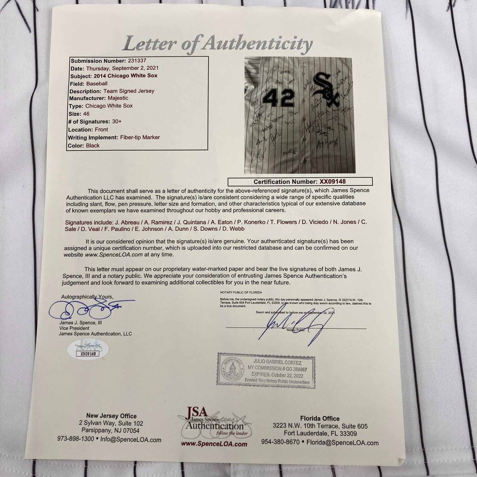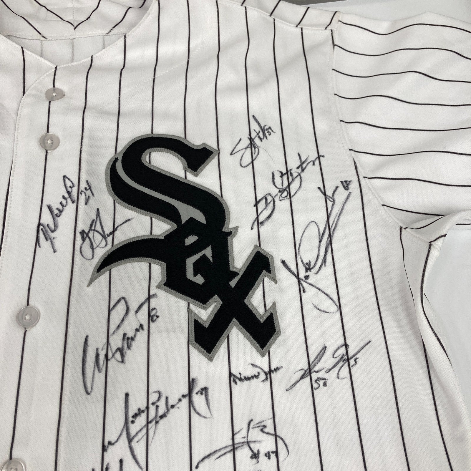 José Abreu, Alexei Ramirez, José Quintana, Adam Eaton, Paul Konerko, Tyler Flowers, Dayán Viciedo, Nate Jones, Chris Sale, David Veal, Felipe Paulino, Erik Johnson, Addison Dunn, Scott Downs, Daniel Webb. Comes with JSA COA and MLB authenticated hologram.