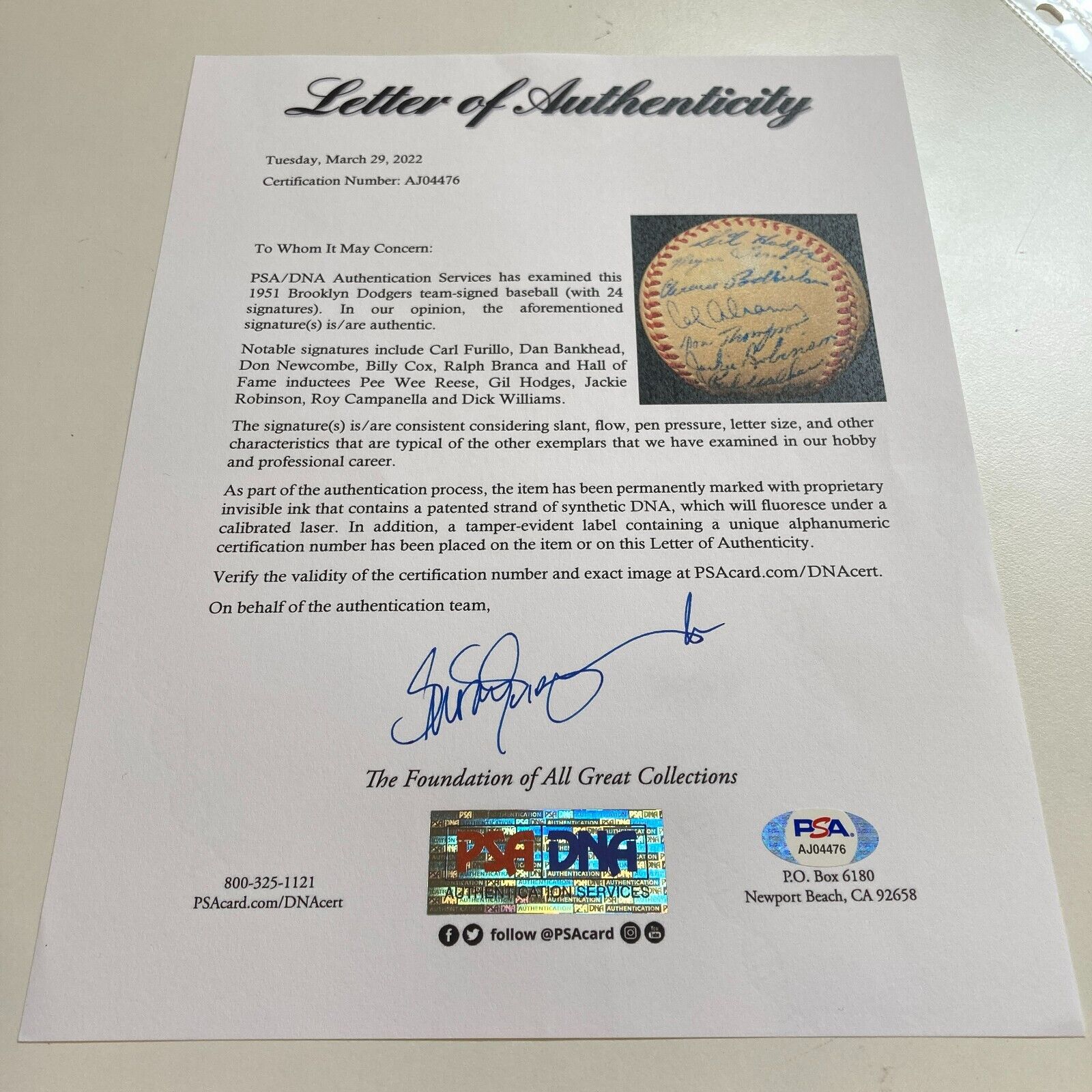 Bobby Thomson's "Shot" ended the Fall Classic dreams of this group of Bums but it's still effectively the same team that owned the National League for the better part of a decade. Presented in an Official National League ball autographed by twenty-five members of the Flatbush franchise. The signatures include: Bridges, Furillo, Chuck Dressen, Roy Campanella, Pafko, Palica, Dick Williams, Terwilliger (only year with team), Hodges, Abrams, Thompson, Jackie Robinson, Walker, Cox, Roe, Pee Wee Reese, Newcombe, King, Haugstad, Bankhead, Erskine and four more. Full LOA from PSA/DNA.