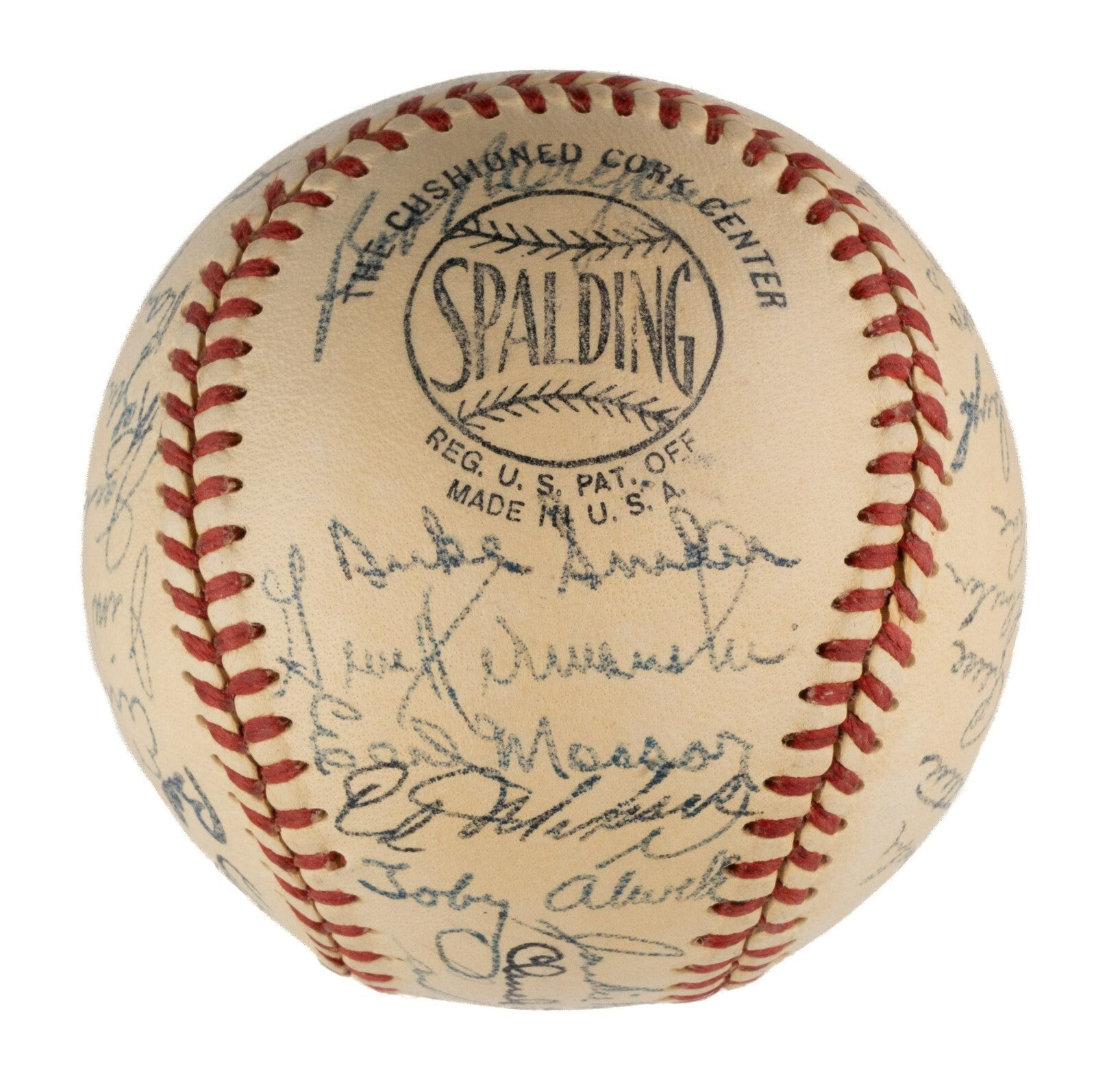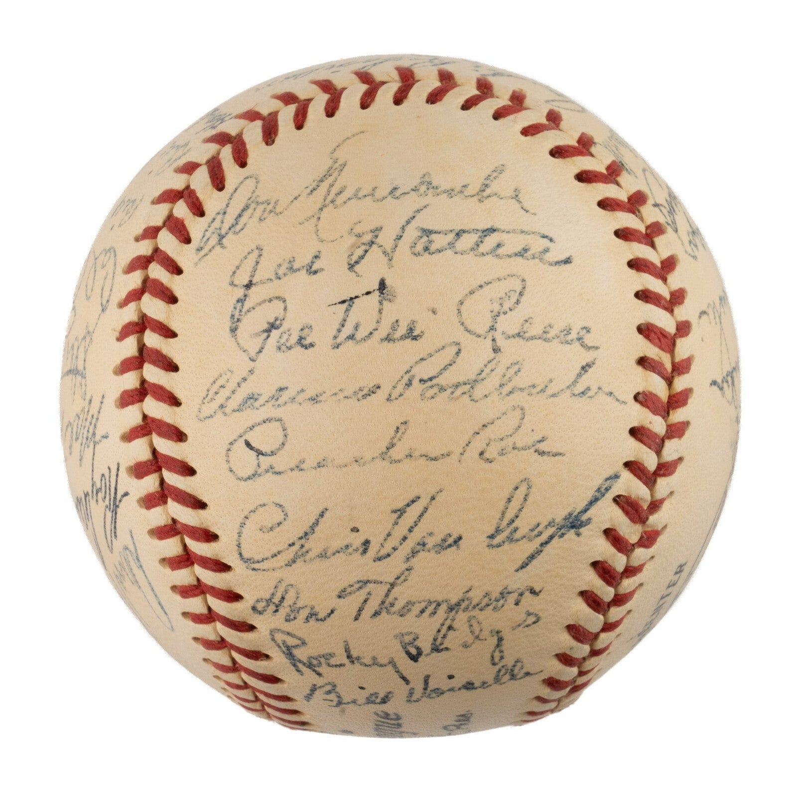 Official National League baseball (Frick) signed in blue ink by thirty-four members of the 1951 Brooklyn Dodgers. The signatures appearing on this ball are those of Jackie Robinson (sweet spot), Roy Campanella, Snider, Reese, Dressen (Mgr., sweet spot), Furillo, Hermanski, Mossor (played only in 1951), Miksis, Bankhead, Mallette (played only in 1950), Lembo (played in 1950 and 1952), Abrams, H. Edwards, Antonello (played only in 1953), Bill Sharman (HOF basketball player was part of the Dodgers minor league system from 1950-1955), Palica, Romano (played only in 1950), Banta (last season was 1950), Branca, Moore (played for Dodgers in 1952 and 1953), Barney, Newcombe, Hatten, Atwell (Dodgers minor league system 1949-1951), Podbielan, Van Cuyk, Thompson, Bridges, Morgan, Teed (played only in 1953), McCahan (Dodgers minor league system 1950), and Voiselle (Dodgers minor league system 1951). The signatures of Chuck Dressen and Preacher Roe have been deemed clubhouse by Beckett. The ball is in Excellent to Mint condition overall. Full LOA from Steve Grad and Brian Sobrero/Beckett Authentication Services.