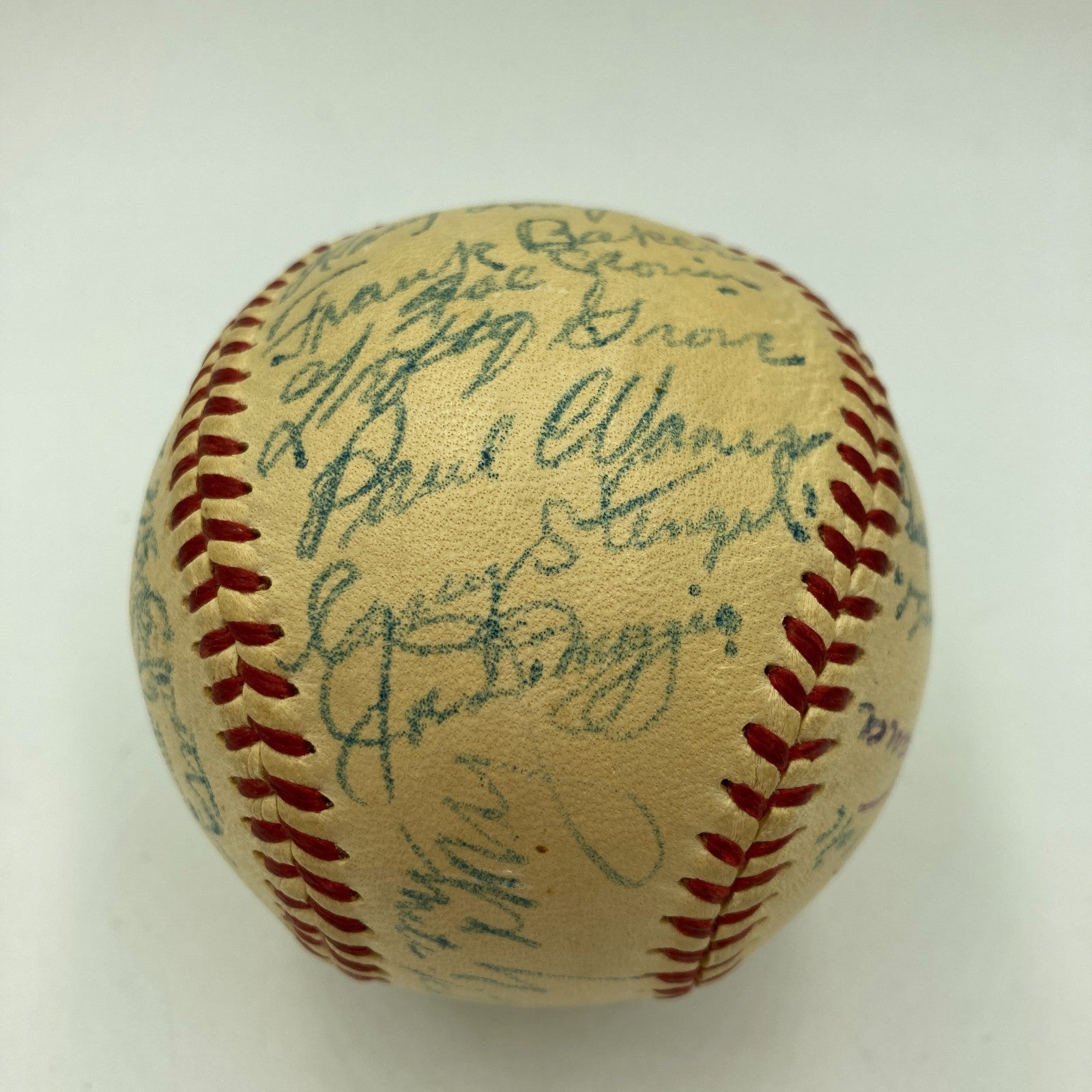 Beautiful 1950's Hall Of Fame Multi Signed Official American League Baseball. 27 signatures with:Cy Young (Sweet Spot), Harry Hooper, Home Run Baker, Joe Cronin, Lefty Grove, Paul Waner, Casey Stengel, Joe DiMaggio, Ed Walsh, Clark Griffith, Charlie Gehringer, Jimmie Foxx, Mickey Cochrane, Will Harridge, Fred Clarke, Duffy Lewis, Warren Giles, Joe McCarthy, Bill Dickey, Gabby Hartnett, Carl Hubbell, Ted Lyons, Dazzy Vance, Ford Frick, Tris Speaker, Mike Higgins and Larry Woodall.