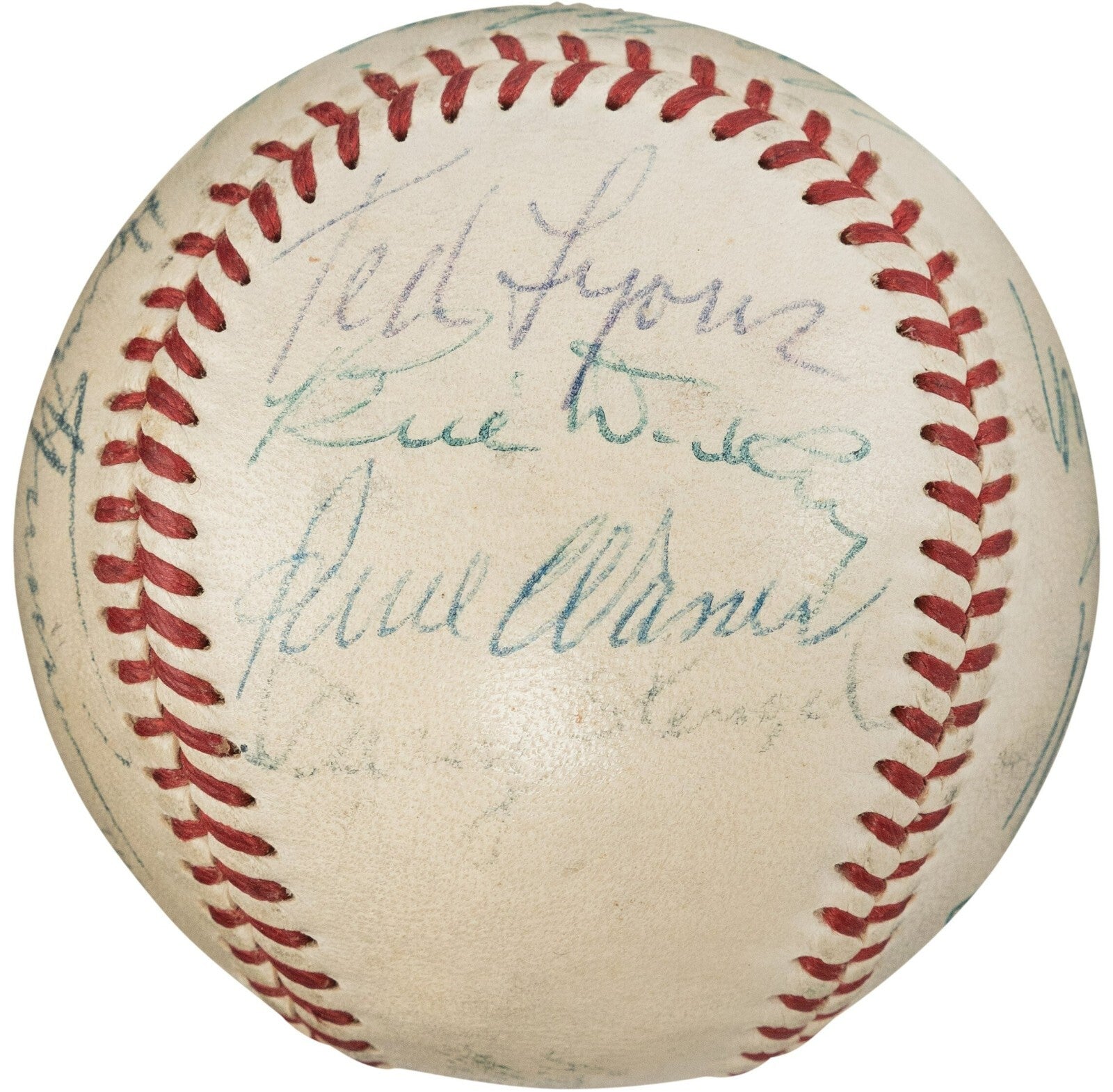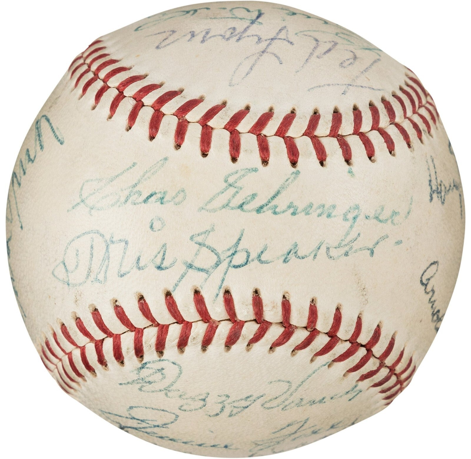 Almost all of the men who signed are Cooperstown residents. The ball is signed by some of the game's finest. Included are: Harry Truman, Arnold Johnson, Charlie Gehringer, Tris Speaker, Ty Cobb, Carl Hubbell, Frankie Frisch, Dazzy Vance, Jimmie Foxx, Ted Lyons, Bill Dickey, Paul Waner, Casey Stengel and one more. Full LOA from PSA/DNA. Full LOA from Beckett Authentication Services.