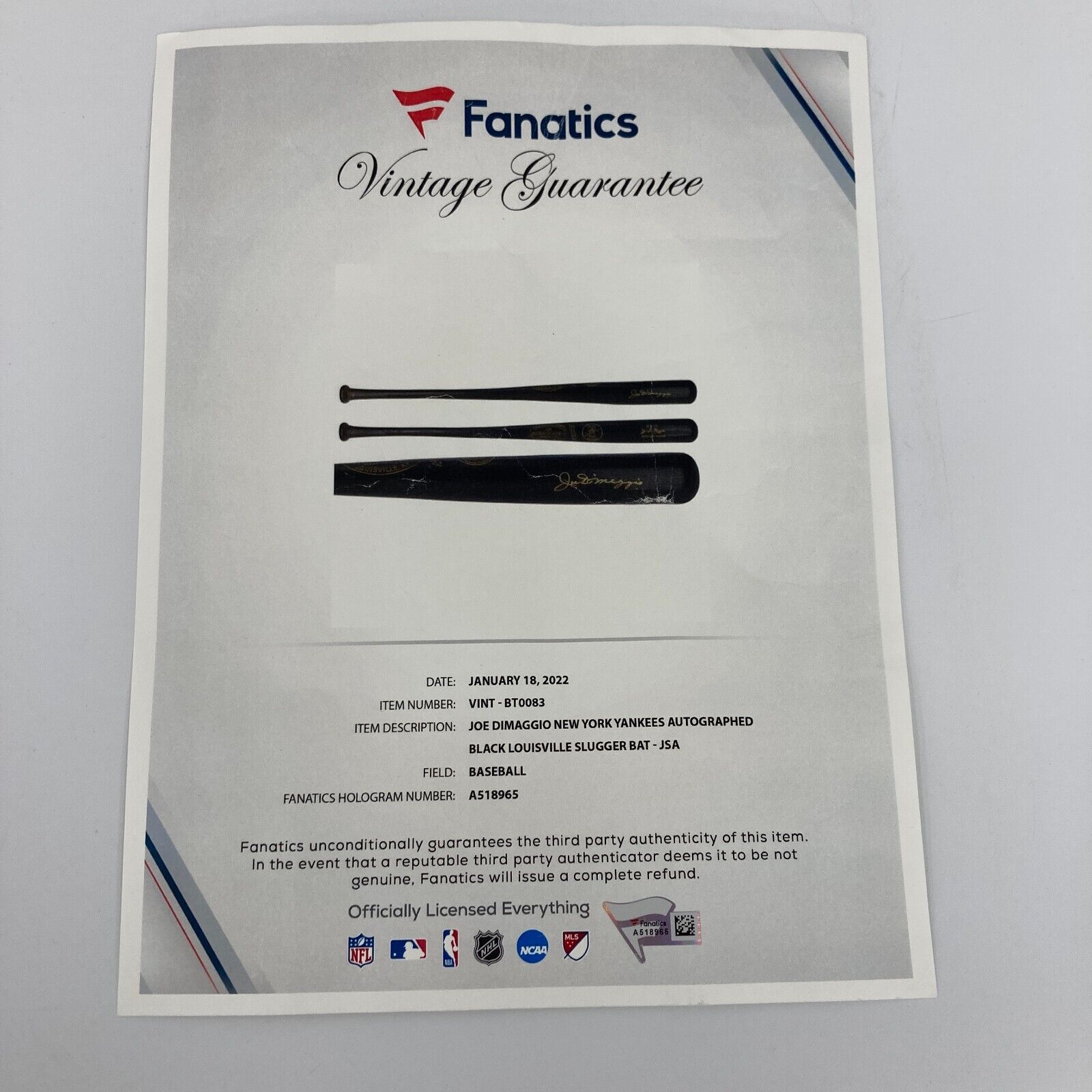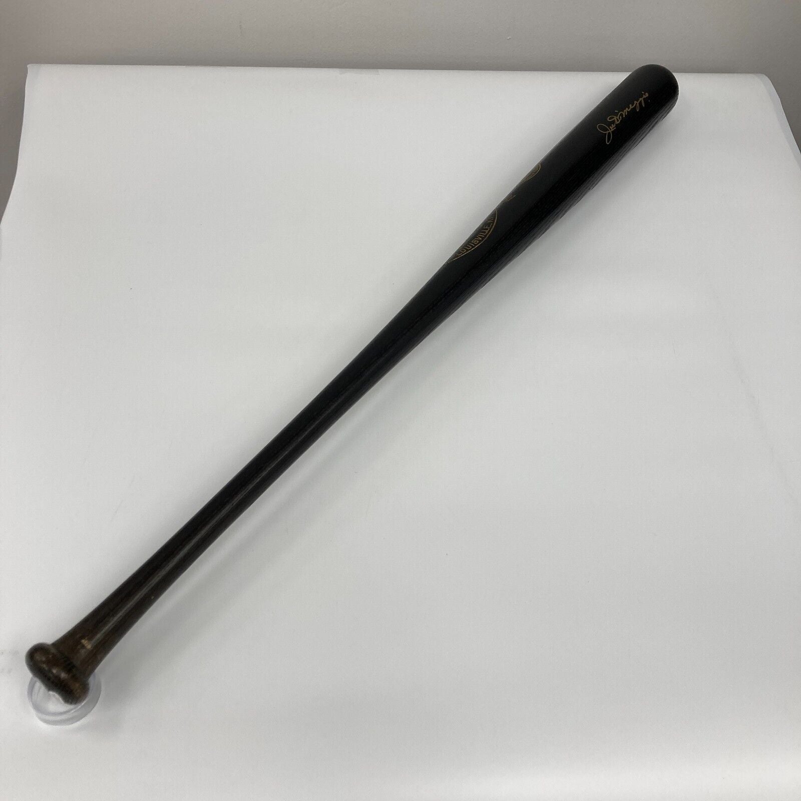 Hall of Famer Joe DiMaggio placed a clear and bold gold marker signature across the barrel of this offered Louisville Slugger 1776-1976 National Pastime Bicentennial player model bat. DiMaggio spent his post-baseball life being introduced around the country as "The Greatest Living Ballplayer." His MLB accolades—including his record 56-game hitting streak—are virtually endless, and bolstered by an incredible nine World Series titles. "The Yankee Clipper" was a peerless competitor who made the American League All-Star team in each of his 13 MLB seasons while posting a career slash line of .325/.398/.579. DiMaggio sacrificed three prime seasons to serve his country during World War II and was elected to the National Baseball Hall of Fame in 1955. Sadly, DiMaggio passed away in March 1999.