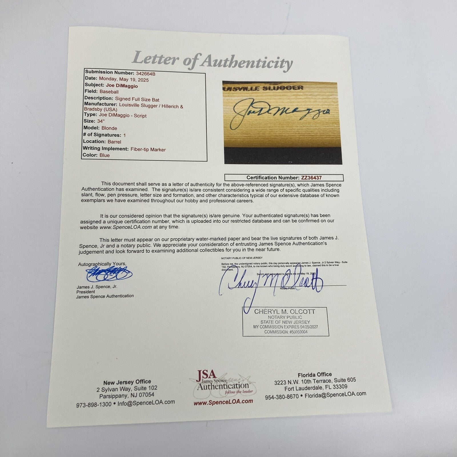 Beautiful Joe Dimaggio Signed Louisville Slugger Game Model Baseball Bat With Full Letter JSA COA