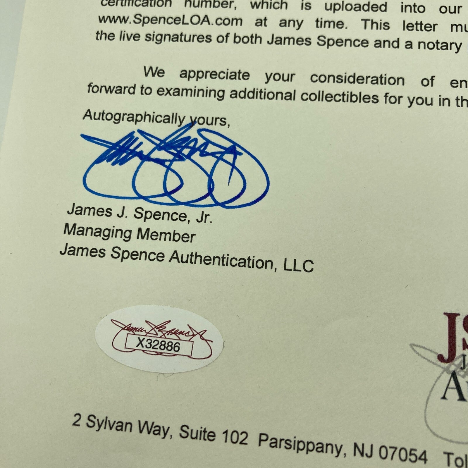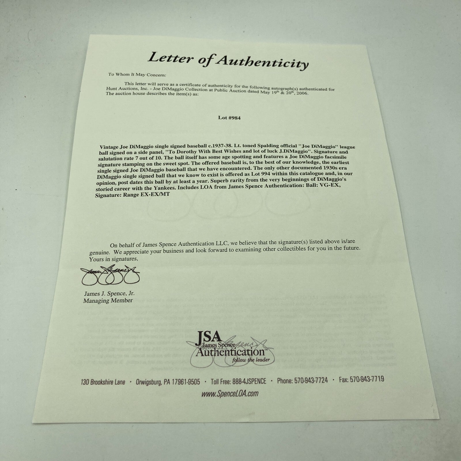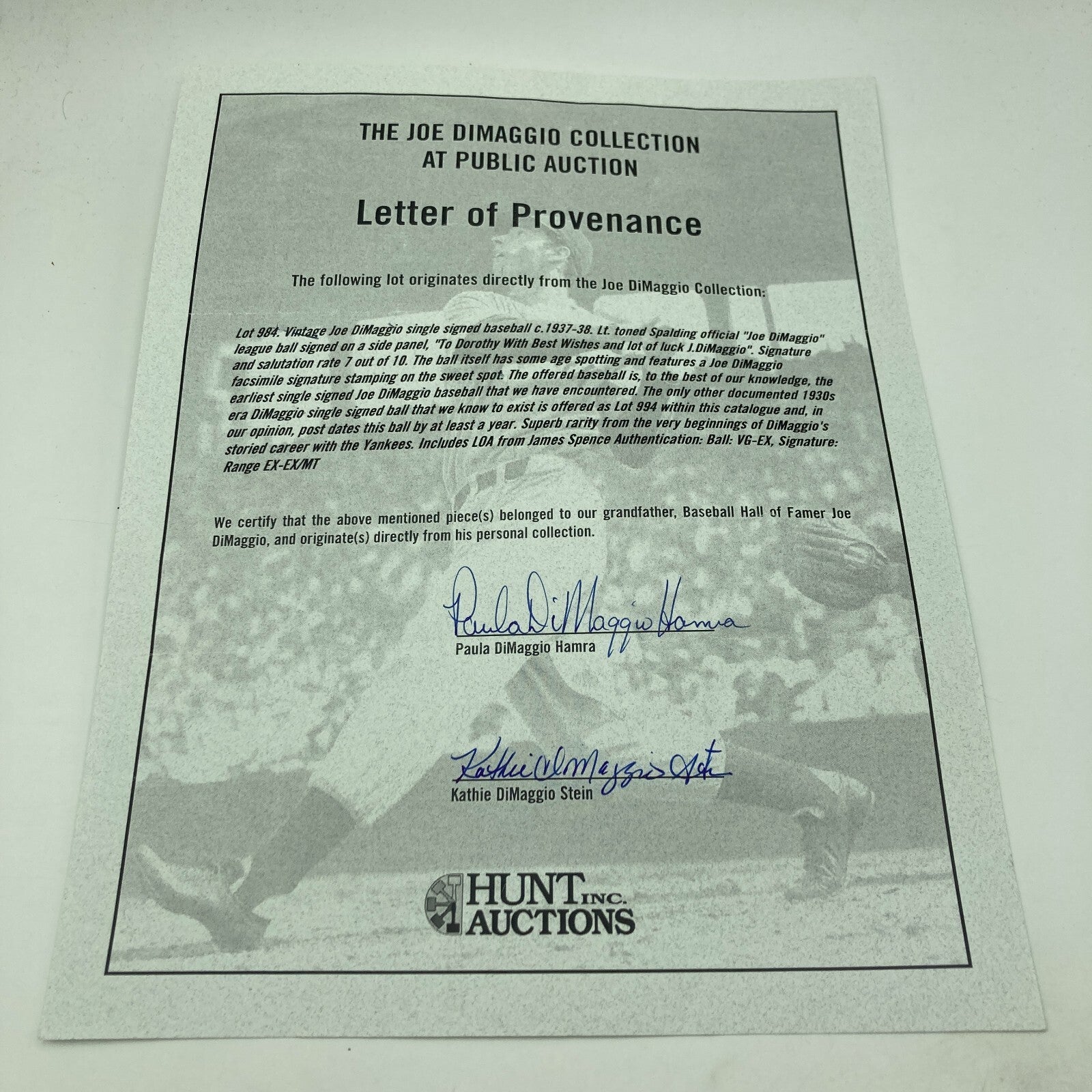 This is a single signed Spalding Baseball signed by Joe DiMaggio to his first wife Dorothy Arnold. It was likely given to her sometime around the time that they first met while working on the film Manhattan Merry-Go-Round in 1937. The ball is signed "To Dorothy, with best wishes and lots of luck - Joe Dimaggio" so it's likely that it was inscribed and signed early in their relationship before things got more familiar. The ball comes with two letters of authenticity from James Spence Authentication. The first is dated from 2006 when the ball was first offered for sale in the Joe DiMaggio collection at Public Auction conducted by Hunt Auctions. The second letter of authenticity is dated October 14, 2011 and comes with certification number X32886 as well as a photo of the ball on the certificate. This number can be used to cross reference the authenticity of the ball. The third document included with this ball is a letter of provenance signed by both of Joe DiMaggio's granddaughters. This ball came directly from Joe Dimaggio's collection. The granddaughters inherited the majority of his estate because his son, Joe DiMaggio jr was a drug addict. According to JSA, as of 2006 this was the earliest known single signed ball by DiMaggio.Single signed balls that date pre World War II are very scarce This one has rock solid provenance and is a must have for the serious collector.