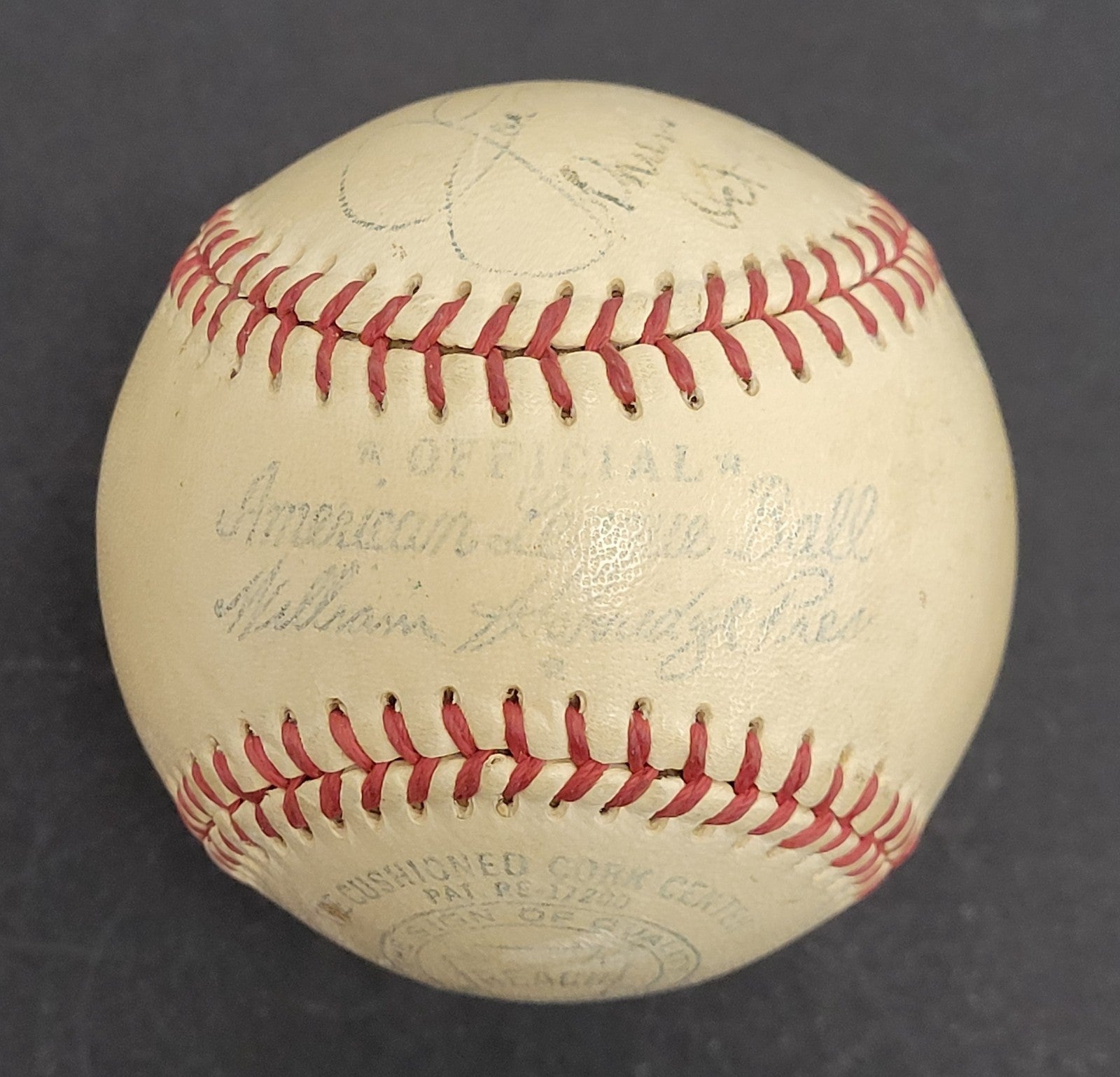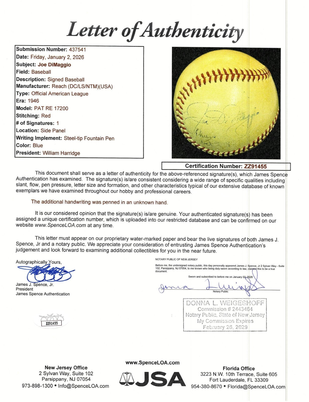 Rare Joe Dimaggio single signed Official American League (William Harridge) Baseball. Ball is dated Oct. 2, 1947 which was the date of game 3 of the 1947 World Series (Yankees VS Dodgers). Joe Dimaggio hit a home run in that game.