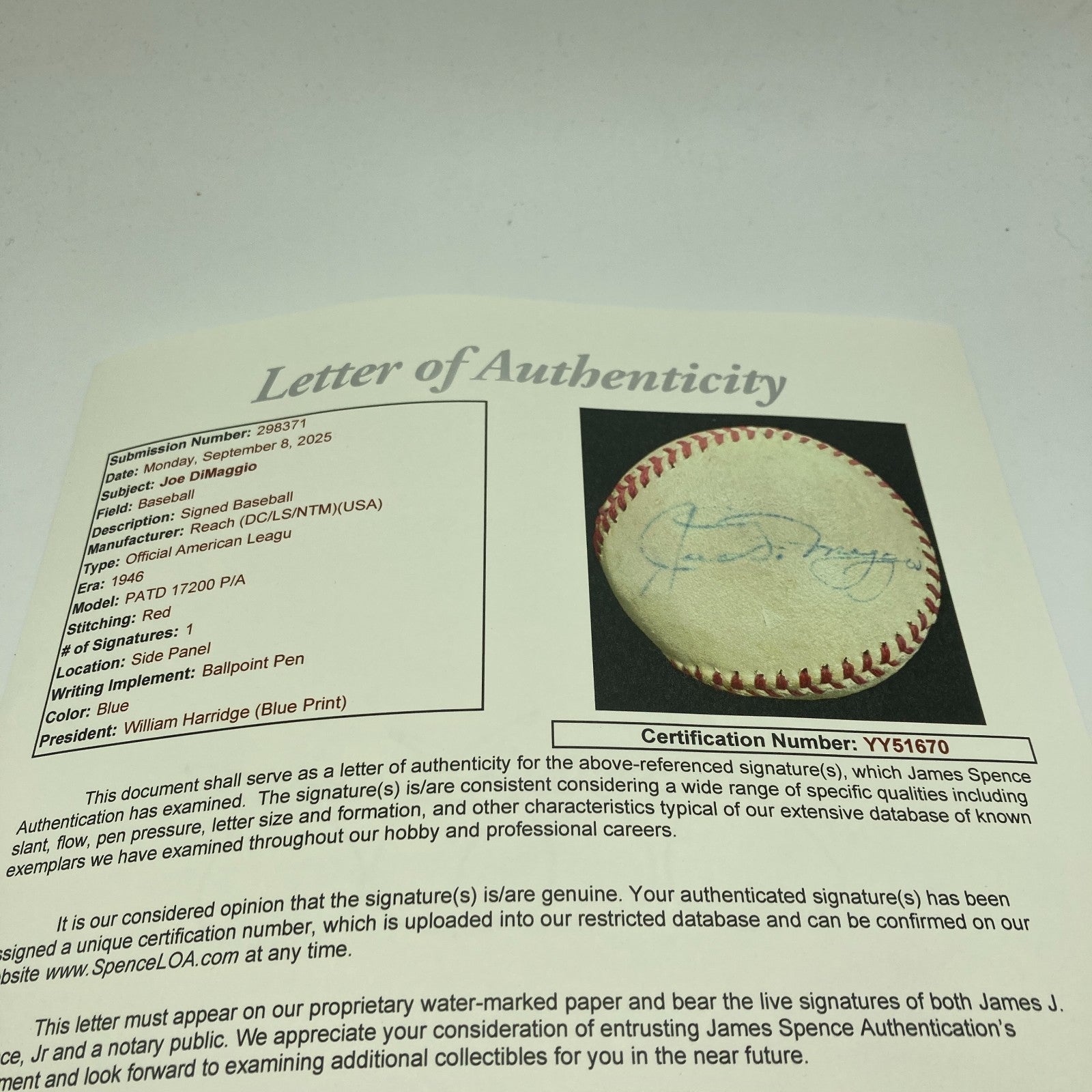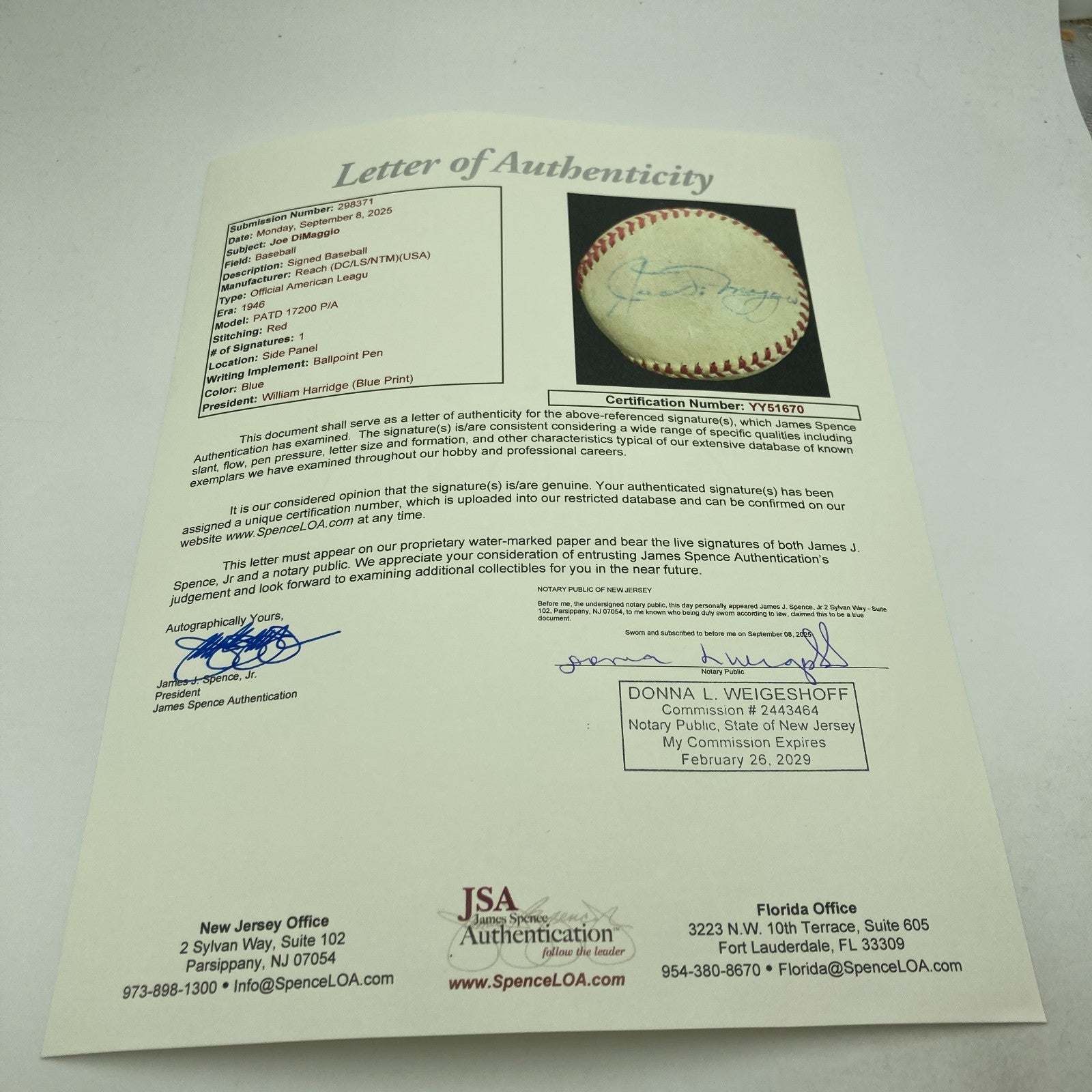 $1,999.00 Vintage 1940's Joe Dimaggio Single Signed Baseball JSA COA Vintage 1940's Joe Dimaggio Single Signed Official League Baseball JSA COA Comes with full letter JSA COA. D#49