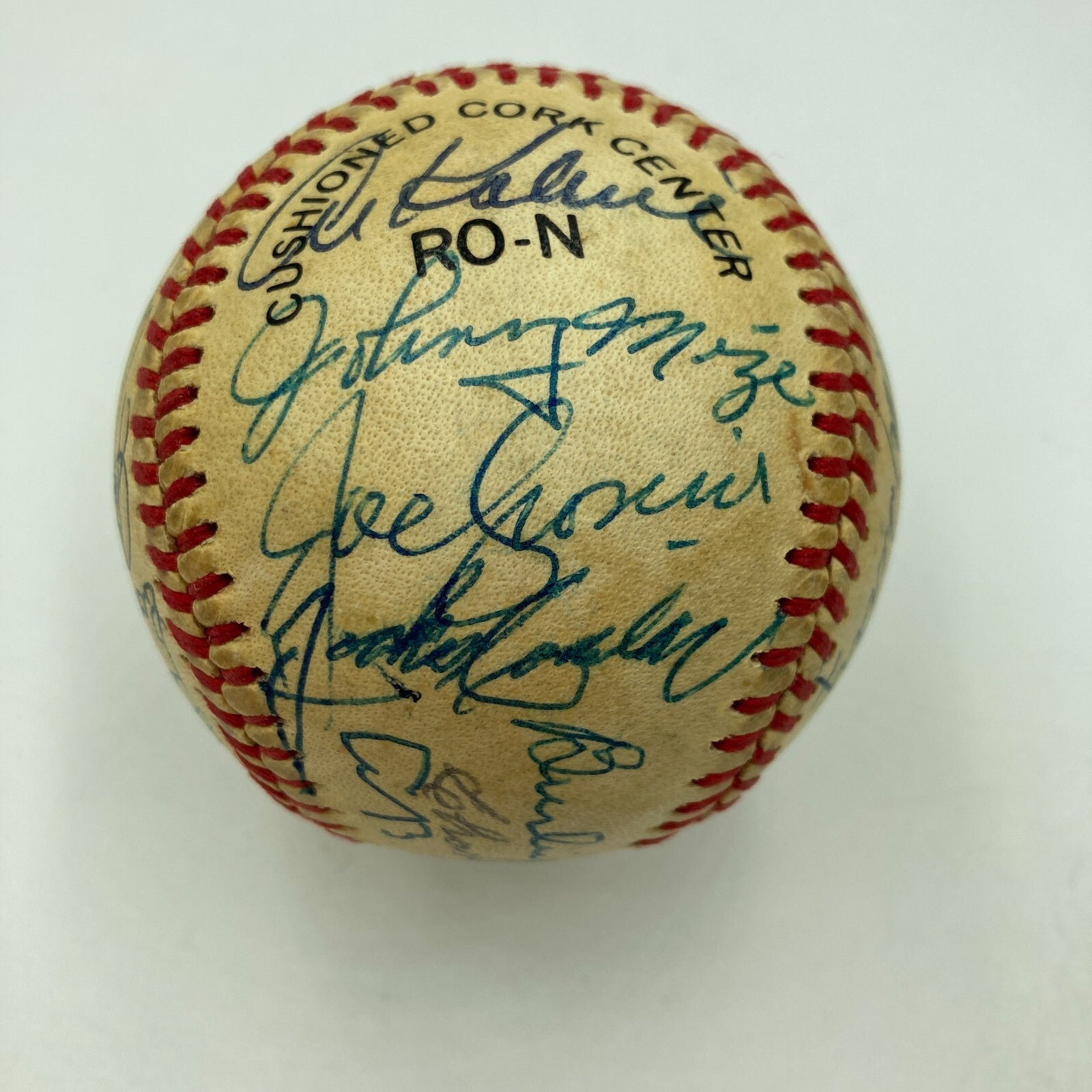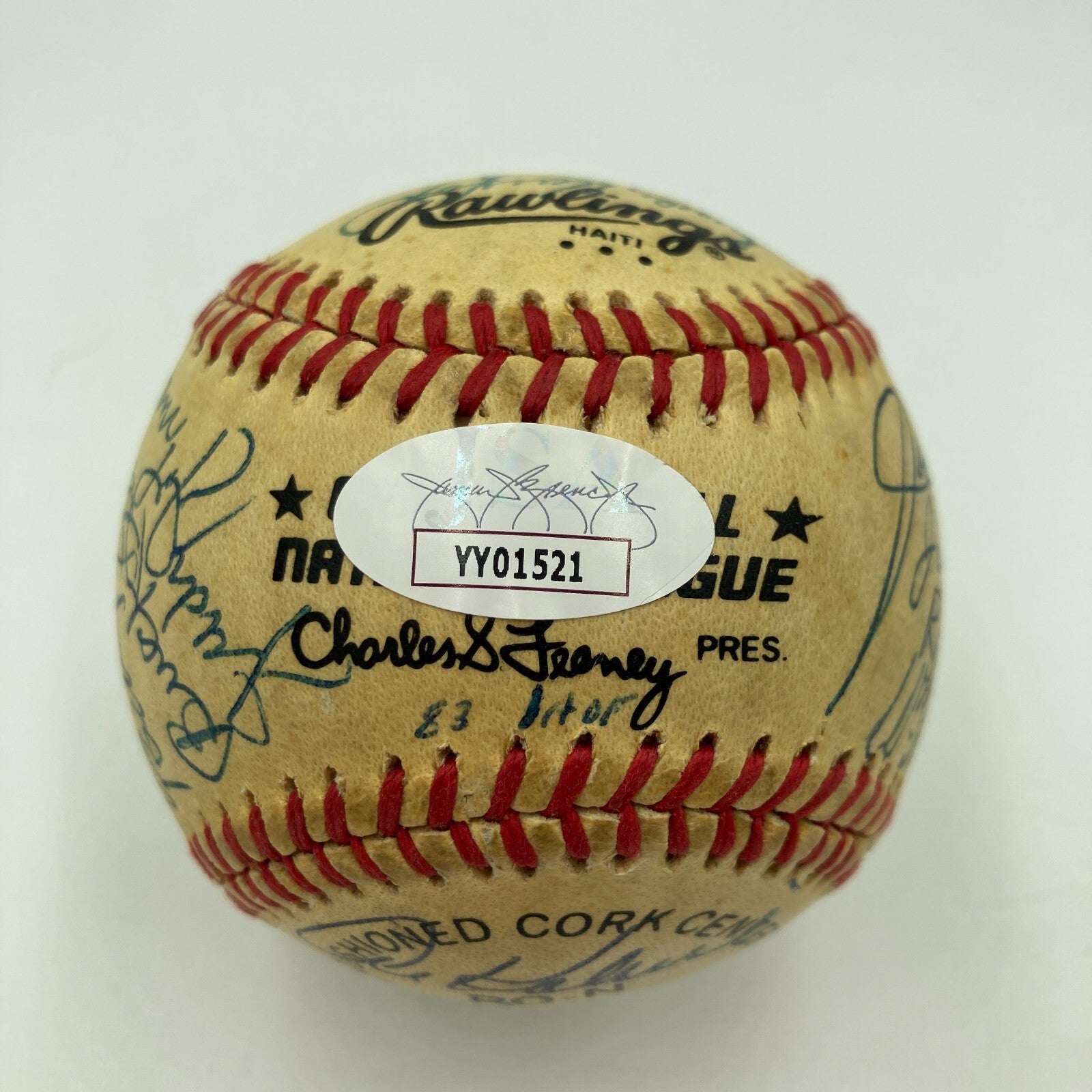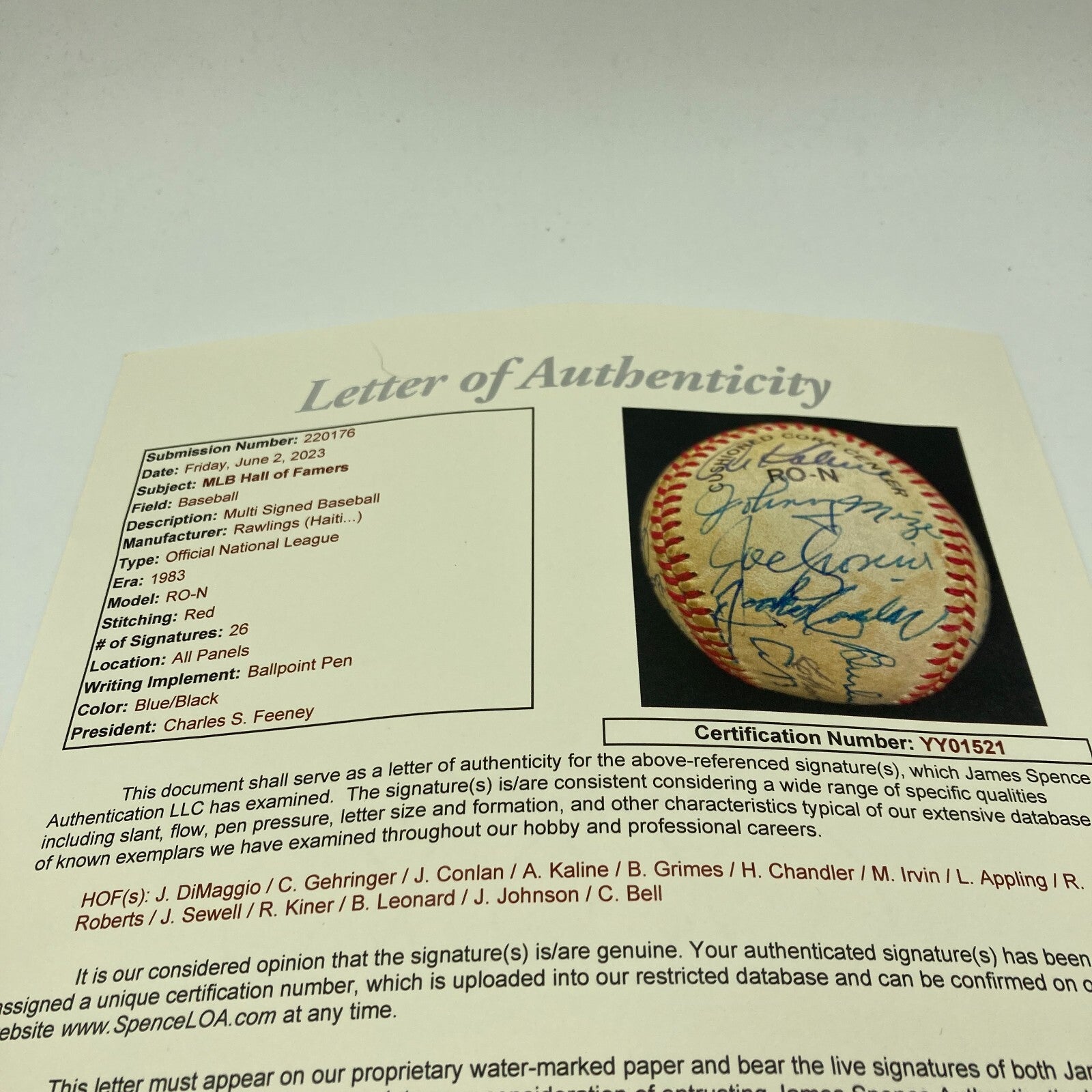 Offered is an Official National League Feeney baseball signed by 26 MLB Hall of Famers in blue ballpoint pen. Key signatures on the ball include those of Charlie Gehringer, Al Kaline, Joe DiMaggio, Bob Feller, Bill Dickey, Cool Papa Bell, Buck Leonard, Judy Johnson, Al Lopez, Ralph Kiner, Joe Sewell, Johnny Mize, Joe Cronin, Sandy Koufax, Duke Snider, Luke Appling, Monte Irvin, Burleigh Grimes, and Happy Chandler. The ball is accompanied by an LOA from JSA for the signatures.