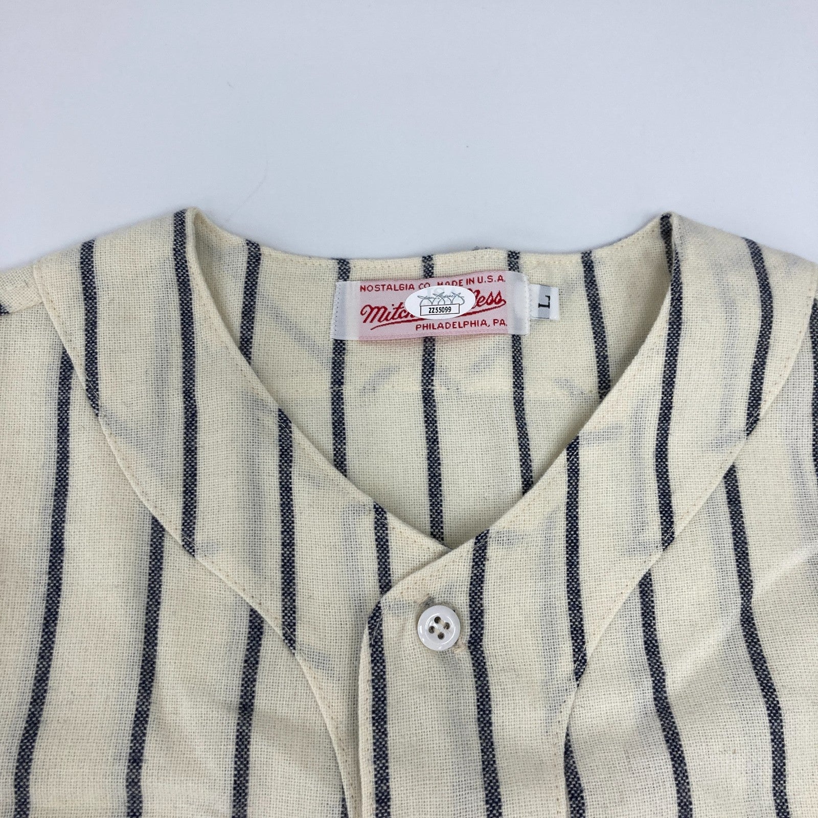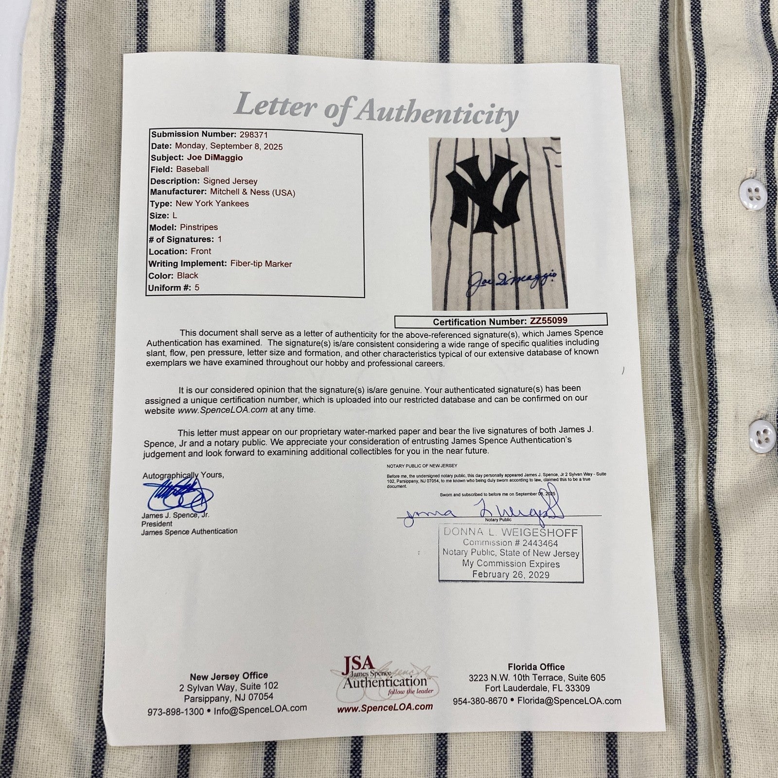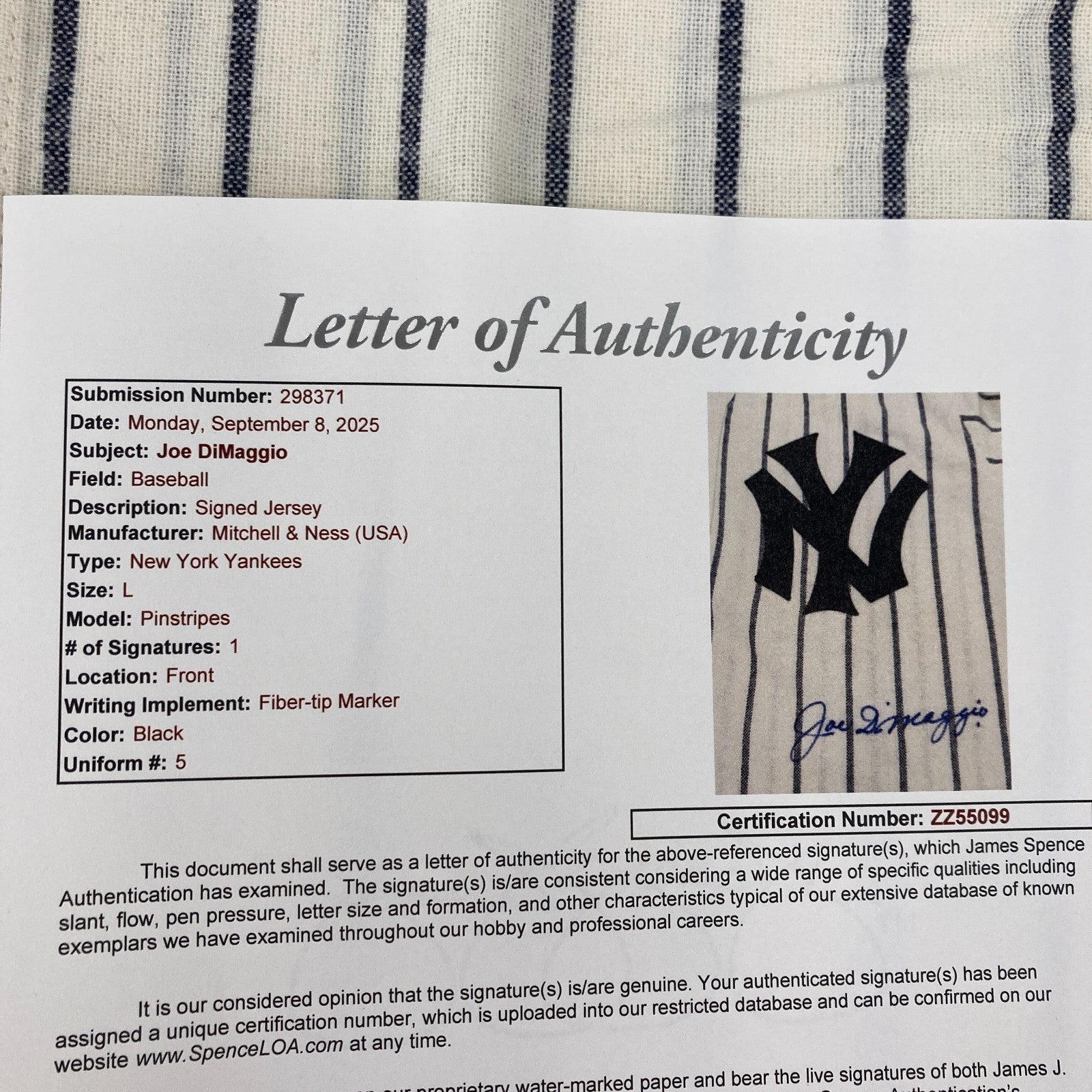 New York Yankees Joe DiMaggio Authentic jersey signed by DiMaggio along the front in blue marker. The Mitchell & Ness jersey (size L) is in Near Mint condition overall.