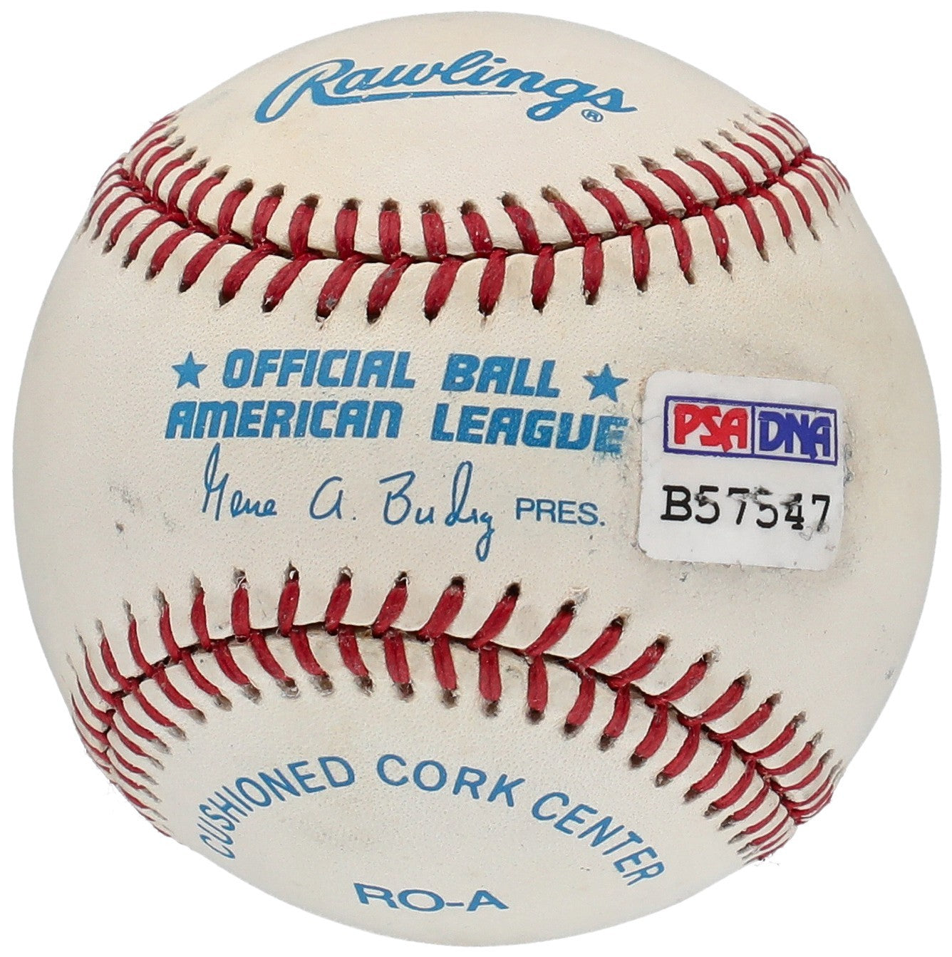 Hall of Famer. Presented is an Official American League (Budig) baseball signed by MLB legend and Yankees icon Joe DiMaggio. DiMaggio (1914-1999) is considered one of the greatest players in baseball history, with 13 MLB All-Star appearances. DiMaggio is a three-time American League MVP, and helped lead the New York Yankees to nine World Series Championship victories (1936–1939, 1941, 1947, 1949–1951). In 1941, DiMaggio would set the Major League record for consecutive games with a base hit (56 games from May 15 – July 16, 1941), a record which many claim to be "unbreakable." DiMaggio has penned his blue ink signature across the sweet spot on this baseball. The ball is accompanied by an LOA from PSA/DNA, which gave the autograph the grade of Auto 10, the ball the grade of 9, for an overall grade of 9.5 (81321947).