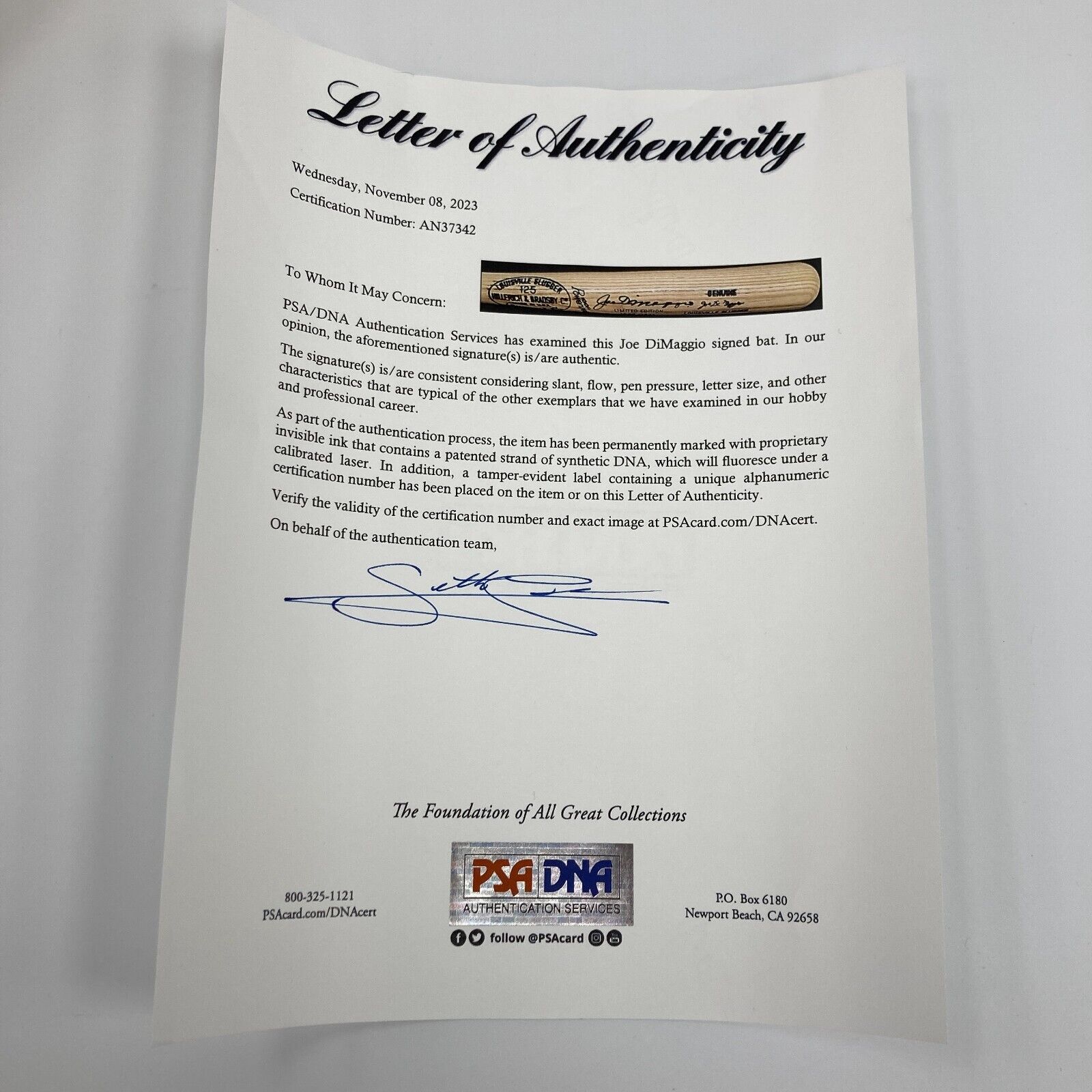 Hall of Famer Joe DiMaggio placed a flowing and bold blue fiber-tip marker signature across the barrel of this offered Louisville Slugger limited edition (#1089/1941) bat. DiMaggio spent his post-baseball life being introduced around the country as "The Greatest Living Ballplayer." His MLB accolades—including his 56-game hitting streak—are virtually endless, bolstered by an incredible nine World Series titles. "The Yankee Clipper" was a peerless competitor who made the American League All-Star team in each of his 13 MLB seasons while posting a career slash line of .325/.398/.579. DiMaggio sacrificed three prime seasons to serve his country during World War II and was elected to the National Baseball Hall of Fame in 1955. Sadly, DiMaggio passed away in March 1999. Comes with LOAs from PSA/DNA and JSA for DiMaggio's signature.