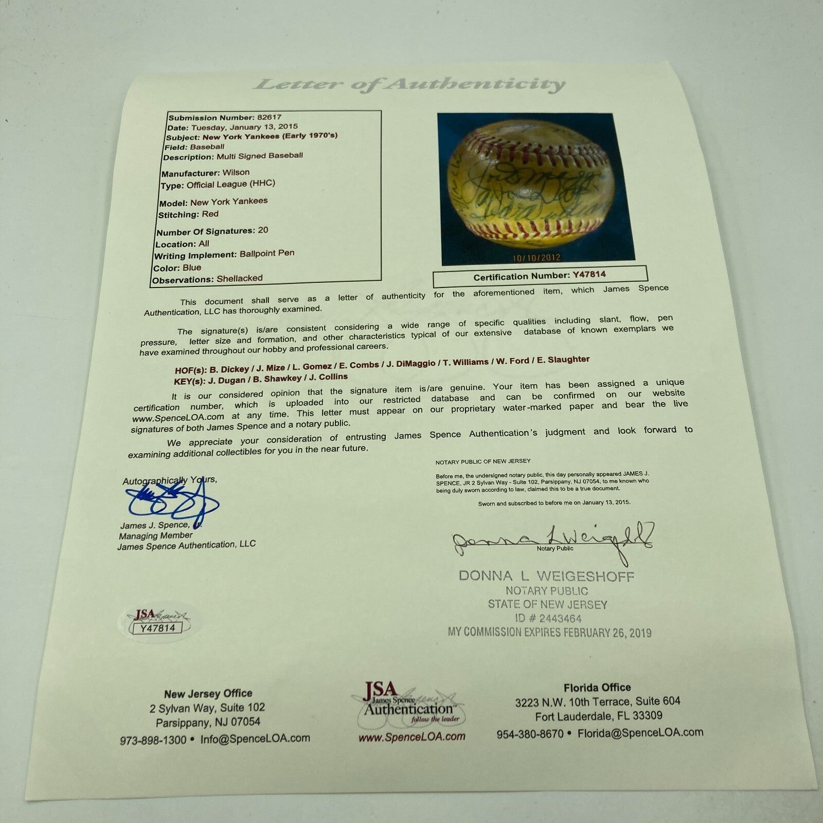 1970's New York Yankees Old Timers Day Signed vintage Wilson Yankees baseball. 20 signatures with Joe Dimaggio, Ted Williams, Lefty Gomez, Earle Combs, Whitey Ford, Enos Slaughter, Joe Dugan, Bob Shawkey, J. Collins and others.
