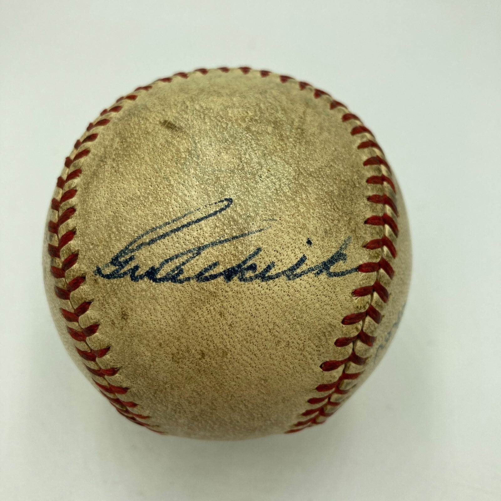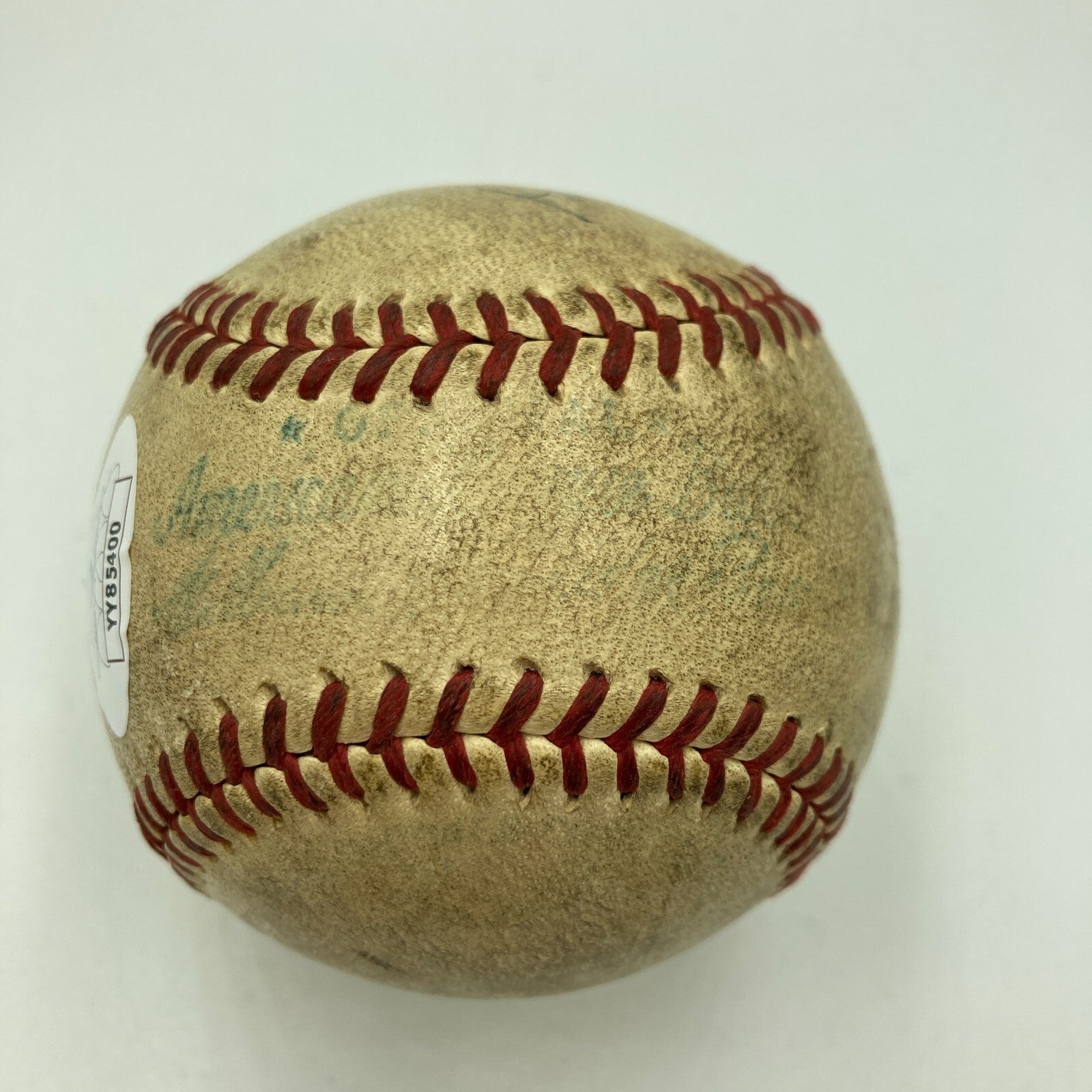 This unique autographed baseball features the Joe DiMaggio and Toots Shor together on one panel which displays very well. Shor owned a very popular restaurant in New York which DiMaggio and many other celebrities regularly visited for many years. The ball, which is also signed by George Selkirk, Jay Flippen and H. Mac Mahon. Includes the original Westclock Baby Ben watch box the ball was stored in for the last 80+ years..