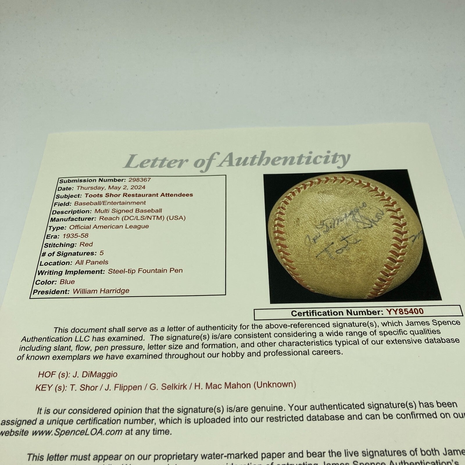 Circa 1939 Joe DiMaggio & Toots Shor Multi Signed Official American League Harridge Game Baseball.