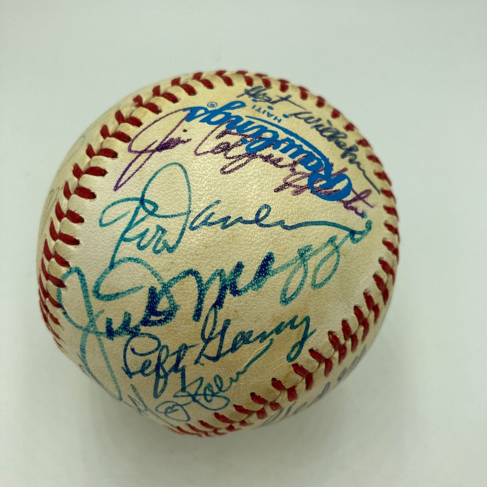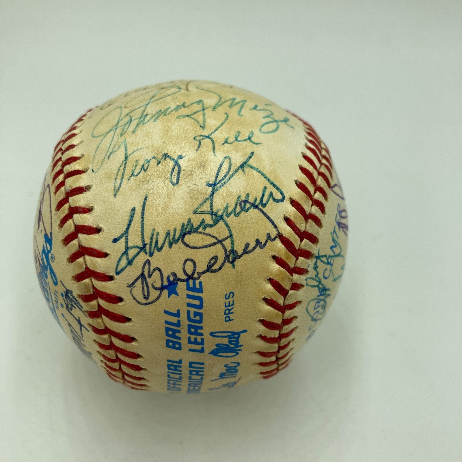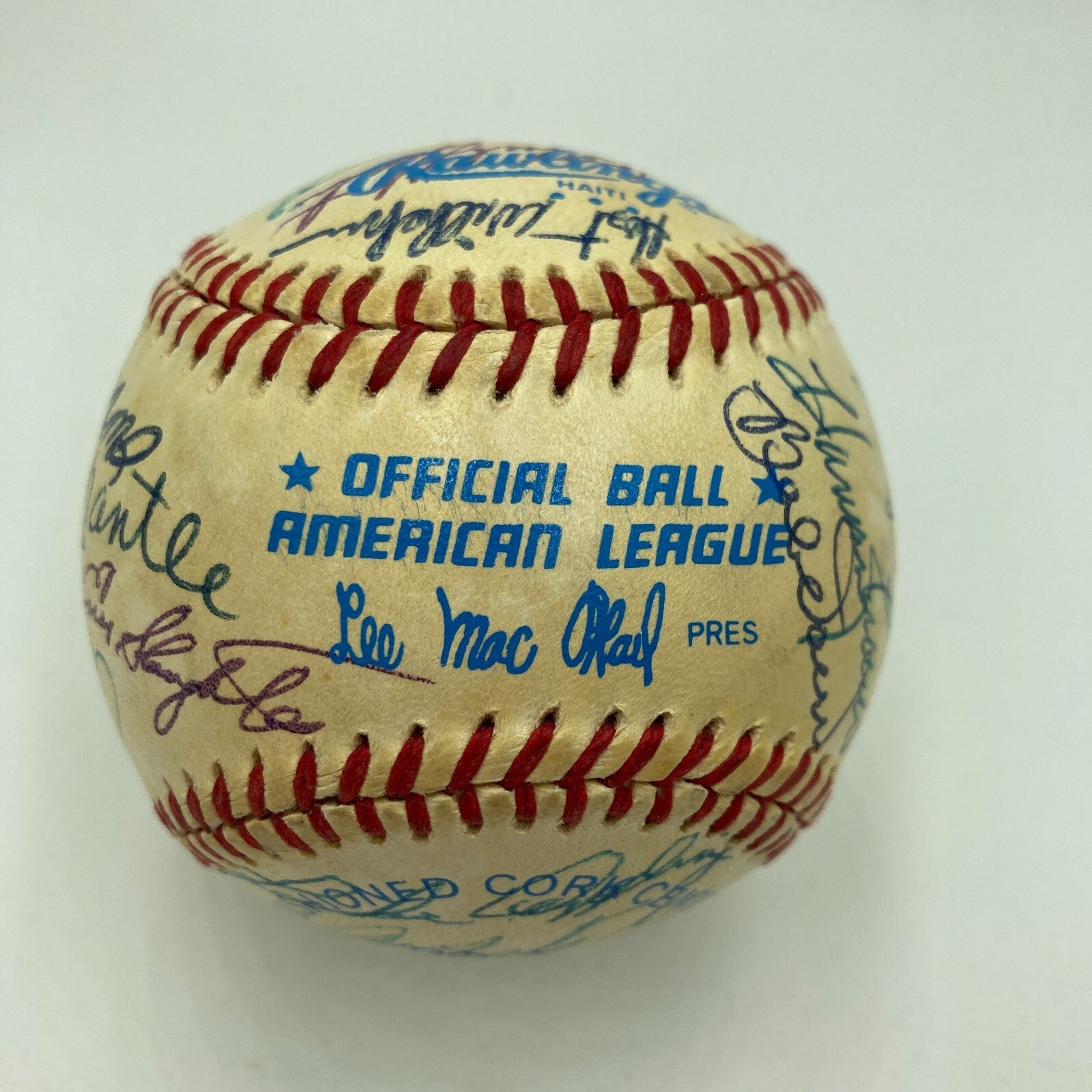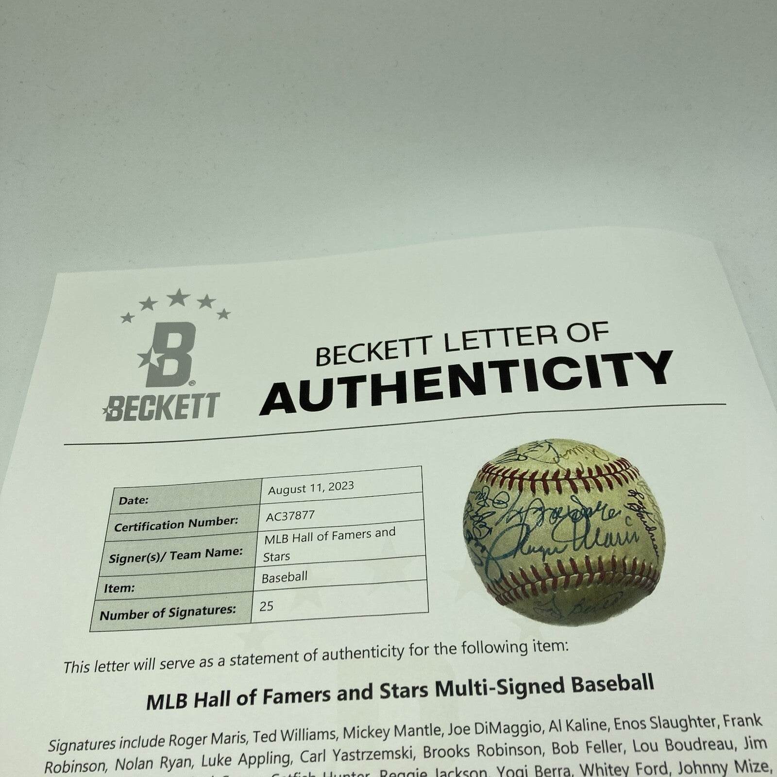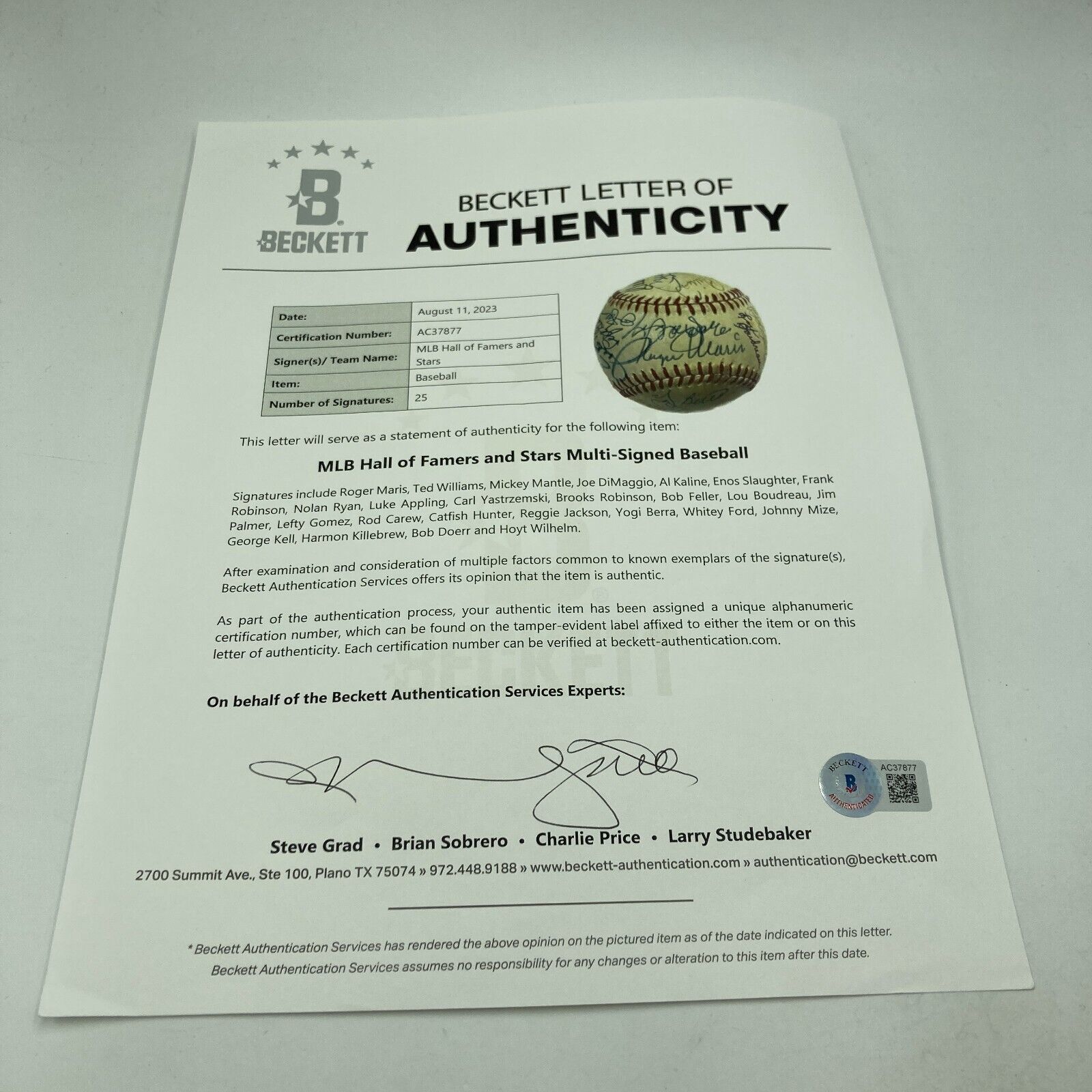 This offered Official American League Lee MacPhail baseball contains 25 signatures from some of the greatest Hall of Famers and stars to step foot on an MLB diamond. The ball includes signatures from Hall of Famers Mickey Mantle, Ted Williams, Joe DiMaggio, Roger Maris, Lefty Gomez, Jim "Catfish" Hunter, Hoyt Wilhelm, Bob Feller, Lou Boudreau, Nolan Ryan, Yogi Berra, and Whitey Ford. The ball displays a moderate amount of toning and comes with an LOA from Beckett Authentication for the signatures.
