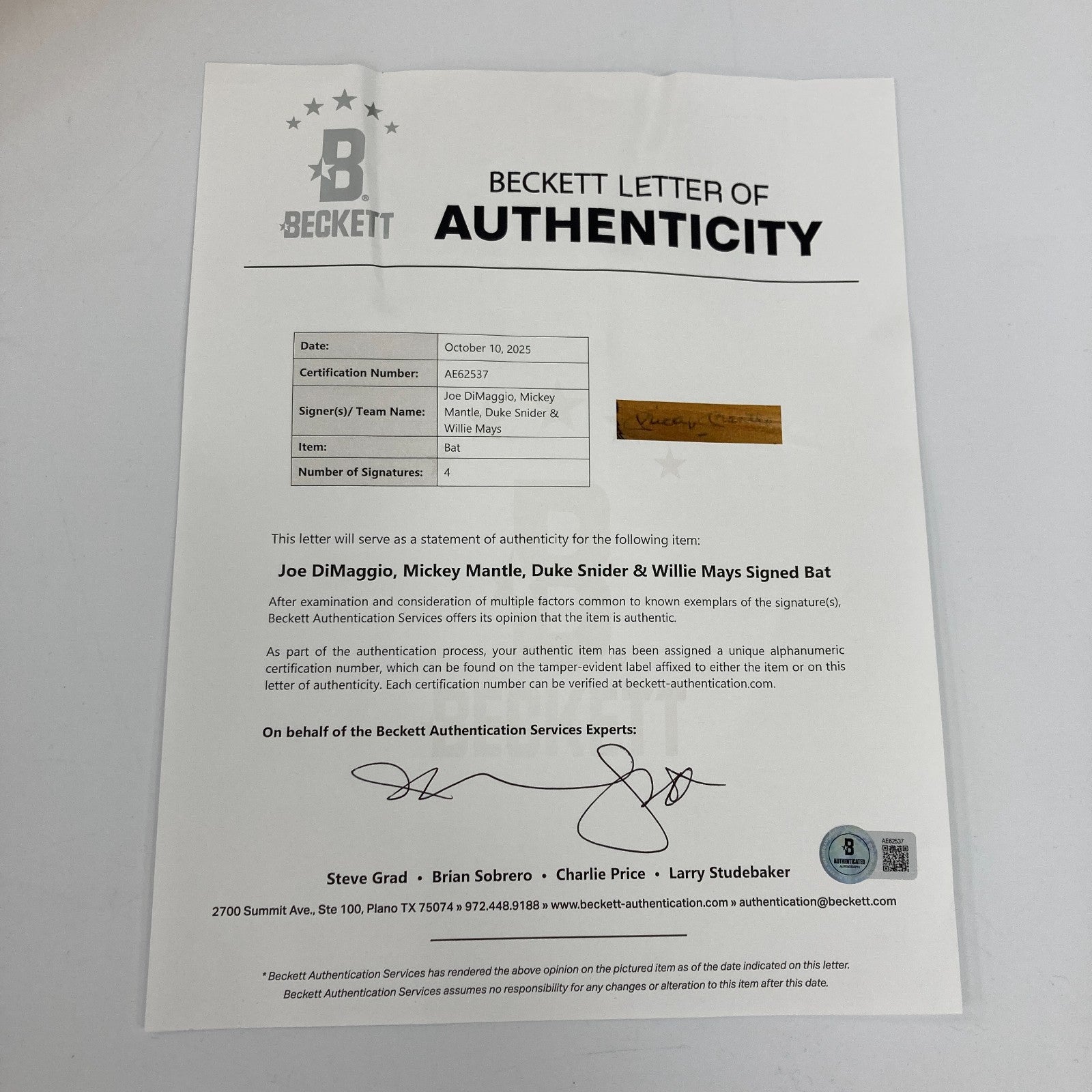 Presented is a Louisville Slugger Hillerich & Bradsby model baseball bat that has been signed by some of the most iconic sluggers in baseball history. Mickey Mantle, Willie Mays, Joe DiMaggio, and Duke Snider have each penned their flowing signatures in blue ink across the bat's barrel. Affixed to the knob of the bat is a sticker from PSA/DNA (A01282). Comes with full LOA from Beckett for all the signatures.