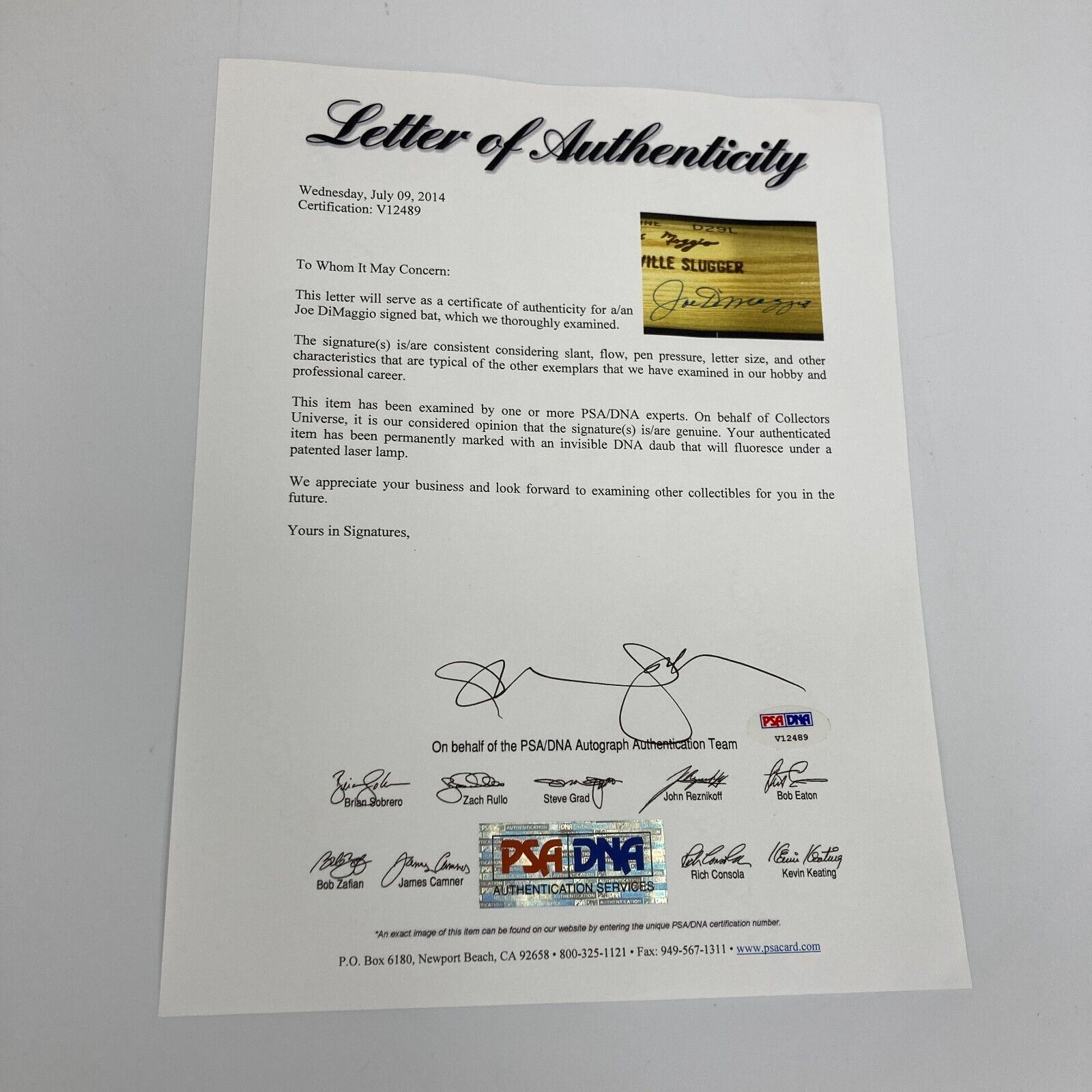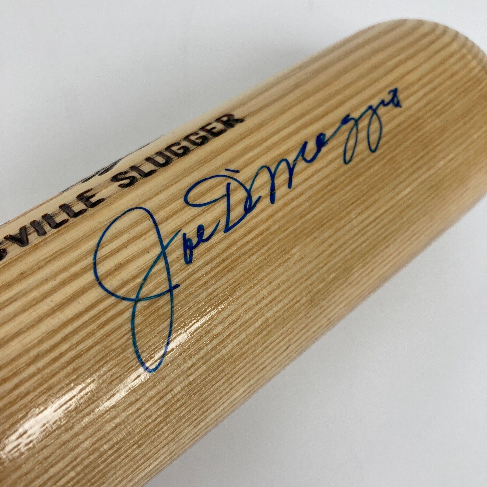 You will always find Joe DiMaggio on the short list of baseball's greatest heroes. DiMaggio provided the New York Yankees lineup with some serious clout during his 13-year MLB career, and here he provides some considerable clout to the hobby, with this single-signed bat. This like-new bat is a Louisville Slugger Genuine D29L DiMaggio signature model, signed in blue by DiMaggio with ("9") strength on the barrel, below the burned-in facsimile example of his autograph. Signature is MINT.