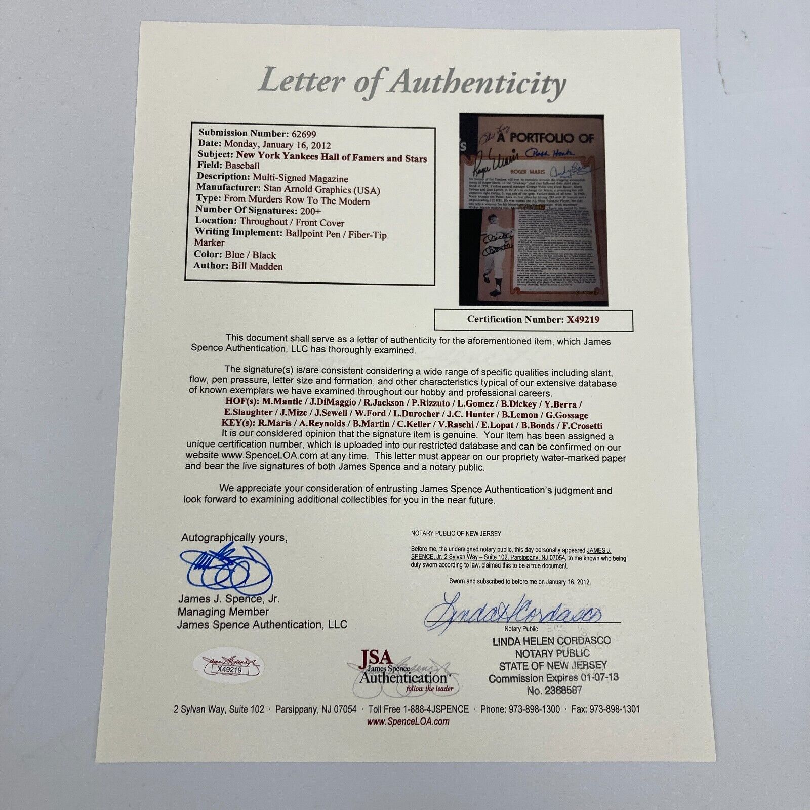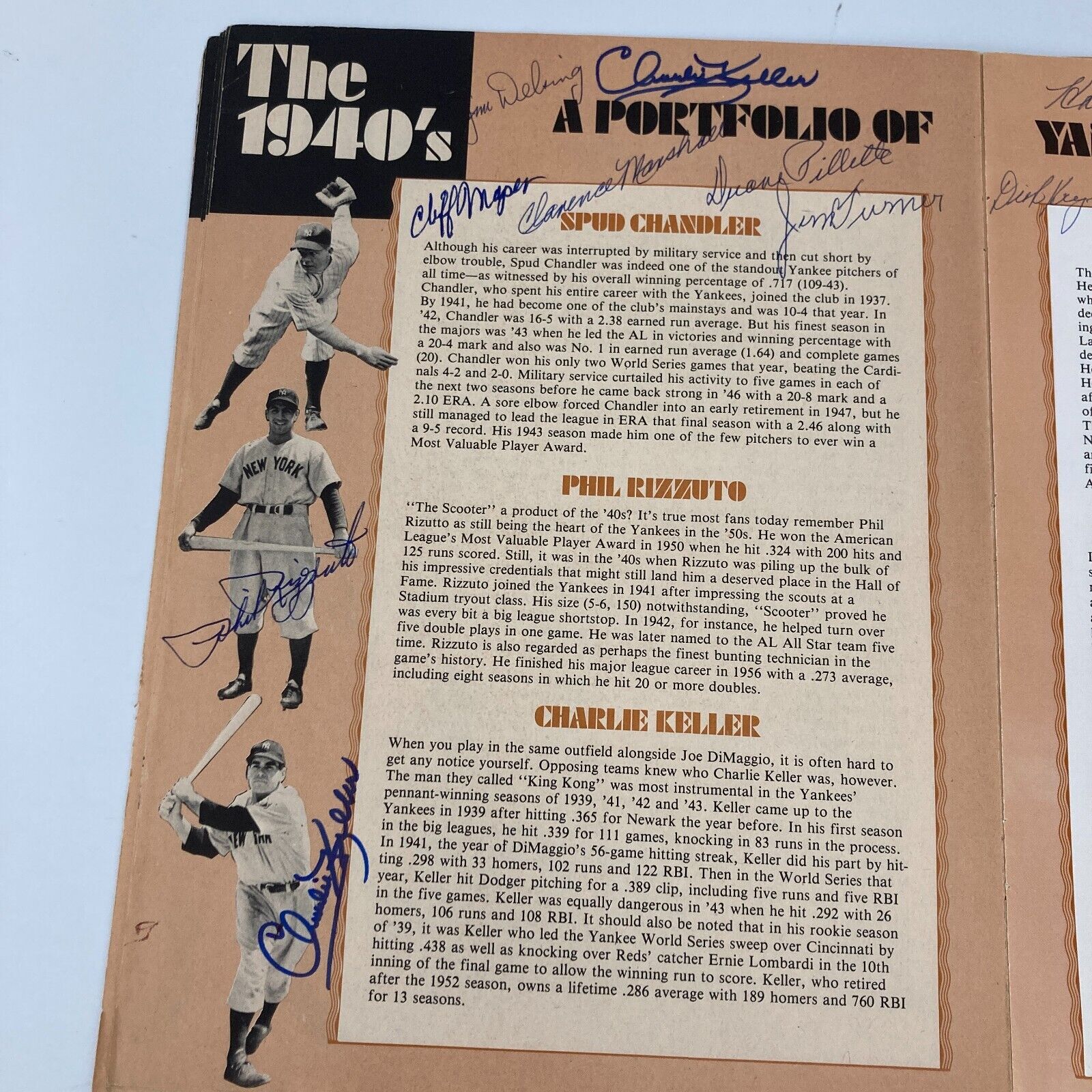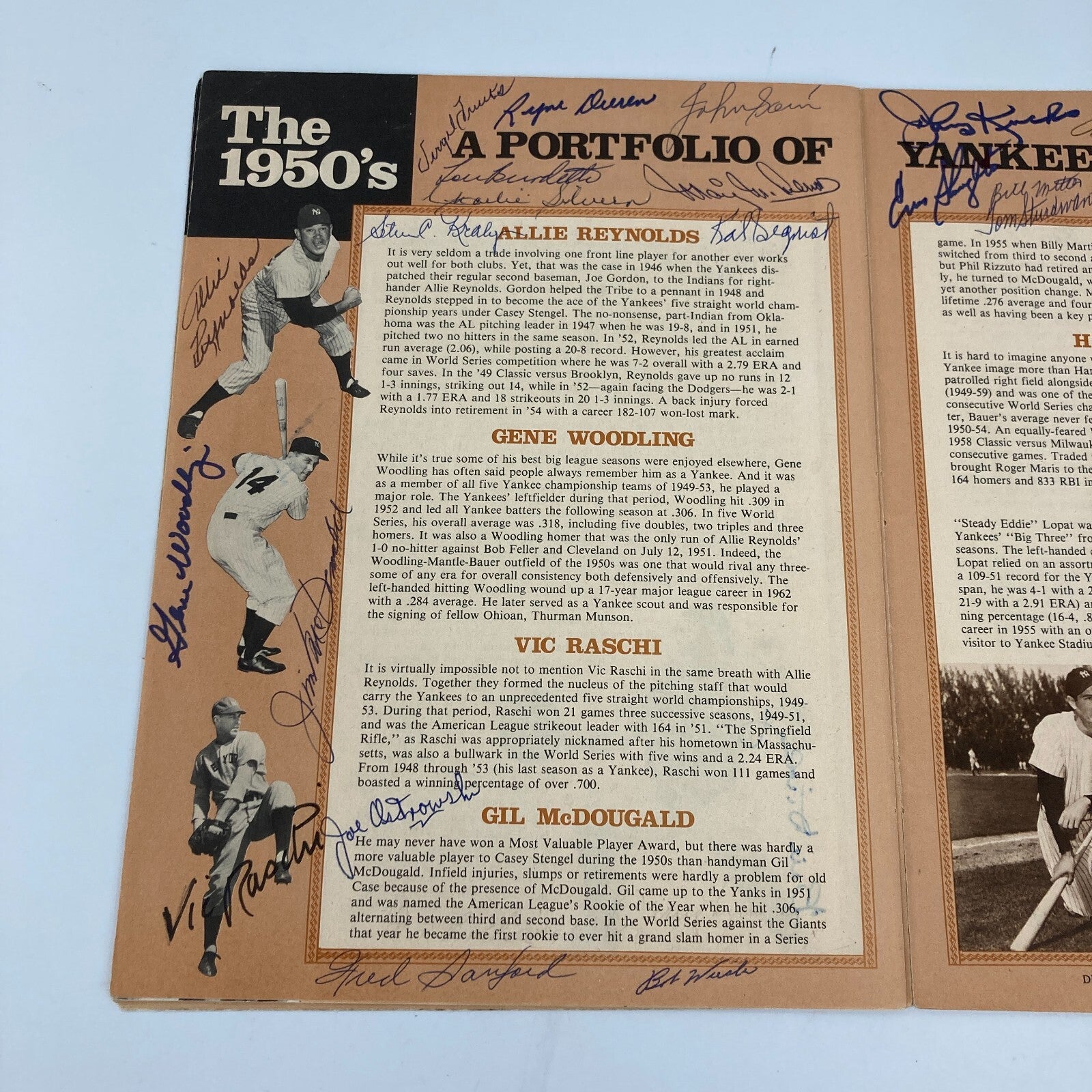 The Hall of Famers who signed the magazine include: Mickey Mantle, Joe DiMaggio, Reggie Jackson, Phil Rizzuto, Lefty Gomez, Bill Dickey, Yogi Berra, Slaughter, Mize, Sewell, Ford, Durocher, J.C. Hunter, Lemon and Gossage.