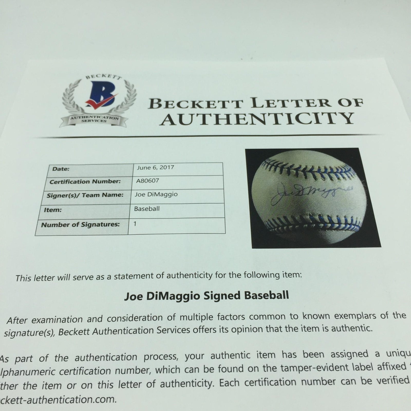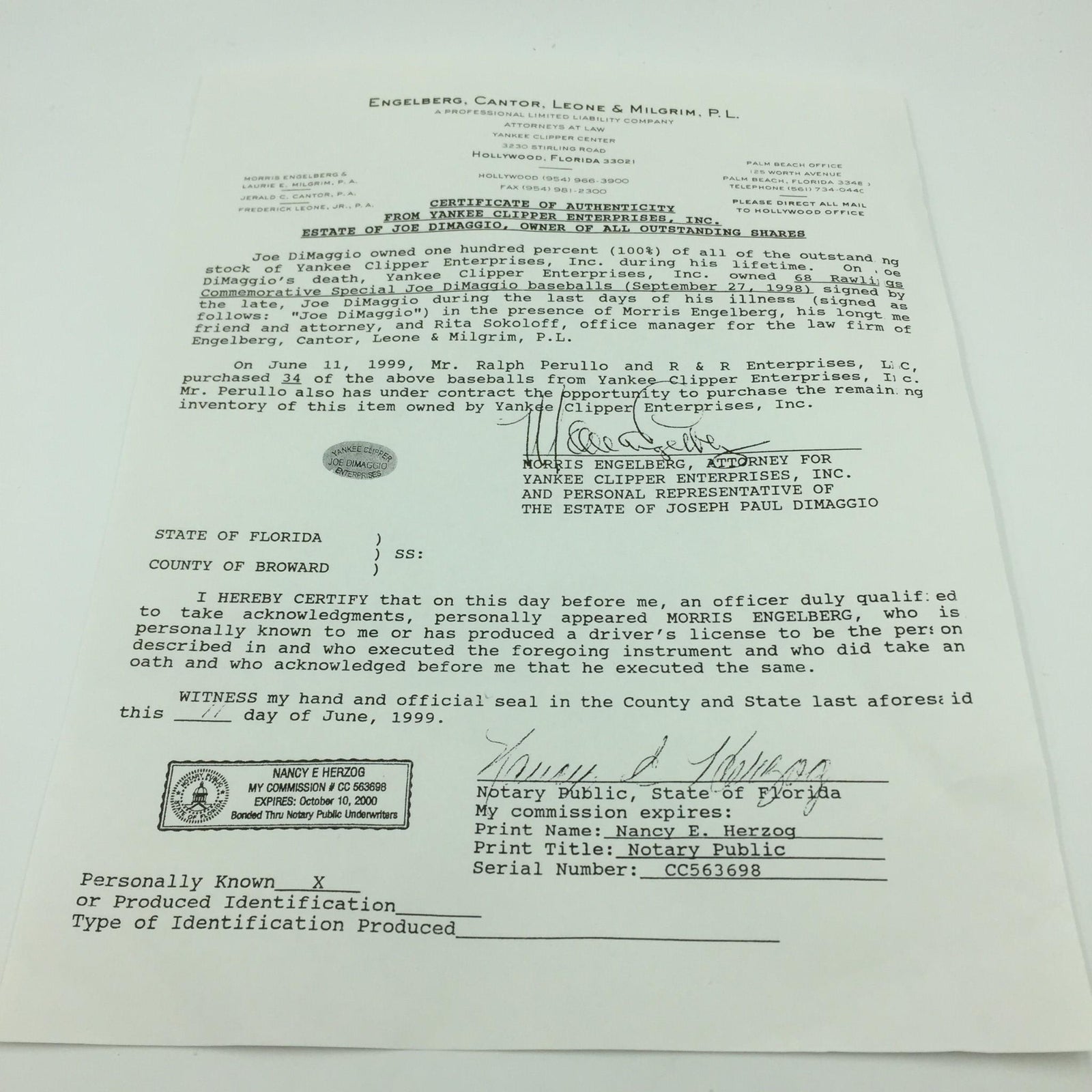 RARE Joe Dimaggio "Death Bed" Signed 1998 Joe Dimaggio Day Baseball Beckett JSA.