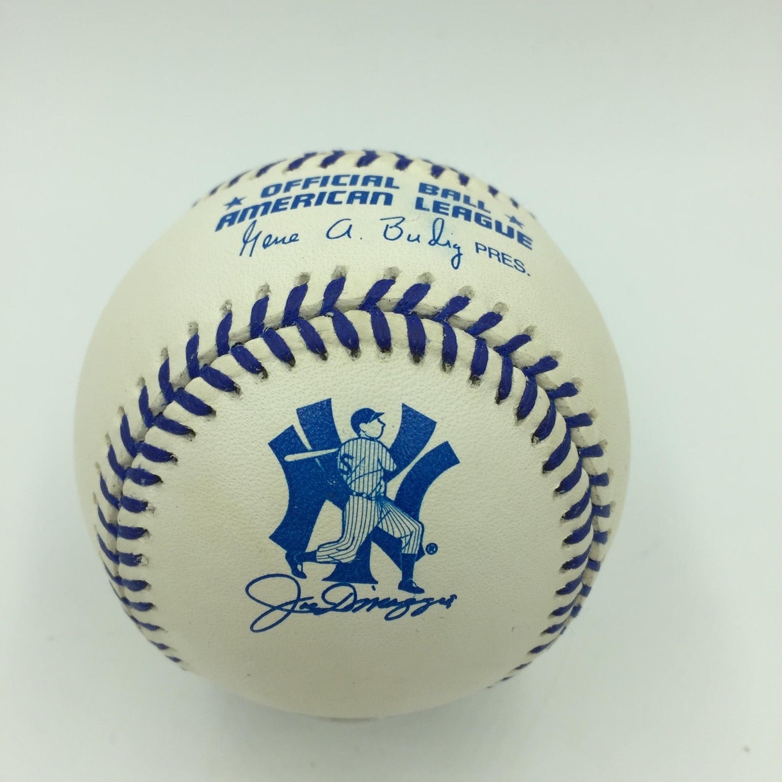 Presented here is an ultra-rare Joe DiMaggio signed “Deathbed” baseball. A short time before the Hall of Famer’s death in 1999, he signed 68 baseballs to be sold or distributed to family and friends. Of the 68, 56 were numbered. The final 12, unnumbered baseballs were given to friends and relatives of the Yankee Clipper. This baseball is one of those 12, and quite possibly one of the final balls ever signed by the legendary slugger. This Official American League Gene A. Budig baseball features a DiMaggio logo to the south of the stamped signature of the American League president. The stitching on this ball is Yankee blue. DiMaggio signed the sweet spot in black pen. His signature is shaky, and indicative of his failing health. This item is accompanied by a LOA from the family of DiMaggio. Additionally, this item comes with a LOA from Steve Grad of Beckett Authentication as well as a full letter COA from James Spence JSA.
