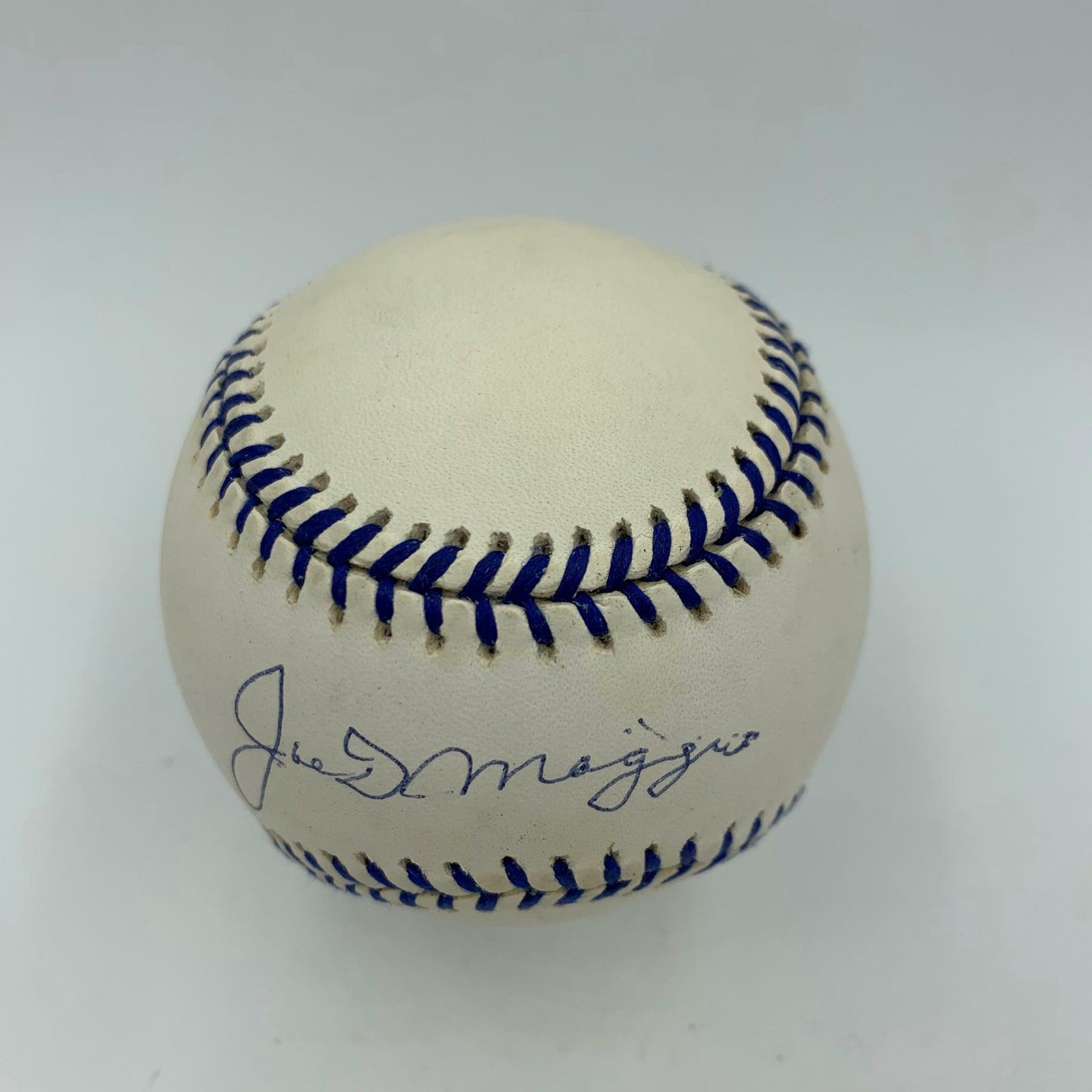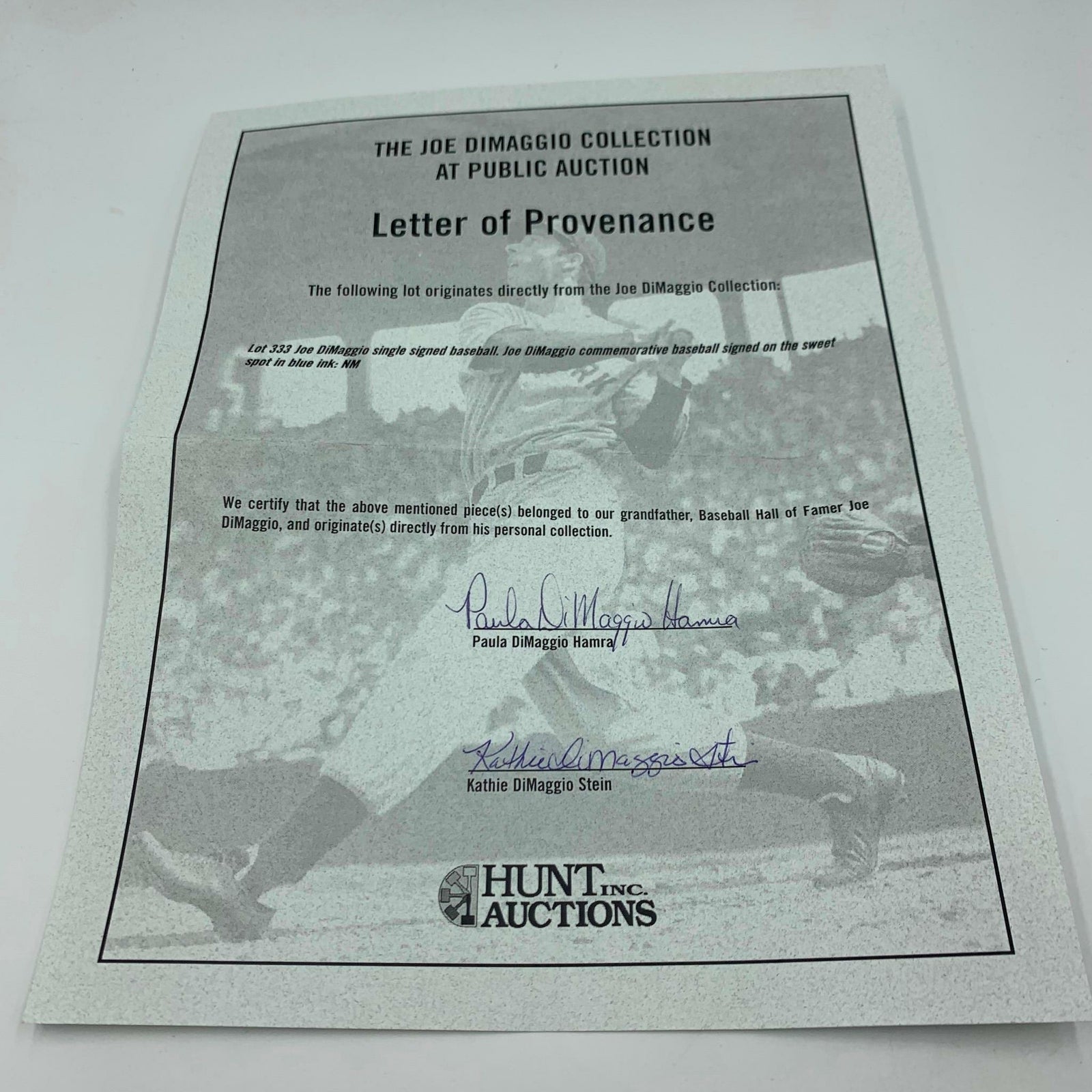 Presented here is an ultra-rare Joe DiMaggio signed “Deathbed” baseball. A short time before the Hall of Famer’s death in 1999, he signed 68 baseballs to be sold or distributed to family and friends. Of the 68, 56 were numbered. The final 12, unnumbered baseballs were given to friends and relatives of the Yankee Clipper. This baseball is one of those 12, and quite possibly one of the final balls ever signed by the legendary slugger. This Official American League Gene A. Budig baseball features a DiMaggio logo to the south of the stamped signature of the American League president. The stitching on this ball is Yankee blue. DiMaggio signed the sweet spot in black pen. His signature is shaky, and indicative of his failing health. This item is accompanied by a LOA from the family of DiMaggio. Additionally, this item comes with a full letter COA from James Spence JSA.
