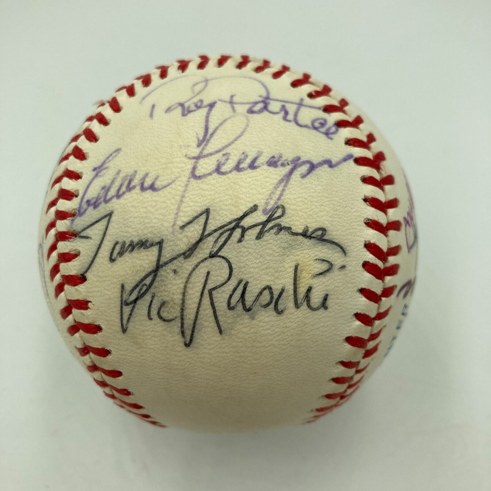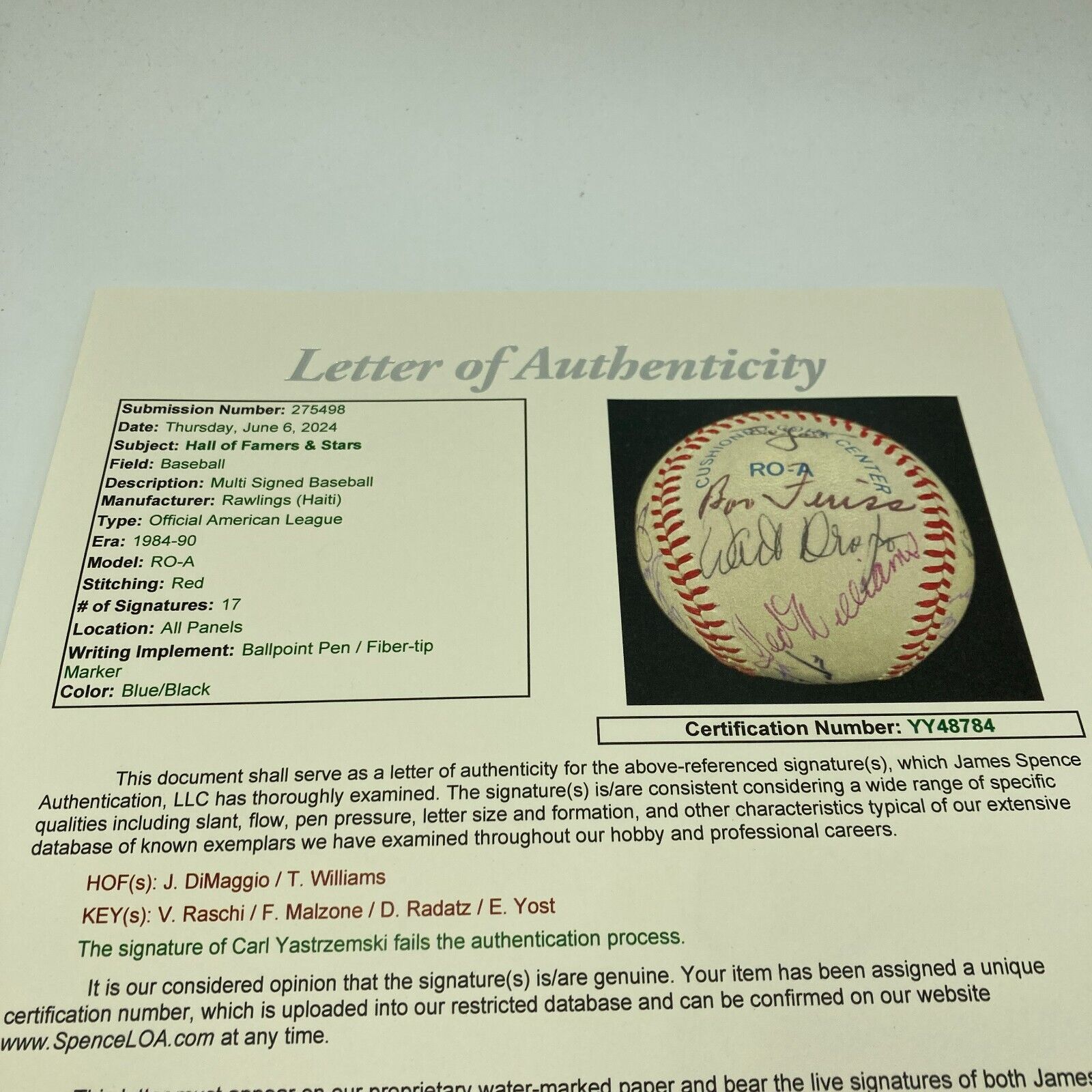 Signatures include both Ted Williams and Joe DiMaggio. Other signers include Frank Malzone, Vic Raschi, Boo Ferriss, Don Gutteridge, Ed Yost, and Walt Dropo. Carl Yastrzemski signature is clubhouse.