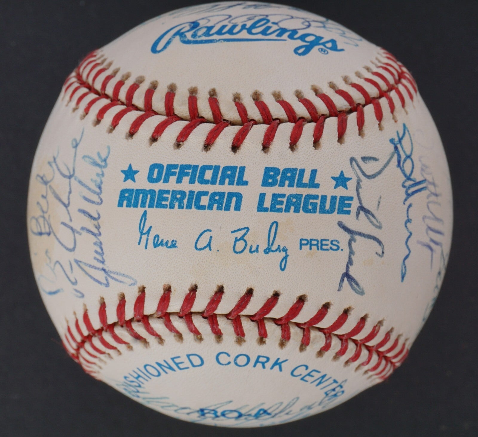 1995 Minnesota Twins team signed baseball. This official American League Bobby Brown baseball has been signed by 34 members of the 1995 Twins. Signatures include: Kirby Puckett, Tom Kelly, Kent Hrbek, Dave Winfield, Shane Mack, Brian Harper, Gene Larkin, Randy Bush, Scott Leius, Scott Erickson and Rick Aguilera among others. Accompanied by a full Beckett Letter of Authenticity.