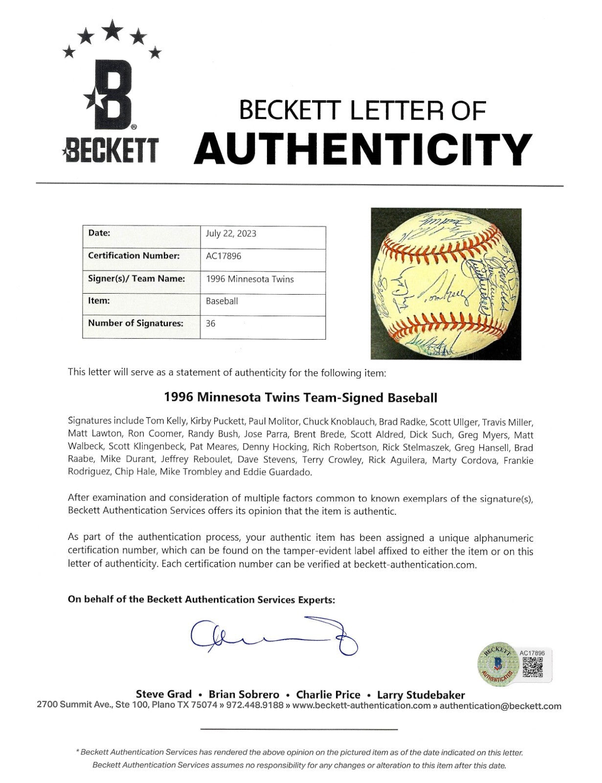 This official American League Baseball has been signed by 36 members of the 1996 Minnesota Twins baseball club. Key Signatures include: Kirby Puckett, Paul Molitor, Chuck Knoblauch, Tom Kelly. Beckett LOA